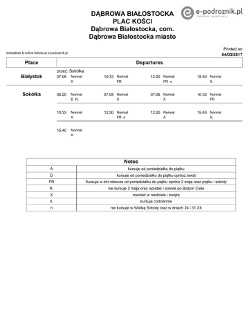 DĄBROWA BIAŁOSTOCKA PLAC KOŚCI Dąbrowa Białostocka, com. Dąbrowa Białostocka miasto Printed on 04/03/2017 timetables & online tickets at e-podroznik.pl Place Departures przez: Sokółka Białystok 07:05 Sokółka 05:20 10:33 15:40 Normal X 10:33 Normal Normal D R. 07:05 Normal Normal X 12:20 Normal 12:20 Normal FR 15:40 Normal FR n 07:05 Normal X X. 10:33 Normal X 12:20 Normal FR n FR 15:40 Normal A X. Normal X Notes A kursuje od poniedziałku do piątku D kursuje od poniedziałku do piątku oprócz świąt FR Kursuje w dni robocze od poniedziałku do piątku oprócz 2 maja oraz piątku i soboty R. nie kursuje 2 maja oraz wpiatek i sobote po Bożym Ciele X rownież w niedziele i święta X. kursuje codziennie n nie kursuje w Wielką Sobotę oraz w dniach 24 i 31.XII