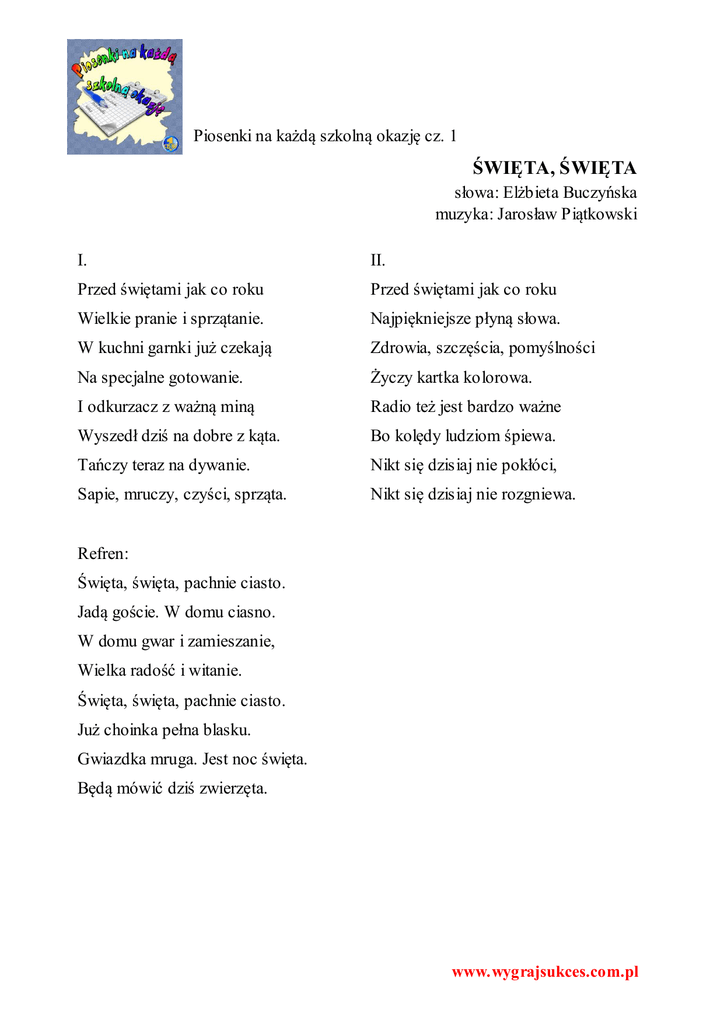 Piosenki na każdą szkolną okazję cz. 1 ŚWIĘTA, ŚWIĘTA słowa: Elżbieta Buczyńska muzyka: Jarosław Piątkowski I. II. Przed świętami jak co roku Przed świętami jak co roku Wielkie pranie i sprzątanie. Najpiękniejsze płyną słowa. W kuchni garnki już czekają Zdrowia, szczęścia, pomyślności Na specjalne gotowanie. Życzy kartka kolorowa. I odkurzacz z ważną miną Radio też jest bardzo ważne Wyszedł dziś na dobre z kąta. Bo kolędy ludziom śpiewa. Tańczy teraz na dywanie. Nikt się dzisiaj nie pokłóci, Sapie, mruczy, czyści, sprząta. Nikt się dzisiaj nie rozgniewa. Refren: Święta, święta, pachnie ciasto. Jadą goście. W domu ciasno. W domu gwar i zamieszanie, Wielka radość i witanie. Święta, święta, pachnie ciasto. Już choinka pełna blasku. Gwiazdka mruga. Jest noc święta. Będą mówić dziś zwierzęta. www.wygrajsukces.com.pl