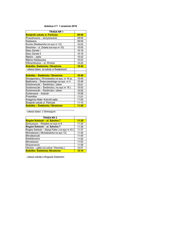 Autobus 2 T 1 września 2016 TRASA NR 1 Świątniki szkoła ul. Parkowa Przezdrowice – skrzyżowanie Nasławice Kunów (Nasławicka na wys nr 12) Strachów – ul. Zwarta (na wys nr 10) Stary Zamek I Stary Zamek II Ręków – pętla Ręków Nasławicka Olbrachtowice – ul. Wronia Sobótka -Świdnicka / Strzelców - odwozi dzieci ze szkoły w Świątnikach 09:50 09:55 09:59 10:03 10:05 10:18 10:19 10:22 10:23 10:25 10:40 Sobótka – Świdnicka / Strzelców Strzegomiany ( Wrocławska na wys. nr 16 a) Będkowice – Świerczewskiego na wys. nr 4 Sulistrowiczki – Świdnicka / zalew Sulistrowiczki – Świdnicka ( na wys nr 18 ) Sulistrowiczki – Świdnicka / zalew Sulistrowice - Kościół Przemiłów Księginice Małe- Kościół/ pętla Świątniki szkoła ul. Parkowa Sobótka – Świdnicka / Strzelców 10:40 10:45 10:48 10:51 10:53 10:55 10:58 11:01 11:05 11:10 11:20 - odwozi dzieci z Gimnazjum TRASA NR 2 Rogów Sobócki – ul. Szkolna 7 Żerzuszyce – Wiejska na wys nr 8 Rogów Sobócki – ul. Szkolna 7 Rogów Sobócki – Stacja Paliw ( na wys nr 43 ) Michałowice ( Michałowicka na wys 12) Mirosławiczki Siedlakowice Miroslawice Wojnarowice Okulice – pętla (ul.Leśna / Dworska ) Sobótka- Świdnicka /Strzelców - odwozi szkołę w Rogowie Sobóckim 11:30 11:33 11:36 11:37 11:40 11:45 11:50 11:53 11:58 12:01 12:15 AUTOBUS 4 T 1 września 2016 TRASA NR 1 Sobótka- Świdnicka szkoła Żerzuszyce – Wiejska na wys nr 8 Strachów – ul. Zwarta ( na wys nr 10 ) 10:30 10:38 10:41 Kunów ( Nasławicka na wys nr 12 ) 10:43 Przezdrowice Nasławice Ręków Pętla Stary Zamek II Stary Zamek II Ręków Pętla Ręków – Nasławicka Olbrachtowice Kryształowice Siedlakowice Miroslawice Mirosławiczki Sobótka- Świdnicka szkoła 10:46 10:51 10:56 11:01 11:03 11:06 11:08 11:11 11:14 11:16 11:19 11:21 11:36 - odwozi dzieci z Gimnazjum i Rękowa AUTOBUS 1 P 1 września 2016 TRASA NR 1 Sobótka -Świdnicka Strzelców Sobótka – Świdnicka / Sokola Sobótka Zach. - Świdnicka / Curie Sobótka Zach. Sobótka Zach. - d.k. Garncarsko – Nowowiejska ( na wys nr 42 ) Sobótka -Świdnicka szkoła 10:00 10:03 10:05 10:07 10:09 10:11 10:20 - odwozi dzieci z SP nr 2 TRASA NR 3 Sobótka -Świdnicka Strzelców Sobótka – Świdnicka / Sokola Sobótka Zach. - Świdnicka / Curie Sobótka Zach. Sobótka Zach. - d.k. Garncarsko – Nowowiejska ( na wys nr 42 ) Sobótka -Świdnicka szkoła - odwozi dzieci z Gimnazjum TRASA NR 4 Sobótka – Świdnicka / Strzelców Strzegomiany ( Wrocławska na wys. nr 16 a) Będkowice – Świerczewskiego na wys. nr 4 Sulistrowiczki – Świdnicka / zalew Sulistrowiczki – Świdnicka ( na wys nr 18 ) Sulistrowiczki – Świdnicka / zalew Sulistrowice - Kościół Sobótka -Świdnicka Strzelców - odwozi dzieci z SP1 10:30 10:33 10:35 10:37 10:39 10:41 10:50 11:30 11:35 11:38 11:41 11:44 11:46 11:49 11:54 Autobus 5 P 1 września 2016 TRASA NR 2 Sobótka- Świdnicka / Kabata Michałowice Stary Zamek I ( Centralna na wys nr 1) Stary Zamek II ( Centralna na wys nr 13) Ręków – pętla Ręków – Nasławicka Olbrachtowice Wronia na wys. nr 8 Kryształowice Siedlakowice Mirosławice Mirosławiczki Wojnarowice Okulice 10:30 10:43 10:47 10:48 10:51 10:52 10:56 10:59 11:01 11:04 11:06 11:11 11:13 - odwozi dzieci z Gimnazjum TRASA NR 2 Sobótka – Świdnicka / Kabata Michałowice Mirosławice Wojnarowice Okulice – pętla (ul.Leśna / Dworska ) Sobótka – Świdnicka / Strzelców - odwozi dzieci z SP1 11:30 11:40 11:44 11:48 11:53 12:15 AUTOBUS 3 P 1 września 2016 TRASA NR 2 Świątniki – szkoła ul. Parkowa Księgnice Małe Przemiłów Sulistrowice Będkowice Strzegomiany Sobótka- Świdnicka /Strzelców - Odwozi dzieci ze szkoły w Świątnikach 09:50 09:55 09:57 10:00 10:02 10:04 10:10 TRASA NR 2 Kurs 3 Sobótka -Świdnicka / Kabata Rogów Sobócki – Wrocławska na wys 107 Rogów Sobócki – Wrocławska na wys 65 Rogów Sobócki – ul. Szkolna 7 Rogów Sobócki – Wrocławska na wys 43 Rogów Sobócki – Wrocławska NŻ na wys. 3 10:30 10:35 10:37 10:39 10:41 10:43 Sobótka -Świdnicka / Strzelców 10:53 - odwozi dzieci z Gimnazjum oraz 1 ucznia z SP nr 1