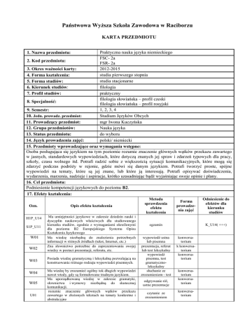 Państwowa Wyższa Szkoła Zawodowa w Raciborzu KARTA PRZEDMIOTU Praktyczna nauka języka niemieckiego FSC- 2a 2. Kod przedmiotu: FSR- 2a 2012-2015 3. Okres ważności karty: studia pierwszego stopnia 4. Forma kształcenia: studia stacjonarne 5. Forma studiów: 6. Kierunek studiów: filologia praktyczny 7. Profil studiów: filologia słowiańska – profil czeski 8. Specjalność: filologia słowiańska – profil rosyjski 1, 2, 3, 4 9. Semestr: Studium Języków Obcych 10. Jedn. prowadz. przedmiot: mgr Iwona Kuczyńska 11. Prowadzący przedmiot: 12. Grupa przedmiotów: Nauka języka do wyboru 13. Status przedmiotu: polski/ niemiecki 14. Język prowadzenia zajęć: 15. Przedmioty wprowadzające oraz wymagania wstępne: Osoba posługująca się językiem na tym poziomie rozumie znaczenie głównych wątków przekazu zawartego w jasnych, standardowych wypowiedziach, które dotyczą znanych jej spraw i zdarzeń typowych dla pracy, szkoły, czasu wolnego itd. Potrafi radzić sobie z większością sytuacji komunikacyjnych, które mogą się zdarzyć podczas podróży w rejonie, gdzie mówi się danym językiem. Potrafi tworzyć proste, spójne wypowiedzi na tematy, które są jej znane, lub które ją interesują. Potrafi opisywać doświadczenia, wydarzenia, marzenia, nadzieje i aspiracje, krótko uzasadniając bądź wyjaśniając swoje opinie i plany. 16. Cel przedmiotu: Podniesienie kompetencji językowych do poziomu B2. 17. Efekty kształcenia: 1. Nazwa przedmiotu: Ozn. Opis efektu kształcenia H1P_U14 Ma umiejętności językowe w zakresie dziedzin nauki i dyscyplin naukowych właściwych dla studiowanego kierunku studiów, zgodnie z wymaganiami określonymi dla poziomu B2 Europejskiego Systemu Opisu Kształcenia Językowego Ma wiedzę niezbędną do znalezienia potrzebnych informacji w różnych źródłach (tekst, Internet, etc.) Zna słownictwo potrzebne do zaprezentowania swojej wiedzy w postaci prezentacji, referatu, etc. S1P_U11 W01 W02 W03 W04 W05 U01 Posiada wiedzę gramatyczną i leksykalną pozwalającą na konstruowanie różnego rodzaju wypowiedzi pisemnych. Ma wiedzę by zrozumieć ogólny tok długich wypowiedzi nawet wtedy, gdy są formułowane trudnym językiem. Ma uporządkowaną wiedzę w zakresie gramatyki, słownictwa i wymowy niezbędną do skutecznej komunikacji. rozumie znaczenie głównych wątków przekazu zawartego w złożonych tekstach na tematy konkretne i abstrakcyjne Metoda sprawdzenia efektu kształcenia Forma prowadzenia zajęć egzamin wypowiedź ustna lub pisemna prezentacja, referat lub test leksykalny wypowiedź pisemna, test gramatycznoleksykalny słuchanie ze zrozumieniem - test odgrywanie ról, ustne prezentacje czytanie ze zrozumieniem Odniesienie do efektów dla kierunku studiów K_U14( +++) konwersatorium k konwersatorium konwersatorium konwersatorium konwersatorium konwersatorium U02 U03 U04 potrafi rozumieć wypowiedzi innych użytkowników języka, programy telewizyjne i audycje radiowe, filmy etc. potrafi formułować przejrzyste wypowiedzi pisemne (formalne i nieformalne) w szerokim zakresie tematów, a także wyjaśniać swoje stanowisko w sprawach będących przedmiotem dyskusji, rozważając wady i zalety różnych rozwiązań potrafi porozumiewać się na tyle płynnie i spontanicznie, by prowadzić normalną rozmowę na różne tematy z innym użytkownikiem danego języka, U05 potrafi stosować zasady i reguły gramatyczne języka obcego w akcie komunikacji U06 potrafi wykorzystać nabyte środki leksykalne w celu relacjonowania wydarzeń, udzielania i uzyskiwania informacji, negocjowania, wyrażania i uzasadniania swoich poglądów, propozycji, aprobaty i krytyki U07 potrafi samodzielnie zdobywać wiedzę i rozwijać swoje umiejętności językowe, korzystając z różnych źródeł w języku obcym i nowoczesnych technologii (Internet) K01 K02 słuchanie ze zrozumieniem wypowiedź pisemna na zadany temat. (wypracowanie, esej, list, notatka etc. ) odgrywanie ról w różnych kontekstach językowych (dialogi sytuacyjne) wypowiedź ustna i pisemna/test gramatyczny wypowiedź ustna i pisemna. prezentacja. test leksykalny przygotowanie i prezentacja samodzielnych projektów rozumie potrzebę uczenia się przez całe życie, potrafi uzupełniać i doskonalić nabytą wiedzę i umiejętności potrafi współdziałać i pracować w grupie, przyjmując w niej różne role 18. Formy i wymiar zajęć: 19. Treści kształcenia: I sem konwersatorium K_U01(+++) konwersatorium konwersatorium konwersatorium K_U13(+++) konwersatorium K_U02 (+) konwersatorium K_U05(++) konwersatorium konwersatorium K_K01(++) K_U11 (+++) K 30 h + 30 h + 30 h + 30 h Tematyka: pierwsze kontakty, Przedstawienie się z uwzględnieniem uczelni/wydziału Przedstawienie drugiej osoby, w restauracji / kawiarni, komunikacja na zajęciach, miasta – kraje – języki, kierunki geograficzne, nazywanie krajów i języków, ludzie, opis mieszkania, mebli, słownictwo i zwroty językowe typowe dla kierunku edukacja elementarna Gramatyka: zdania pytające, odmiana czasowników regularna, zaimki osobowe, przeczenie kein, czasownik „być” w czasie przeszłym,, zaimki dzierżawcze, pytania o rozstrzygnięcie, stosowanie przymiotników z zu II sem Tematyka: terminy, miesiące /dni tygodnia, godziny, czynności dnia codziennego, orientacja , opisem miejsca zamieszkania i pracy, środki lokomocji, droga na uczelnię / do pracy, zawody, przedstawienie poszczególnych zawodów, wizytówki, zwiedzanie Berlina, czytanie mapy, orientacja w nieznanym mieście, opis drogi, słownictwo i zwroty językowe typowe dla kierunku edukacja elementarna Gramatyka: czasowniki rozdzielnie złożone, czasownik „haben” w czasie przeszłym, przyimki rządzące celownikiem i biernikiem, liczebniki porządkowe, czasowniki modalne, zaimki dzierżawcze, przyimki „in, durch, uber+ biernik, zu, an..vorbei + celownik III sem Tematyka: wakacje, urlop, upodobania Polaków w odniesieniu do wakacji /urlopu, ul