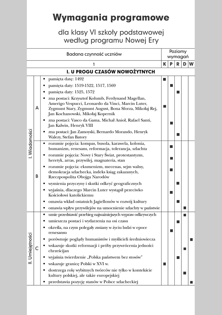 Wymagania programowe dla klasy VI szkoły podstawowej według programu Nowej Ery Badana czynność uczniów Poziomy wymagań 1 K P R D W I. U PROGU CZASÓW NOWOŻYTNYCH pamiêta datê: 1492 pamiêta daty: 1519-1522, 1517, 1569 pamiêta daty: 1525, 1572 A zna postaci: Krzysztof Kolumb, Ferdynand Magellan, Amerigo Vespucci, Leonardo da Vinci, Marcin Luter, Zygmunt Stary, Zygmunt August, Bona Sforza, Miko³aj Rej, Jan Kochanowski, Miko³aj Kopernik I. Wiadomości zna postaci: Vasco da Gama, Micha³ Anio³, Rafael Santi, Jan Kalwin, Henryk VIII zna postaci: Jan Zamoyski, Bernardo Morando, Henryk Walezy, Stefan Batory rozumie pojêcia: kompas, busola, karawela, kolonia, humanizm, renesans, reformacja, tolerancja, szlachta rozumie pojêcia: Nowy i Stary wiat, protestantyzm, heretyk, arras, przywilej, magnateria, stan B rozumie pojêcia: ekumenizm, mecenas, sejm walny, demokracja szlachecka, indeks ksi¹g zakazanych, Rzeczpospolita Obojga Narodów wymienia przyczyny i skutki odkryæ geograficznych wyjania, dlaczego Marcin Luter wyst¹pi³ przeciwko Kocio³owi katolickiemu omawia wk³ad ostatnich Jagiellonów w rozwój kultury omawia wp³yw przywilejów na umocnienie szlachty w pañstwie umie przedstawiæ przebieg najwa¿niejszych wypraw odkrywczych II. Umiejętności umieszcza postaci i wydarzenia na osi czasu okrela, na czym polega³y zmiany w ¿yciu ludzi w epoce renesansu porównuje pogl¹dy humanistów i mylicieli redniowiecza C wskazuje skutki reformacji i próby przywrócenia jednoci chrzecijan wyjania twierdzenie Polska pañstwem bez stosów wskazuje granicê Polski w XVI w. dostrzega rolê wybitnych twórców nie tylko w kontekcie kultury polskiej, ale tak¿e europejskiej przedstawia pozycjê stanów w Polsce szlacheckiej 1 C opowiada o roli regionu w Rzeczpospolitej w wymienionym okresie korzysta z ró¿norodnych róde³ historycznych II. BAROK PEŁEN KONTRASTÓW pamiêta daty: 1596, 1655-1660, 1683 pamiêta datê: 1605 pamiêta datê: 1648 zna postaci: Stefan Czarniecki, Jan III Sobieski A zna postaci: Galileusz, Newton, Jan Sebastian Bach, Stefan Batory zna postaci: Kartezjusz, przeor Augustyn Kordecki I. Wiadomości zna postaci: Stanis³aw ¯ó³kiewski, Jan Karol Chodkiewicz, Bohdan Chmielnicki rozumie pojêcie: barok rozumie pojêcia: opera, husaria, potop szwedzki rozumie pojêcia: piechota wybraniecka, odsiecz rozumie pojêcia: empiryzm, racjonalizm, pospolite ruszenie, sarmatyzm, ¿upan, kontusz wymienia przyczyny wojen z s¹siadami B omawia wp³yw wojen na sytuacjê polityczno-gospodarcz¹ Polski w XVII w. charakteryzuje wp³yw sztuki baroku na o¿ywienie uczuæ religijnych wyjania wp³yw odkryæ i wynalazków na poszerzenie wiedzy cz³owieka o wiecie wskazuje kontrasty ¿ycia codziennego doby baroku analizuje ród³a ikonograficzne i omawia cechy architektury i sztuki barokowej wskazuje zabytki barokowe w regionie II. Umiejętności porównuje i wskazuje ró¿nice w budowlach barokowych i renesansowych wskazuje na mapie pañstwa, z którymi prowadzilimy wojny w XVII w. wskazuje na mapie miejsca bitew C wskazuje na mapie i omawia zmiany granic Polski w wyniku wojen w XVII w. potrafi umieciæ na osi czasu daty najwa¿niejszych bitew w XVII w. potrafi opowiedzieæ o walkach, w czasie powstania Chmielnickiego i potopu szwedzkiego, zwi¹zanych z regionem potrafi rozpoznaæ strój szlachecki potrafi opisaæ strój szlachecki potrafi sporz¹dziæ biogram wybranego dowódcy polskiego z XVI-XVII w. K P R D W 1 III. MYŚLICIELE PROPONUJĄ ZMIANY pamiêta daty: 1772, 1793, 1795 pamiêta daty: 1788-1792, 1794 pamiêta daty: 4 lipca 1776, 14 lipca 1789 A zna postaci: Tadeusz Kociuszko, Stanis³aw August Poniatowski zna postaci: Monteskiusz, Stanis³aw Staszic, Hugo Ko³³¹taj, Stanis³aw Konarski, Tadeusz Rejtan, Katarzyna II zna postaci: Wolter, Mozart, Beethoven, Waszyngton, Jan Kiliñski, Bartosz G³owacki zna postaci: Kazimierz Pu³aski, Beniamin Franklin I. Wiadomości rozumie pojêcia: trójpodzia³ w³adzy, konstytucja, liberum veto rozumie pojêcia: Komisja Edukacji Narodowej, insurekcja, encyklopedyci, absolutyzm, kosynierzy rozumie pojêcia: owiecenie, rewolucja, p³odozmian omawia wp³yw odkryæ i wynalazków na poszerzenie wiedzy cz³owieka o wiecie wyjania, na czym opiera³ siê trójpodzia³ w³adzy Monteskiusza B omawia przyczyny i skutki rewolucji francuskiej omawia przyczyny i skutki wojen o niepodleg³oæ kolonii angielskich omawia rolê króla w rozwoju owiaty i kultury w XVIII w. w Polsce dostrzega istotê reform proponowanych przez twórców Konstytucji 3 maja dostrzega przyczyny wybuchu powstania kociuszkowskiego dostrzega przyczyny upadku Rzeczpospolitej potrafi wskazaæ na mapie Stany Zjednoczone i Francjê potrafi wskazaæ na mapie etapy rozbiorów Polski II. Umiejętności na podstawie ró¿nych róde³ informacji uzupe³nia wiedzê o wybitnych przedstawicielach epoki potrafi oceniæ wp³yw idei owiecenia na ustrój wspó³czesnych pañstw potrafi opowiedzieæ o obiadach czwartkowych, analizuj¹c tekst ród³owy C D potrafi dostrzec znaczenie konstytucji majowej dla pañstwa polskiego potrafi umieciæ na osi czasu najwa¿niejsze wydarzenia XVIII w. potrafi wskazaæ wk³ad Polaków w walce o niepodleg³oæ Stanów Zjednoczonych umie uporz¹dkowaæ wydarzenia z dziejów regionu i po³¹czyæ je z wydarzeniami z dziejów Polski i Europy K P R D W 1 IV. WIELKIE ZMIANY CYWILIZACYJNE XIX W. pamiêta datê: 1797 pamiêta daty: 29 listopada 1830, 1830-1831, 1863 pamiêta daty: 1807, 1809, 1848 pamiêta datê: 1846 A zna postaci: Henryk D¹browski, Józef Wybicki zna postaci: Maria Sk³odowska-Curie, Napoleon, ksi¹¿ê Józef Poniatowski, polscy twórcy kultury romantyzmu i okresu pozytywizmu zna postaci: Pasteur, Bell, Edison, Roentgen, Watt, Józef Bem, Drzyma³a rozumie pojêcia: fabryka, germanizacja, rusyfikacja, powstanie, Legiony Polskie I. Wiadomości rozumie pojêcia: rewolucja przemys³owa, uw³aszczenie, równouprawnienie, emigracja, zsy³ka rozumie pojêcia: