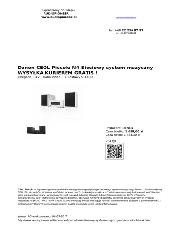Zapraszamy do sklepu AUDIOPIONEER www.audiopioneer.pl [email protected] tel. +48 22 256 87 97 tel. +48 697 865 383 Denon CEOL Piccolo N4 Sieciowy system muzyczny WYSYŁKA KURIEREM GRATIS ! kategoria: RTV ( Audio-Video ) > Zestawy STEREO Producent: DENON Cena brutto: 1 699,00 zł Cena netto: 1 381,30 zł Kod QR: CEOL Piccolo to najnowsza generacja wielokrotnie nagradzanego stylowego sieciowego systemu muzycznego Denon. Ultra kompaktowy CEOL Piccolo zmie?ci si? niemal wsz?dzie i zapewni dost?p do kolekcji muzyki za po?rednictwem domowej sieci Internet, wsz?dzie tam, gdzie jest przechowywana - w komputerze, NAS (Network Attached Storage), lub urz?dzeniu mobilnym. Dzi?ki w?asnemu zintegrowanemu Wi-Fi i kablowemu po??czeniu Ethernet, obs?uguje AirPlay® i bezstratny streaming plików muzycznych wysokiej rozdzielczo?ci (FLAC / WAV / AIFF / ALAC) z sieci domowej. Piccolo obs?uguje równie? strumieniowanie Bluetooth z parowaniem NFC i funkcjonalno?? Spotify® Connect zapewniaj?c? dost?p do muzyki on-line i radia internetowego. strona: 1/3 wydrukowano: 04-03-2017 http://www.audiopioneer.pl/denon-ceol-piccolo-n4-sieciowy-system-muzyczny-nowosc-sluchawki.html Port USB na przednim panelu pozwala na pod??czenie iPhone'a i iPod’a (z równoczesnym ?adowaniem baterii, nawet w trybie gotowo?ci) i odtwarzanie z pami?ci USB lub USB-HDD. Cyfrowe, optyczne i analogowe gniazda w panelu tylnym pozwalaj? pod??czy? telewizor cyfrowy i niemal ka?de inne urz?dzenie audio. Uznany wzmacniacz cyfrowy Denon dostarcza pot??ne 40 watów na kana? do zupe?nie nowych dwukierunkowych g?o?ników Hi-Fi, wytwarzaj?c wysokiej jako?ci, wype?niaj?cy pomieszczenie d?wi?k. Cechuj?ca si? minimalizmem stylistyka akrylowego panelu górnego z prze??cznikami sterowania pozwala na dogodne umieszczenie urz?dzenia na pó?ce lub stole. Pe?ne sterowanie systemem jest równie? mo?liwe za pomoc? dedykowanej aplikacji Hi-Fi Denon Remote App dla iOS i Android. Wej?cia: optyczne 2xRCA Wyj?cia: para z??cz g?o?nikowych wyj?cie subwooferowe 1xRCA Konstrukcja: 2-dro?na G?o?niki wysokotonowe: 1 x 2cm kopu?ka G?o?niki ?rednioniskotonowe: 1 x 10cm Bass-refleks: Ty? Podzia? pasma: 50 - 20.000Hz Skuteczno??: 83dB Moc ci?g?a (RMS): 40W Typ: Tranzystorowy Formaty z USB: AAC ALAC AIFF FLAC MP3 WAV Formaty z ethernet: WMA identyczne jak w przypadku USB Kontrola tonów: TAK Przedwzm. gramofonowy: NIE Pasmo przenoszenia: 50 - 20.000Hz Wi-Fi: TAK UPnP: NIE Bluetooth: TAK Dedykowana aplikacja: Android iOS (Apple iPhone/iPod/iPad) Gapless: TAK Radio internetowe: TAK Obs?ugiwane us?ugi muzyczne: Spotify Wej?cie USB DAC: NIE Wej?cie USB Apple iPhone/iPod: TAK Wej?cie USB (tryb pami?ci masowych): Apple iPhone/iPad/iPod Wej?cie optyczne: 1 Wej?cia 2xRCA liniowe: 1 Wyj?cie s?uchawkowe: 3.5mm mini jack Wej?cie Ethernet/LAN: TAK Trigger: NIE Inne z??cza: USB Wyj?cie subwooferowe: TAK pojedyncze apt-X: NIE Obs?ugiwane modele iPhone: iPhone 3 iPhone 3GS strona: 2/3 wydrukowano: 04-03-2017 http://www.audiopioneer.pl/denon-ceol-piccolo-n4-sieciowy-system-muzyczny-nowosc-sluchawki.html iPhone 4 iPhone 4S iPhone 5 iPhone 5s iPhone 5c Obs?ugiwane modele iPoda: Touch 2 Touch 3 Touch 4 Touch 5 Nano 3 Nano 4 Nano 5 Nano 6 Nano 7 Classic 1 Classic 2 Classic 3 Classic 4 Classic 5 INNE: Classic 6 obs?uga Airplay i Bluetooth :: wej?cie USB z przodu wzmacniacza :: 3 liniowy wy?wietlacz OELD o wysokim kontra?cie i szerokim widoku :: System 2-dro?nych g?o?ników z lokalnie dostrajanym d?wi?kiem :: Optymalizuj?cy filtr dla dostosowania DRA-N4 do charakterystyki systemu g?o?ników SC-N4 Pilot: TAK Wysoko??: wzmacniacz: 9cm g?o?niki: 18.5cm Szeroko??: wzmacniacz: 20cm g?o?niki: 13.4cm G??boko??: wzmacniacz: 30.5cm g?o?niki: 20cm Waga: 5.1kg Gwarancja: 24 miesi?ce strona: 3/3 wydrukowano: 04-03-2017 http://www.audiopioneer.pl/denon-ceol-piccolo-n4-sieciowy-system-muzyczny-nowosc-sluchawki.html