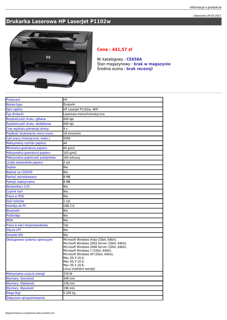 Informacje o produkcie Utworzono 04-03-2017 Drukarka Laserowa HP LaserJet P1102w Cena : 441,57 zł Nr katalogowy : CE658A Stan magazynowy : brak w magazynie Średnia ocena : brak recenzji Producent HP Nazwa typu Drukarki Opis ogólny HP LaserJet P1102w, WiFi Typ drukarki Laserowa monochromatyczna Rozdzielczość druku -główna 600 dpi Rozdzielczość druku -dodatkowa 600 dpi Czas wydruku pierwszej strony 9s Prędkość drukowania mono (max) 18 stron/min Cykl pracy (miesięcznie, maks.) 5000 Maksymalny rozmiar papieru A4 Minimalna gramatura papieru 60 g/m2 Maksymalna gramatura papieru 163 g/m2 Maksymalna pojemność podajników 160 arkuszy Liczba zasobników papieru 2 szt Duplex Nie Nadruk na CD/DVD Nie Pamięć zainstalowana 8 MB Pamięć maksymalna 8 MB Wyświetlacz LCD Nie Czytnik kart Nie Praca w DOS Nie Ilość kolorów 1 szt. Interfejs do PC USB 2.0 Bluetooth Nie Pictbridge Nie IRDA Nie Praca w sieci bezprzewodowej Tak Złącze LPT Nie Gniazdo EIO Nie Obsługiwane systemy operacyjne Microsoft Windows Vista (32bit, 64bit); Microsoft Windows 2003 Server (32bit, 64bit); Microsoft Windows 2008 Server (32bit, 64bit); Microsoft Windows 7 (32bit, 64bit); Microsoft Windows XP (32bit, 64bit); Mac OS X 10.4; Mac OS X 10.5; Mac OS X 10.6; Linux (niektóre wersje) Maksymalne zużycie energii 370 W Wymiary: Szerokość 349 mm Wymiary: Głębokość 238 mm Wymiary: Wysokość 196 mm Waga [kg] 5.200 kg Dołączone oprogramowanie Wygenerowano w programie www.oscGold.com Informacje dodatkowe Efektywna rozdzielczość wyjściowa 1200 dpi z technologią HP FastRes 1200; Podajnik na 150 ark. + podajnik szczelinowy z priorytetem na 10 ark.; WiFi 802.11 b/g Okres rękojmi (gwarancji) w miesiącach 12 Miejsce serwisowania Serwis Procopy