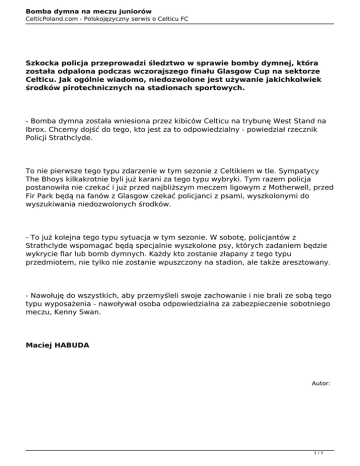 Bomba dymna na meczu juniorów CelticPoland.com - Polskojęzyczny serwis o Celticu FC Szkocka policja przeprowadzi śledztwo w sprawie bomby dymnej, która została odpalona podczas wczorajszego finału Glasgow Cup na sektorze Celticu. Jak ogólnie wiadomo, niedozwolone jest używanie jakichkolwiek środków pirotechnicznych na stadionach sportowych. - Bomba dymna została wniesiona przez kibiców Celticu na trybunę West Stand na Ibrox. Chcemy dojść do tego, kto jest za to odpowiedzialny - powiedział rzecznik Policji Strathclyde. To nie pierwsze tego typu zdarzenie w tym sezonie z Celtikiem w tle. Sympatycy The Bhoys kilkakrotnie byli już karani za tego typu wybryki. Tym razem policja postanowiła nie czekać i już przed najbliższym meczem ligowym z Motherwell, przed Fir Park będą na fanów z Glasgow czekać policjanci z psami, wyszkolonymi do wyszukiwania niedozwolonych środków. - To już kolejna tego typu sytuacja w tym sezonie. W sobotę, policjantów z Strathclyde wspomagać będą specjalnie wyszkolone psy, których zadaniem będzie wykrycie flar lub bomb dymnych. Każdy kto zostanie złapany z tego typu przedmiotem, nie tylko nie zostanie wpuszczony na stadion, ale także aresztowany. - Nawołuję do wszystkich, aby przemyśleli swoje zachowanie i nie brali ze sobą tego typu wyposażenia - nawoływał osoba odpowiedzialna za zabezpieczenie sobotniego meczu, Kenny Swan. Maciej HABUDA Autor: 1/1 Powered by TCPDF (www.tcpdf.org)