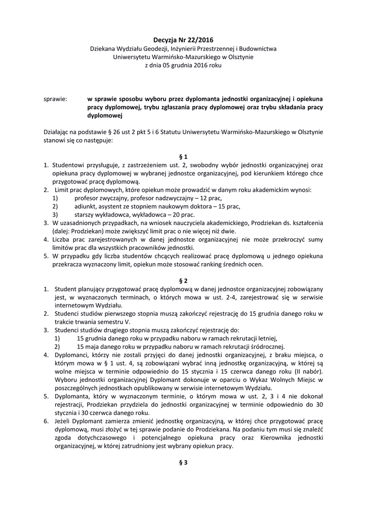 Decyzja Nr 22/2016 Dziekana Wydziału Geodezji, Inżynierii Przestrzennej i Budownictwa Uniwersytetu Warmińsko-Mazurskiego w Olsztynie z dnia 05 grudnia 2016 roku sprawie: w sprawie sposobu wyboru przez dyplomanta jednostki organizacyjnej i opiekuna pracy dyplomowej, trybu zgłaszania pracy dyplomowej oraz trybu składania pracy dyplomowej Działając na podstawie § 26 ust 2 pkt 5 i 6 Statutu Uniwersytetu Warmińsko-Mazurskiego w Olsztynie stanowi się co następuje: §1 1. Studentowi przysługuje, z zastrzeżeniem ust. 2, swobodny wybór jednostki organizacyjnej oraz opiekuna pracy dyplomowej w wybranej jednostce organizacyjnej, pod kierunkiem którego chce przygotować pracę dyplomową. 2. Limit prac dyplomowych, które opiekun może prowadzić w danym roku akademickim wynosi: 1) profesor zwyczajny, profesor nadzwyczajny – 12 prac, 2) adiunkt, asystent ze stopniem naukowym doktora – 15 prac, 3) starszy wykładowca, wykładowca – 20 prac. 3. W uzasadnionych przypadkach, na wniosek nauczyciela akademickiego, Prodziekan ds. kształcenia (dalej: Prodziekan) może zwiększyć limit prac o nie więcej niż dwie. 4. Liczba prac zarejestrowanych w danej jednostce organizacyjnej nie może przekroczyć sumy limitów prac dla wszystkich pracowników jednostki. 5. W przypadku gdy liczba studentów chcących realizować pracę dyplomową u jednego opiekuna przekracza wyznaczony limit, opiekun może stosować ranking średnich ocen. 1. 2. 3. 4. 5. 6. §2 Student planujący przygotować pracę dyplomową w danej jednostce organizacyjnej zobowiązany jest, w wyznaczonych terminach, o których mowa w ust. 2-4, zarejestrować się w serwisie internetowym Wydziału. Studenci studiów pierwszego stopnia muszą zakończyć rejestrację do 15 grudnia danego roku w trakcie trwania semestru V. Studenci studiów drugiego stopnia muszą zakończyć rejestrację do: 1) 15 grudnia danego roku w przypadku naboru w ramach rekrutacji letniej, 2) 15 maja danego roku w przypadku naboru w ramach rekrutacji śródrocznej. Dyplomanci, którzy nie zostali przyjęci do danej jednostki organizacyjnej, z braku miejsca, o którym mowa w § 1 ust. 4, są zobowiązani wybrać inną jednostkę organizacyjną, w której są wolne miejsca w terminie odpowiednio do 15 stycznia i 15 czerwca danego roku (II nabór). Wyboru jednostki organizacyjnej Dyplomant dokonuje w oparciu o Wykaz Wolnych Miejsc w poszczególnych jednostkach opublikowany w serwisie internetowym Wydziału. Dyplomanta, który w wyznaczonym terminie, o którym mowa w ust. 2, 3 i 4 nie dokonał rejestracji, Prodziekan przydziela do jednostki organizacyjnej w terminie odpowiednio do 30 stycznia i 30 czerwca danego roku. Jeżeli Dyplomant zamierza zmienić jednostkę organizacyjną, w której chce przygotować pracę dyplomową, musi złożyć w tej sprawie podanie do Prodziekana. Na podaniu tym musi się znaleźć zgoda dotychczasowego i potencjalnego opiekuna pracy oraz Kierownika jednostki organizacyjnej, w której zatrudniony jest wybrany opiekun pracy. §3 W trakcie rejestracji Dyplomant podaje średnią za ostatni rok akademicki z rankingu do stypendium Rektora, wygenerowaną w systemie USOS. 1. 2. 3. 4. 5. 6. 7. 8. §4 Zgłoszenia do danego opiekuna pracy realizowane są według zasad określonych w § 1. Student przydzielony do danej jednostki organizacyjnej chcący pisać pracę dyplomową pod kierunkiem opiekuna pracy jest zobowiązany: 1) Wypełnić formularz zgłoszenia pracy dyplomowej stanowiący załącznik nr 1 do niniejszej decyzji. Formularz w formie elektronicznej można pobrać ze strony internetowej Wydziału. 2) Zgłosić się do nauczyciela, który ma być opiekunem pracy i uzyskać jego aprobatę w zakresie: a) wyrażenia zgody na kierowanie pracą dyplomową, b) realizacji wybranego tematu pracy dyplomowej. Opiekun pracy wyraża aprobatę na formularzu zgłoszenia pracy dyplomowej. Aprobata może być zrealizowana z wykorzystaniem formy elektronicznej. 3) Zgłosić się do Koordynatora Prac Dyplomowych (dalej Koordynator) w jednostce, w której pracuje opiekun pracy w celu wpisania się na Listę Dyplomantów w danej jednostce organizacyjnej. Zgłoszenie u Koordynatora odbywa się poprzez dostarczenie formularza zgłoszenia pracy dyplomowej i może być zrealizowane z wykorzystaniem formy elektronicznej. Zgłoszenia pracy do Koordynatora, o którym mowa w ust. 2 pkt. 3 student musi dokonać: 1) studia pierwszego stopnia – przed zakończeniem semestru 6, 2) studia drugiego stopnia – przed zakończeniem semestru 2. Opiekun pracy nie może aprobować tematów prac dyplomowych innych, niż te, które zostały zaakceptowane przez Kierownika jednostki organizacyjnej oraz opublikowane w serwisie internetowym Wydziału. Aprobata innego tematu wymaga zgody Prodziekana oraz opublikowania w serwisie informacyjnym internetowym Wydziału. Opiekun pracy jest zobowiązany prowadzić Kartę Pracy Dyplomowej. Temat pracy dyplomowej zaakceptowany przez opiekuna pracy zapisany w formularzu zgłoszenia pracy dyplomowej nie podlega zmianie, z zastrzeżeniem ust. 6. W szczególnych przypadkach temat pracy dyplomowej może ulec zmianie. Zmianę tematu inicjuje opiekun pracy zgłaszając ten fakt Koordynatorowi w danej jednostce organizacyjnej. Zmiana tematu nie może być dokonana w terminach późniejszych, niż te, o których mowa w ust. 3. W przypadku, gdy miejsca u danego opiekuna są zajęte Koordynator odmawia wpisania na Listę Dyplomantów i proponuje innego opiekuna. W takiej sytuacji Dyplomant musi powtórzyć proces zgłaszania pracy u nowego opiekuna, zgodnie z ust. 2. Zaaprobowanie przez opiekuna pracy tematu innego niż temat pracy zapisany na formularzu zgłoszenia pracy dyplomowej, który został przekazany Koordynatorowi w danej jednostce organizacyjnej bez zgody Kierownika tej jednostki, powoduje stosowne konsekwencje służbowe. §5 Koordynator jest zobowiązany prowadzić Listę Dyplomantów wraz z zaakceptowanymi tematami prac dyplomo