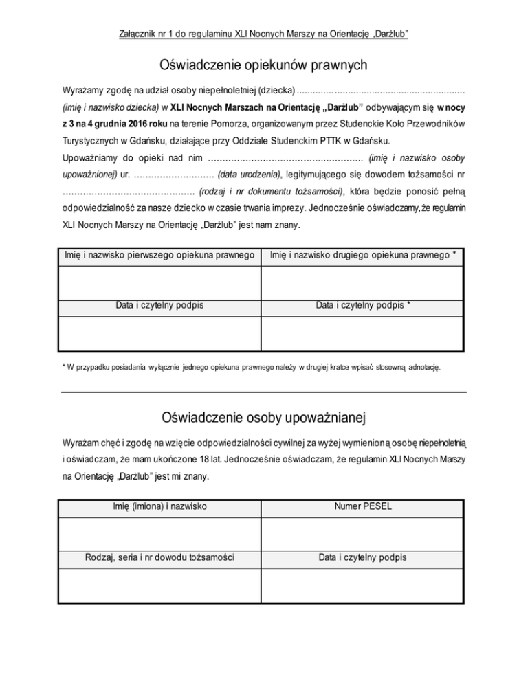 Załącznik nr 1 do regulaminu XLI Nocnych Marszy na Orientację „Darżlub” Oświadczenie opiekunów prawnych Wyrażamy zgodę na udział osoby niepełnoletniej (dziecka) .............. ................................................. (imię i nazwisko dziecka) w XLI Nocnych Marszach na Orientację „Darżlub” odbywającym się w nocy z 3 na 4 grudnia 2016 roku na terenie Pomorza, organizowanym przez Studenckie Koło Przewodników Turystycznych w Gdańsku, działające przy Oddziale Studenckim PTTK w Gdańsku. Upoważniamy do opieki nad nim …………………………………..…………. (imię i nazwisko osoby upoważnionej) ur. ………………………. (data urodzenia), legitymującego się dowodem tożsamości nr ………………………………………. (rodzaj i nr dokumentu tożsamości), która będzie ponosić pełną odpowiedzialność za nasze dziecko w czasie trwania imprezy. Jednocześnie oświadczamy, że regulamin XLI Nocnych Marszy na Orientację „Darżlub” jest nam znany. Imię i nazwisko pierwszego opiekuna prawnego Imię i nazwisko drugiego opiekuna prawnego * Data i czytelny podpis Data i czytelny podpis * * W przypadku posiadania wyłącznie jednego opiekuna prawnego należy w drugiej kratce wpisać stosowną adnotację. Oświadczenie osoby upoważnianej Wyrażam chęć i zgodę na wzięcie odpowiedzialności cywilnej za wyżej wymienioną osobę niepełnoletnią i oświadczam, że mam ukończone 18 lat. Jednocześnie oświadczam, że regulamin XLI Nocnych Marszy na Orientację „Darżlub” jest mi znany. Imię (imiona) i nazwisko Numer PESEL Rodzaj, seria i nr dowodu tożsamości Data i czytelny podpis