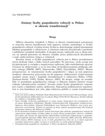Jan FAŁKOWSKI* Zmiany liczby gospodarstw rolnych w Polsce w okresie transformacji** Wstęp Oblicze obszarów wiejskich w Polsce w okresie transformacji systemowej w znacznej mierze kształtowane było poprzez zmiany zachodzące w liczbie gospodarstw rolnych. Z jednej strony, liczba ta, determinując stopień powiązania lokalnej gospodarki z rolnictwem, w istotnym zakresie decydowała o poziomie i stabilności wiejskich dochodów. Z drugiej strony, wpływała ona w dużej mierze na sposób patrzenia na obszary wiejskie przez politycznych decydentów i część społeczeństwa żyjącą w miastach. Kwestia zmian w liczbie gospodarstw rolnych jest w Polsce przedmiotem żywej dyskusji także z kilku innych powodów. Po pierwsze, wiele uwagi jest jej poświęcane w związku z negatywnym wpływem, jaki rozdrobnienie agrarne wywiera na efektywność, a co za tym idzie na konkurencyjność polskiego sektora rolnego [PROW, 2007], [Sosnowska, 2002], [Zawalińska, 2002]. Można przypuszczać, że zmniejszenie liczby gospodarstw i idąca za tym poprawa struktury obszarowej przyczynią się do poprawy efektywności wykorzystania zasobów ziemi, pracy i kapitału zatrudnionych w rolnictwie [Tolley, 1970], [Jackson-Smith, 1999], [Gołaś, Kozera, 2002]. Po drugie, mając na uwadze fakt, iż posiadanie gospodarstwa rolnego w dalszym stopniu stanowi swego rodzaju zabezpieczenie socjalne, kwestia zmian liczby gospodarstw wiązana jest często z aspektami natury społecznej. Najczęściej podnoszonym argumentem w tym kontekście jest rola, jaką rolnictwo pełniło w czasie transformacji * Autor jest pracownikiem Wydziału Nauk Ekonomicznych Uniwersytetu Warszawskiego, adres do korespondencji: [email protected], Długa 44/50, 00-241 Warszawa. Artykuł wpłynął do redakcji w listopadzie 2009 r. ** Autor chciałby serdecznie podziękować za cenne uwagi i komentarze do wcześniejszej wersji tekstu Aleksandrze Chlebickiej, Wandzie Chmielewskiej-Gill, Edmundowi Giejbowiczowi, Agnieszce Korycińskiej, Adamowi Poślednikowi oraz Tomaszowi Wołkowi, oraz trzem anonimowym recenzentom. Artykuł ten powstał na bazie raportu przygotowanego dla Fundacji Programów Pomocy dla Rolnictwa (FAPA). W tym kontekście konkurencyjność można postrzegać jako zdolność gospodarstwa rolnego do zapewnienia odpowiednio wysokiej opłaty za pracę własną producentów rolnych i członków ich rodzin, jak również do zapewnienia odpowiedniej rentowności ulokowanego w gospodarstwach kapitału [Józwiak, 2008]. Wielu autorów (m.in. [Józwiak, 2008], [Józwiak, Mirkowska, 2007], [Goraj, 2005]) wskazuje na to, iż małe gospodarstwa rolne nie są w stanie zapewnić uzyskania parytetowej opłaty za pracę w przeliczniu na osobę pełnozatrudnioną. Charakterystykę gospodarstw socjalnych w Polsce przedstawia Sikorska [2003]. 90 GOSPODARKA NARODOWA Nr 1-2/2010 jeśli chodzi o łagodzenie problemu wiejskiego bezrobocia [Woś, 2000], [Wilkin, 2007]. W efekcie, kwestia zmian w strukturze gospodarstw rolnych łączona jest z problemem ubóstwa na wsi [Szafraniec, 2002]. Po trzecie wreszcie, rosnąca popularność koncepcji wielofunkcyjności rolnictwa i obszarów wiejskich każe spojrzeć na kwestię zmian w liczbie gospodarstw rolnych także przez pryzmat roli, jaką rolnictwo pełni w procesie decydowania o tożsamości oraz charakterze zarówno lokalnych społeczności, jak i obszarów wiejskich ogółem. W tym kontekście, zmiany zachodzące w strukturze gospodarstw rolnych mogą być łączone z problemami wyludniania się obszarów wiejskich, kwestiami zachowania dziedzictwa przyrodniczego i kulturowego wsi czy też innymi funkcjami społecznymi pełnionymi przez rolnictwo [Józwiak, 2006], [Bukraba-Rylska, 2006], [Woś, 2005]. Mając na uwadze co powyżej, zasadne wydaje się postawić podstawowe pytania: które z czynników społeczno-ekonomicznych decydują o zmianach w liczbie gospodarstw rolnych w Polsce i jakie w związku z tym kroki może podjąć administracja rządowa (samorządy lokalne), aby zmiany te podążały we właściwym kierunku? Zważywszy na fakt, iż dotychczasowe opracowania podejmujące tę tematykę nie dostarczyły jasnej odpowiedzi na te pytania, poniższa praca ma za zadanie uzupełnić tę lukę. Tym samym ma ona za zadanie zidentyfikować czynniki, które mają decydujące znaczenie dla zmian dokonujących się w liczbie gospodarstw rolnych w Polsce. Analiza została przeprowadzona w oparciu o dane Głównego Urzędu Statystycznego. Część opisowa bazuje na danych zagregowanych dla całego kraju i przedstawia ogólne tendencje obrazujące zmiany w liczbie gospodarstw rolnych w Polsce w okresie transformacji. W części empirycznej natomiast wykorzystano dane zagregowane na poziomie powiatów, które zebrane zostały podczas spisów powszechnych przeprowadzonych w latach 1996 i 2002. Opracowanie składa się z sześciu części. Część druga przedstawia zwięzły opis zmian, które zaszły w otoczeniu rolnictwa w ostatnim dwudziestoleciu i w znacznym stopniu kształtowały bodźce oraz motywacje wpływające na decyzje rolników odnośnie ewentualnego kontynuowania/zaprzestania produkcji rolnej. Część trzecia prezentuje analizę opisową zmian, jakie dokonały się w liczbie gospodarstw rolnych w Polsce w okresie transformacji systemowej. Zawiera ona również omówienie podstawowych czynników, które mogły przyczynić się do takiego, a nie innego kształtu tych przemian. Część czwarta opisuje dane i zmienne wykorzystane w analizie empirycznej. Część piąta prezentuje uzyskane wyniki natomiast część szósta zawiera krótkie zakończenie. Inną ilustracją tej kwestii może być dodatnia zależność między powierzchnią gospodarstwa a poziomem dochodu rozporządzalnego na osobę [Leszczyńska, 2004], [Zegar, 2000]. Na „dramatycznie dużą niewydolność dochodową” w związku z rozdrobnioną strukturą agrarną zwraca uwagę również Goraj [2005]. Jan Fałkowski, Zmiany li