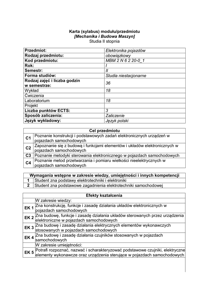 Karta (sylabus) modułu/przedmiotu [Mechanika i Budowa Maszyn] Studia II stopnia Przedmiot: Rodzaj przedmiotu: Kod przedmiotu: Rok: Semestr: Forma studiów: Rodzaj zajęć i liczba godzin w semestrze: Wykład Ćwiczenia Laboratorium Projekt Liczba punktów ECTS: Sposób zaliczenia: Język wykładowy: C1 C2 C3 C4 Elektronika pojazdów obowiązkowy MBM 2 N 6 2 20-0_1 I II Studia niestacjonarne 36 18 18 3 Zaliczenie Język polski Cel przedmiotu Poznanie konstrukcji i podstawowych zadań elektronicznych urządzeń w pojazdach samochodowych Zapoznanie się z budową i funkcjami elementów i układów elektronicznych w pojazdach samochodowych Poznanie metodyki sterowania elektronicznego w pojazdach samochodowych Poznanie metod przetwarzania i pomiaru wielkości nieelektrycznych w pojazdach samochodowych Wymagania wstępne w zakresie wiedzy, umiejętności i innych kompetencji 1 Student zna podstawy elektrotechniki i elektroniki 2 Student zna podstawowe zagadnienia elektrotechniki samochodowej EK 1 EK 2 EK 3 EK 4 EK 5 Efekty kształcenia W zakresie wiedzy: Zna konstrukcję, funkcje i zasadę działania układów elektronicznych w pojazdach samochodowych Zna budowę, funkcje i zasadę działania układów sterowanych przez urządzenia elektroniczne w pojazdach samochodowych Zna budowę i zasadę działania elektrycznych elementów wykonawczych stosowanych w pojazdach samochodowych Zna budowę i zasadę działania czujników stosowanych w pojazdach samochodowych W zakresie umiejętności: Potrafi rozpoznać, nazwać i scharakteryzować podstawowe czujniki, elektryczne elementy wykonawcze oraz urządzenia sterujące w pojazdach samochodowych W1 W2 W3 W4 W5 W6 W7 W8 W9 W10 W11 W12 W13 L1 L2 L3 L4 L5 L6 L7 L8 L9 1 2 3 4 5 Treści programowe przedmiotu Forma zajęć – wykłady Treści programowe Podstawy sterowania elektronicznego w pojazdach samochodowych Przetwarzanie i pomiar wielkości nieelektrycznych Czujniki stosowane w pojazdach samochodowych Elektryczne elementy wykonawcze w pojazdach samochodowych Elektroniczne urządzenia sterujące stosowane w pojazdach samochodowych– budowa, funkcje, zasada działania, diagnostyka Przegląd układów sterowanych elektronicznie w pojazdach samochodowych Układ zasilania elektrycznego – budowa, funkcje i sterowanie Układ zasilania paliwem i powietrzem – rodzaje, budowa, funkcje i sterowanie Układ rozruchu – budowa, funkcje i sterowanie Układ zapłonowy – rodzaje, budowa, funkcje i sterowanie Układ oświetlenia – rodzaje, budowa, funkcje i sterowanie Układy bezpieczeństwa i komfortu jazdy – rodzaje, budowa, funkcje i sterowanie Tendencje rozwojowe w układach sterowania elektronicznego stosowanych w pojazdach samochodowych Forma zajęć – laboratoria Treści programowe Badanie czujników stosowanych w pojazdach samochodowych Badanie elektrycznych elementów wykonawczych stosowanych w pojazdach samochodowych Badanie elektronicznych urządzeń sterujących stosowanych w pojazdach samochodowych Badanie podstawowych układów sterowanych elektronicznie w pojazdach samochodowych Badanie ektronicznych układów sterujących wtryskiem benzyny. Układy: KJetronic, D-Jetronic, L-Jetronic, Motronic, Mono-Jetronic, Mono-Motronic, Mitsubishi ECI, Renix, Digifant, GM Multec Badanie elektronicznych układów EDC i Common Rail Badanie wybranych układów bezpieczeństwa w pojazdach samochodowych Badanie wybranych układów komfortu jazdy sterowanych elektronicznie w pojazdach samochodowych Diagnozowanie elektronicznych układów w pojazdach samochodowych Metody dydaktyczne Wykład z prezentacją multimedialną Łączenie obwodów elektrycznych na podstawie schematu i bez schematu Wykonywanie pomiarów wielkości elektrycznych i nieelektrycznych różnymi przyrządami Oględziny elementów elektrycznych i elektronicznych stosowanych w układach sterujących i sterowanych elektronicznie pod kątem poznania budowy i funkcji oraz uszkodzeń i stopnia zużycia eksploatacyjnego Dyskusja przed wykonaniem ćwiczenia laboratoryjnego (omówienie programu badań, wyjaśnienie zjawisk fizycznych i ustalenie strategii wykonania ćwiczenia) 6 Dyskusja po wykonaniu ćwiczenia laboratoryjnego (analiza przeprowadzonych doświadczeń, popełnionych błędów oraz propozycje zmian w metodyce wykonania badań) Obciążenie pracą studenta Średnia liczba godzin na zrealizowanie Forma aktywności aktywności Godziny kontaktowe z wykładowcą, 39 w tym: Udział w wykładach 18 Udział w laboratoriach 18 Konsultacje 3 Praca własna studenta, w tym: 36 Przygotowanie się do kolokwium 10 wykładowego Przygotowanie prezentacji multimedialnej 3 Przygotowanie się do laboratorium 10 Wykonanie sprawozdań z ćwiczeń 5 laboratoryjnych Wykonanie pracy praktycznej 3 Zapoznanie się z literaturą 5 Łączny czas pracy studenta 75 Sumaryczna liczba punktów ECTS dla 3 przedmiotu: Liczba punktów ECTS w ramach zajęć o charakterze praktycznym (ćwiczenia, 2 laboratoria, projekty) 1 2 3 4 1 2 3 Literatura podstawowa Dziubiński M.: Elektroniczne układy pojazdów samochodowych, Wydawnictwo Naukowe Gabriel Borowski, Lublin 2004 Tylicki H., Żółtowski B.: Urządzenia elektryczne pojazdów samochodowych, Wydawnictwo Państwowej Wyższej Szkoły Zawodowej im. Stanisława Staszica, Piła 2011 Dziubiński M.: Badania elektronicznych urządzeń pojazdów samochodowych, Wydawnictwo Naukowe Gabriel Borowski, Lublin 2004 Instrukcje do ćwiczeń laboratoryjnych Literatura uzupełniająca Sterowanie silników o zapłonie iskrowym : zasada działania, podzespoły ( tł. z jęz. niem. Wituszyński K., Łęgiewicz J.), seria Informatory Techniczne Bosch, Wydawnictwa Komunikacji i Łączności, Warszawa 2008 Czujniki w pojazdach samochodowych ( tł. z jęz. niem. Brzeżański M., Juda Z.), seria Informatory Techniczne Bosch, Wydawnictwa Komunikacji i Łączności, Warszawa 2009 Układy bezpieczeństwa i komfortu jazdy : elektrotechnika i elektronika samochodowa ( tł. z jęz. niem. Polkowski S.)