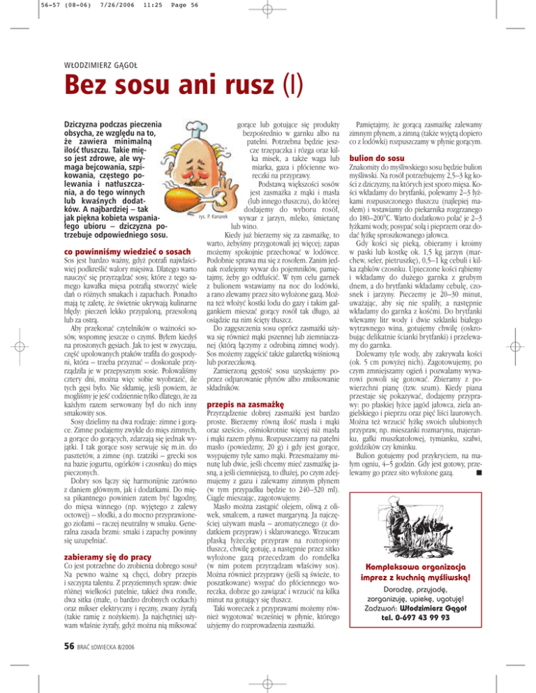 56-57 (08-06) 7/26/2006 11:25 Page 56 W¸ODZIMIERZ GÑGO¸ Bez sosu ani rusz (I) Dziczyzna podczas pieczenia obsycha, ze wzgl´du na to, ˝e zawiera minimalnà iloÊç t∏uszczu. Takie mi´so jest zdrowe, ale wymaga bejcowania, szpikowania, cz´stego polewania i nat∏uszczania, a do tego winnych lub kwaÊnych dodatków. A najbardziej – tak jak pi´kna kobieta wspania∏ego ubioru – dziczyzna potrzebuje odpowiedniego sosu. goràce lub gotujàce si´ produkty bezpoÊrednio w garnku albo na patelni. Potrzebna b´dzie jeszcze trzepaczka i rózga oraz kilka misek, a tak˝e waga lub miarka, gaza i p∏ócienne woreczki na przyprawy. Podstawà wi´kszoÊci sosów jest zasma˝ka z màki i mas∏a (lub innego t∏uszczu), do której dodajemy do wyboru rosó∏, rys. P. Kanarek wywar z jarzyn, mleko, Êmietan´ lub wino. Kiedy ju˝ bierzemy si´ za zasma˝k´, to warto, ˝ebyÊmy przygotowali jej wi´cej; zapas co powinniÊmy wiedzieç o sosach mo˝emy spokojnie przechowaç w lodówce. Sos jest bardzo wa˝ny, gdy˝ potrafi najw∏aÊci- Podobnie sprawa ma si´ z roso∏em. Zanim jedwiej podkreÊliç walory mi´siwa. Dlatego warto nak rozlejemy wywar do pojemników, pami´nauczyç si´ przyrzàdzaç sosy, które z tego sa- tajmy, ˝eby go odt∏uÊciç. W tym celu garnek mego kawa∏ka mi´sa potrafià stworzyç wiele z bulionem wstawiamy na noc do lodówki, daƒ o ró˝nych smakach i zapachach. Ponadto a rano zlewamy przez sito wy∏o˝one gazà. Mo˝majà t´ zalet´, ˝e Êwietnie ukrywajà kulinarne na te˝ w∏o˝yç kostki lodu do gazy i takim ga∏b∏´dy: pieczeƒ lekko przypalonà, przesolonà gankiem mieszaç goràcy rosó∏ tak d∏ugo, a˝ lub za ostrà. osiàdzie na nim Êci´ty t∏uszcz. Aby przekonaç czytelników o wa˝noÊci soDo zag´szczenia sosu oprócz zasma˝ki u˝ysów, wspomn´ jeszcze o czymÊ. By∏em kiedyÊ wa si´ równie˝ màki pszennej lub ziemniaczana proszonych g´siach. Jak to jest w zwyczaju, nej (którà ∏àczymy z odrobinà zimnej wody). cz´Êç upolowanych ptaków trafi∏a do gospody- Sos mo˝emy zag´Êciç tak˝e galaretkà wiÊniowà ni, która – trzeba przyznaç – doskonale przy- lub porzeczkowà. rzàdzi∏a je w przepysznym sosie. PolowaliÊmy Zamierzonà g´stoÊç sosu uzyskujemy pocztery dni, mo˝na wi´c sobie wyobraziç, ile przez odparowanie p∏ynów albo zmiksowanie tych g´si by∏o. Nie sk∏ami´, jeÊli powiem, ˝e sk∏adników. mogliÊmy je jeÊç codziennie tylko dlatego, ˝e za ka˝dym razem serwowany by∏ do nich inny przepis na zasma˝k´ Przyrzàdzenie dobrej zasma˝ki jest bardzo smakowity sos. Sosy dzielimy na dwa rodzaje: zimne i gorà- proste. Bierzemy równà iloÊç mas∏a i màki ce. Zimne podajemy zwykle do mi´s zimnych, oraz szeÊcio-, oÊmiokrotnie wi´cej ni˝ mas∏a a goràce do goràcych, zdarzajà si´ jednak wy- i màki razem p∏ynu. Rozpuszczamy na patelni jàtki. I tak goràce sosy serwuje si´ m.in. do mas∏o (powiedzmy, 20 g) i gdy jest goràce, pasztetów, a zimne (np. tzatziki – grecki sos wsypujemy tyle samo màki. Przesma˝amy mina bazie jogurtu, ogórków i czosnku) do mi´s nut´ lub dwie, jeÊli chcemy mieç zasma˝k´ jasnà, a jeÊli ciemniejszà, to d∏u˝ej, po czym zdejpieczonych. Dobry sos ∏àczy si´ harmonijnie zarówno mujemy z gazu i zalewamy zimnym p∏ynem z daniem g∏ównym, jak i dodatkami. Do mi´- (w tym przypadku b´dzie to 240–320 ml). sa pikantnego powinien zatem byç ∏agodny, Ciàgle mieszajàc, zagotowujemy. Mas∏o mo˝na zastàpiç olejem, oliwà z olido mi´sa winnego (np. wyj´tego z zalewy octowej) – s∏odki, a do mocno przyprawione- wek, smalcem, a nawet margarynà. Ja najcz´go zio∏ami – raczej neutralny w smaku. Gene- Êciej u˝ywam mas∏a – aromatycznego (z doralna zasada brzmi: smaki i zapachy powinny datkiem przypraw) i sklarowanego. Wrzucam p∏askà ∏y˝eczk´ przypraw na roztopiony si´ uzupe∏niaç. t∏uszcz, chwil´ gotuj´, a nast´pnie przez sitko zabieramy si´ do pracy wy∏o˝one gazà przecedzam do rondelka Co jest potrzebne do zrobienia dobrego sosu? (w nim potem przyrzàdzam w∏aÊciwy sos). Na pewno wa˝ne sà ch´ci, dobry przepis Mo˝na równie˝ przyprawy (jeÊli sà Êwie˝e, to i szczypta talentu. Z przyziemnych spraw: dwie poszatkowane) wsypaç do p∏óciennego woró˝nej wielkoÊci patelnie, takie˝ dwa rondle, reczka, dobrze go zawiàzaç i wrzuciç na kilka dwa sitka (ma∏e, o bardzo drobnych oczkach) minut na gotujàcy si´ t∏uszcz. oraz mikser elektryczny i r´czny, zwany ˝yrafà Taki woreczek z przyprawami mo˝emy rów(takie rami´ z no˝ykiem). Ja najch´tniej u˝y- nie˝ wygotowaç wczeÊniej w p∏ynie, którego wam w∏aÊnie ˝yrafy, gdy˝ mo˝na nià miksowaç u˝yjemy do rozprowadzenia zasma˝ki. 56 BRAå ¸OWIECKA 8/2006 Pami´tajmy, ˝e goràcà zasma˝k´ zalewamy zimnym p∏ynem, a zimnà (tak˝e wyj´tà dopiero co z lodówki) rozpuszczamy w p∏ynie goràcym. bulion do sosu Znakomity do myÊliwskiego sosu b´dzie bulion myÊliwski. Na rosó∏ potrzebujemy 2,5–3 kg koÊci z dziczyzny, na których jest sporo mi´sa. KoÊci wk∏adamy do brytfanki, polewamy 2–3 ∏y˝kami rozpuszczonego t∏uszczu (najlepiej mas∏em) i wstawiamy do piekarnika rozgrzanego do 180–200°C. Warto dodatkowo polaç je 2–3 ∏y˝kami wody, posypaç solà i pieprzem oraz dodaç ∏y˝k´ sproszkowanego ja∏owca. Gdy koÊci si´ piekà, obieramy i kroimy w paski lub kostk´ ok. 1,5 kg jarzyn (marchew, seler, pietruszk´), 0,5–1 kg cebuli i kilka zàbków czosnku. Upieczone koÊci ràbiemy i wk∏adamy do du˝ego garnka z grubym dnem, a do brytfanki wk∏adamy cebul´, czosnek i jarzyny. Pieczemy je 20–30 minut, uwa˝ajàc, aby si´ nie spali∏y, a nast´pnie wk∏adamy do garnka z koÊçmi. Do brytfanki wlewamy litr wody i dwie szklanki bia∏ego wytrawnego wina, gotujemy chwil´ (oskrobujàc delikatnie Êcianki brytfanki) i przelewamy do garnka. Dolewamy tyle wody, aby zakrywa∏a koÊci (ok. 5 cm pow