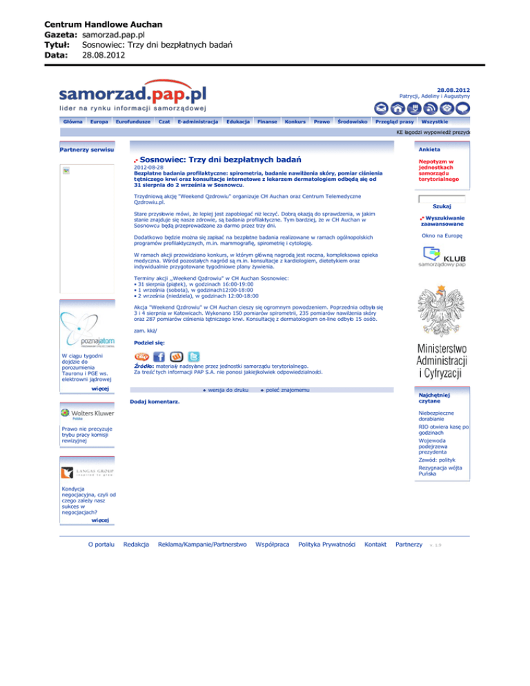 Centrum Handlowe Auchan Gazeta: samorzad.pap.pl Tytu³: Sosnowiec: Trzy dni bezp³atnych badañ Data: 28.08.2012 28.08.2012 Patrycji, Adeliny i Augustyny Główna Europa Eurofundusze Czat E-administracja Edukacja Finanse Konkurs Prawo Środowisko Przegląd prasy Wszystkie KE łagodzi wypowiedź prezydenta Francji o ewentualn Ankieta Partnerzy serwisu Sosnowiec: Trzy dni bezpłatnych badań 2012-08-28 Bezpłatne badania profilaktyczne: spirometria, badanie nawilżenia skóry, pomiar ciśnienia tętniczego krwi oraz konsultacje internetowe z lekarzem dermatologiem odbędą się od 31 sierpnia do 2 września w Sosnowcu. Trzydniową akcję "Weekend Qzdrowiu" organizuje CH Auchan oraz Centrum Telemedyczne Qzdrowiu.pl. Stare przysłowie mówi, że lepiej jest zapobiegać niż leczyć. Dobrą okazją do sprawdzenia, w jakim stanie znajduje się nasze zdrowie, są badania profilaktyczne. Tym bardziej, że w CH Auchan w Sosnowcu będą przeprowadzane za darmo przez trzy dni. Dodatkowo będzie można się zapisać na bezpłatne badania realizowane w ramach ogólnopolskich programów profilaktycznych, m.in. mammografię, spirometrię i cytologię. Nepotyzm w jednostkach samorządu terytorialnego Szukaj Wyszukiwanie zaawansowane Okno na Europę W ramach akcji przewidziano konkurs, w którym główną nagrodą jest roczna, kompleksowa opieka medyczna. Wśród pozostałych nagród są m.in. konsultacje z kardiologiem, dietetykiem oraz indywidualnie przygotowane tygodniowe plany żywienia. Terminy akcji ,,Weekend Qzdrowiu" w CH Auchan Sosnowiec: • 31 sierpnia (piątek), w godzinach 16:00-19:00 • 1 września (sobota), w godzinach12:00-18:00 • 2 września (niedziela), w godzinach 12:00-18:00 Akcja "Weekend Qzdrowiu" w CH Auchan cieszy się ogromnym powodzeniem. Poprzednia odbyła się 3 i 4 sierpnia w Katowicach. Wykonano 150 pomiarów spirometrii, 235 pomiarów nawilżenia skóry oraz 287 pomiarów ciśnienia tętniczego krwi. Konsultację z dermatologiem on-line odbyło 15 osób. zam. kkż/ Podziel się: W ciągu tygodni dojdzie do porozumienia Tauronu i PGE ws. elektrowni jądrowej Źródło: materiały nadsyłane przez jednostki samorządu terytorialnego. Za treść tych informacji PAP S.A. nie ponosi jakiejkolwiek odpowiedzialności. więcej wersja do druku Dodaj komentarz. poleć znajomemu Najchętniej czytane Niebezpieczne dorabianie Prawo nie precyzuje trybu pracy komisji rewizyjnej RIO otwiera kasę po godzinach Wojewoda podejrzewa prezydenta Zawód: polityk Rezygnacja wójta Puńska Kondycja negocjacyjna, czyli od czego zależy nasz sukces w negocjacjach? więcej O portalu Redakcja Reklama/Kampanie/Partnerstwo Współpraca Polityka Prywatności Kontakt Partnerzy v. 1.9