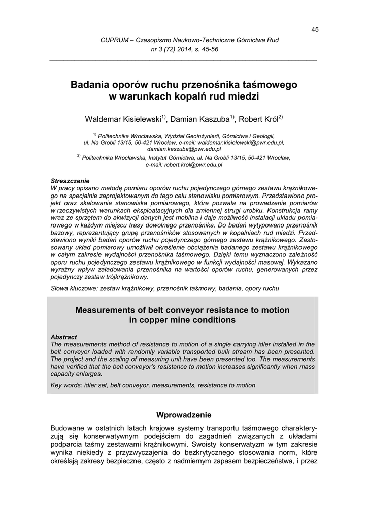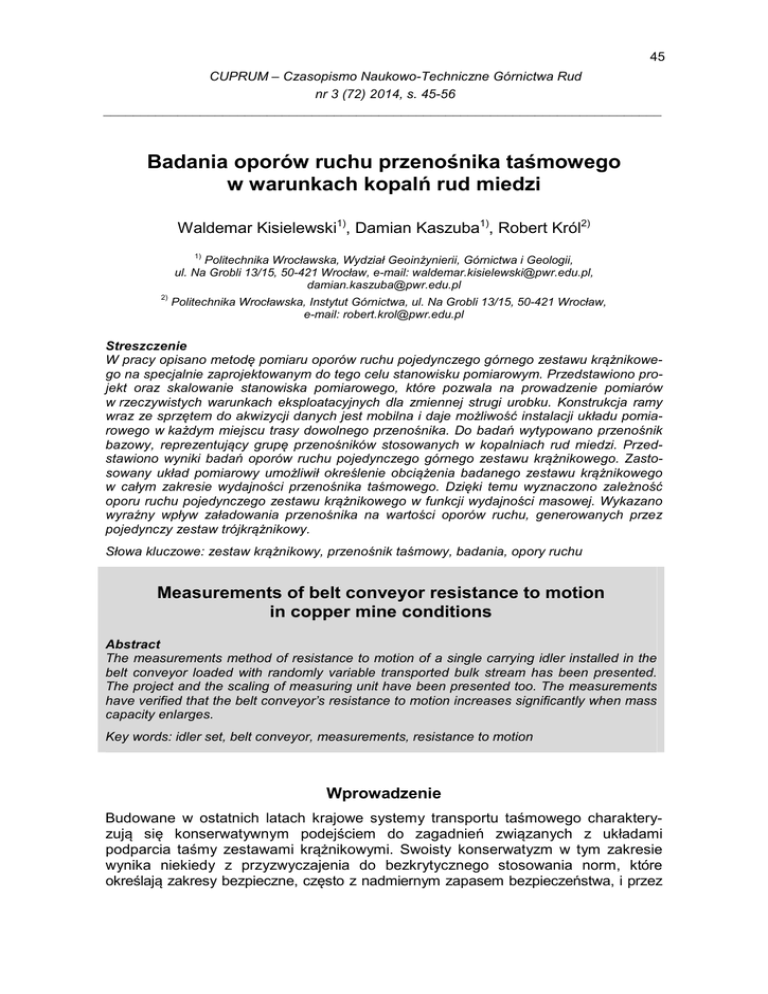 45 CUPRUM – Czasopismo Naukowo-Techniczne Górnictwa Rud nr 3 (72) 2014, s. 45-56 ___________________________________________________________________________ Badania oporów ruchu przenośnika taśmowego w warunkach kopalń rud miedzi Waldemar Kisielewski1), Damian Kaszuba1), Robert Król2) 1) Politechnika Wrocławska, Wydział Geoinżynierii, Górnictwa i Geologii, ul. Na Grobli 13/15, 50-421 Wrocław, e-mail: [email protected], [email protected] 2) Politechnika Wrocławska, Instytut Górnictwa, ul. Na Grobli 13/15, 50-421 Wrocław, e-mail: [email protected] Streszczenie W pracy opisano metodę pomiaru oporów ruchu pojedynczego górnego zestawu krążnikowego na specjalnie zaprojektowanym do tego celu stanowisku pomiarowym. Przedstawiono projekt oraz skalowanie stanowiska pomiarowego, które pozwala na prowadzenie pomiarów w rzeczywistych warunkach eksploatacyjnych dla zmiennej strugi urobku. Konstrukcja ramy wraz ze sprzętem do akwizycji danych jest mobilna i daje możliwość instalacji układu pomiarowego w każdym miejscu trasy dowolnego przenośnika. Do badań wytypowano przenośnik bazowy, reprezentujący grupę przenośników stosowanych w kopalniach rud miedzi. Przedstawiono wyniki badań oporów ruchu pojedynczego górnego zestawu krążnikowego. Zastosowany układ pomiarowy umożliwił określenie obciążenia badanego zestawu krążnikowego w całym zakresie wydajności przenośnika taśmowego. Dzięki temu wyznaczono zależność oporu ruchu pojedynczego zestawu krążnikowego w funkcji wydajności masowej. Wykazano wyraźny wpływ załadowania przenośnika na wartości oporów ruchu, generowanych przez pojedynczy zestaw trójkrążnikowy. Słowa kluczowe: zestaw krążnikowy, przenośnik taśmowy, badania, opory ruchu Measurements of belt conveyor resistance to motion in copper mine conditions Abstract The measurements method of resistance to motion of a single carrying idler installed in the belt conveyor loaded with randomly variable transported bulk stream has been presented. The project and the scaling of measuring unit have been presented too. The measurements have verified that the belt conveyor’s resistance to motion increases significantly when mass capacity enlarges. Key words: idler set, belt conveyor, measurements, resistance to motion Wprowadzenie Budowane w ostatnich latach krajowe systemy transportu taśmowego charakteryzują się konserwatywnym podejściem do zagadnień związanych z układami podparcia taśmy zestawami krążnikowymi. Swoisty konserwatyzm w tym zakresie wynika niekiedy z przyzwyczajenia do bezkrytycznego stosowania norm, które określają zakresy bezpieczne, często z nadmiernym zapasem bezpieczeństwa, i przez 46 W. Kisielewski, D. Kaszuba, R. Król, Badania oporów ruchu przenośnika taśmowego… ___________________________________________________________________________ to nie zawsze optymalne. Pilotowe instalacje przenośników dalekiego zasięgu zbudowane w świecie [5], ale również w polskim górnictwie [1, 7] przeczą niektórym przyjętym i powszechnie stosowanym rozwiązaniom konstrukcyjnym. Potwierdzają to również wyniki i efekty ekonomiczne prac badawczo-rozwojowych, prowadzonych na rzecz PGE KWB Bełchatów S.A., i dotyczących optymalizacji rozwiązań technicznych przenośników taśmowych, zakończone wdrożeniem w 2010 r. Zasadniczym celem podjętych badań było wskazanie możliwych do osiągnięcia efektów w postaci zmniejszenia energochłonności napędów przenośników taśmowych i przedstawienie środków technicznych do ich realizacji [2, 3, 4, 6]. Przenośniki taśmowe, eksploatowane w oddziałach KGHM Polska Miedź S.A., to w większości konstrukcje zaprojektowane w latach 90. ubiegłego wieku. W związku z planami uruchomienia nowych złóż rudy miedzi (GGP), głęboko zalęgających i odległych od istniejących szybów wydobywczych, istnieje potrzeba stworzenia nowych wydajnych i ekonomicznie uzasadnionych rozwiązań transportu taśmowego. Jednym z możliwych rozwiązań, wpisujących się w strategię innowacyjności spółki, jest właśnie zastosowanie przenośników o istotnie obniżonych oporach ruchu. Ponieważ zebranych doświadczeń, w ramach prowadzonych prac badawczych w zakresie poszukiwania optymalnych rozwiązań dla kopalń odkrywkowych węgla brunatnego, nie można bezpośrednio przenieść na dużo mniejsze przenośniki podziemne, przede wszystkim z uwagi na inne rodzaje stosowanych taśm, inną – bardziej zwartą – konstrukcję przenośników i trudniejsze warunki zabudowy i eksploatacji, w KGHM Polska Miedź S.A. powstała inicjatywa wytworzenia nowego, energooszczędnego przenośnika taśmowego. Wytypowano trzy kierunki działań modernizacyjnych (zastosowanie taśm energooszczędnych, krążników o obniżonych oporach ruchu oraz jednostek napędowych o podwyższonej sprawności), a także ustalono harmonogram prac, zmierzających do osiągnięcia założonych celów. W artykule przedstawiono wyniki prowadzonych eksperymentalnie badań oporów ruchu pojedynczego zestawu krążnikowego, na trasie wytypowanego przenośnika bazowego, zbudowanego ze standardowych podzespołów. Celem tych badań było określenie stanu wyjściowego, względem którego porównywane będą efekty energooszczędności, wynikające z zastosowania wyselekcjonowanych komponentów, zaproponowanych dla prototypowego przenośnika efektywnego energetycznie. 1. Opis metody pomiarowej Istotę pomiaru oporów ruchu na pojedynczym zestawie krążnikowym wyjaśnia rys. 1. Zestaw pomiarowy, złożony z układu trzech krążników górnych, zainstalowany został na specjalnie skonstruowanym, pomiarowym członie trasy przenośnika. Badany zestaw krążnikowy, zawieszony na specjalnej belce poprzecznej, podtrzymywany jest przegubowo na dwóch tensometrycznych czujnikach sił pionowych F1 i F2, rejestrujących siłę rozciągającą. 47 W. Kisielewski, D. Kaszuba, R. Król, Badania oporów ruchu przenośnika taś