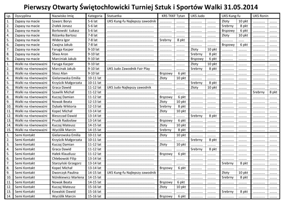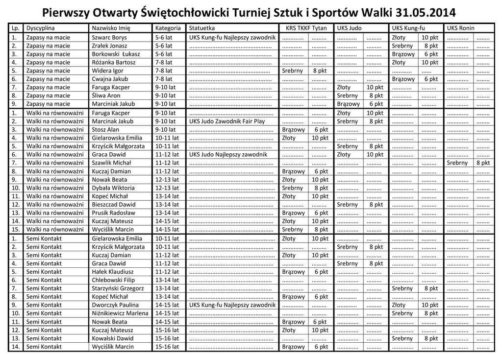 Pierwszy Otwarty Świętochłowicki Turniej Sztuk i Sportów Walki 31.05.2014 Lp. 1. 2. 3. 4. 5. 6. 7. 8. 9. 1. 2. 3. 4. 5. 6. 7. 8. 9. 10. 11. 12. 13. 14. 15. 1. 2. 3. 4. 5. 6. 7. 8. 9. 10. 11. 12. 13. 14. Dyscyplina Zapasy na macie Zapasy na macie Zapasy na macie Zapasy na macie Zapasy na macie Zapasy na macie Zapasy na macie Zapasy na macie Zapasy na macie Walki na równoważni Walki na równoważni Walki na równoważni Walki na równoważni Walki na równoważni Walki na równoważni Walki na równoważni Walki na równoważni Walki na równoważni Walki na równoważni Walki na równoważni Walki na równoważni Walki na równoważni Walki na równoważni Walki na równoważni Semi Kontakt Semi Kontakt Semi Kontakt Semi Kontakt Semi Kontakt Semi Kontakt Semi Kontakt Semi Kontakt Semi Kontakt Semi Kontakt Semi Kontakt Semi Kontakt Semi Kontakt Semi Kontakt Nazwisko Imię Szwarc Borys Zrałek Jonasz Borkowski Łukasz Różanka Bartosz Widera Igor Cwajna Jakub Faruga Kacper Śliwa Aron Marciniak Jakub Faruga Kacper Marcinak Jakub Stosz Alan Gielarowska Emilia Krzyścik Małgorzata Graca Dawid Szawlik Michał Kuczaj Damian Nowak Beata Dybała Wiktoria Kopeć Michał Bieszczad Dawid Prusik Radosław Kuczaj Mateusz Wyciślik Marcin Gielarowska Emilia Krzyścik Małgorzata Kuczaj Damian Graca Dawid Hałek Klaudiusz Chlebowski Filip Starzyński Grzegorz Kopeć Michał Dworczyk Paulina Niźnikiewicz Marlena Nowak Beata Kuczaj Mateusz Kowalski Dawid Wyciślik Marcin Kategoria 5-6 lat 5-6 lat 5-6 lat 7-8 lat 7-8 lat 7-8 lat 9-10 lat 9-10 lat 9-10 lat 9-10 lat 9-10 lat 9-10 lat 10-11 lat 10-11 lat 11-12 lat 11-12 lat 11-12 lat 12-13 lat 12-13 lat 13-14 lat 13-14 lat 13-14 lat 14-15 lat 14-15 lat 10-11 lat 10-11 lat 11-12 lat 11-12 lat 11-12 lat 13-14 lat 13-14 lat 13-14 lat 14-15 lat 14-15 lat 14-15 lat 15-16 lat 15-16 lat 15-16 lat Statuetka UKS Kung-fu Najlepszy zawodnik .................................................. .................................................. .................................................. ................................................. .................................................. .................................................. .................................................. .................................................. ................................................... UKS Judo Zawodnik Fair Play ................................................... ................................................... .................................................. UKS Judo Najlepszy zawodnik ................................................... ................................................... ................................................... .................................................... .................................................... ................................................... ................................................... ................................................... ................................................... .................................................... ................................................... .................................................... ................................................... ................................................... .................................................. .................................................. ................................................... UKS Kung-fu Najlepszy zawodnik .................................................. ................................................... ................................................... ................................................... ................................................... KRS TKKF Tytan ............. ......... ............ ......... ............. ......... ............. ......... Srebrny 8 pkt ............. ......... ............. ......... ............. ......... ............. ......... ............. ......... ............. ......... Brązowy 6 pkt Złoty 10 pkt ............. ......... ............. ......... ............. ......... Brązowy 6 pkt Złoty 10 pkt Srebrny 8 pkt Złoty 10 pkt ............. ......... Brązowy 6 pkt Złoty 10 pkt Srebrny 8 pkt Złoty 10 pkt ............. ......... Złoty 10 pkt ............. ......... Brązowy 6 pkt ............. ......... ............. ......... Brązowy 6 pkt ............. ......... ............. ......... Brązowy 6 pkt Złoty 10 pkt ............. ......... Brązowy 6 pkt UKS Judo ............ ............ ............ ............ ............. ............ Złoty Srebrny Brązowy Złoty Srebrny ............. ............ Srebrny Złoty ............. ............. ............. ............. ............. Srebrny ............. ............. ............. ............. Srebrny ............. Srebrny ............. ............. ............. ............ ............ ............. ............. ............. ............. ............. ......... ......... ......... ......... ......... ......... 10 pkt 8 pkt 6 pkt 10 pkt 8 pkt ......... ......... 8 pkt 10 pkt ......... ......... ......... ......... ......... 8 pkt ......... ......... ......... ......... 8 pkt ......... 8 pkt ......... ......... ......... ......... ......... ......... ......... ......... ......... ......... UKS Kung-fu Złoty 10 pkt Srebrny 8 pkt Brązowy 6 pkt Złoty 10 pkt ............ ...... Brązowy 6 pkt ............ ......... ............ ......... ............ ......... ............. ......... ............. ......... ............. ......... ............. ......... ............. ......... ............. ......... ............. ......... ............ ......... ............ ......... ............. ......... ............. ......... ............. ......... ............. ......... ............. ......... ............. ......... ............. ......... ............. ......... ............. ......... ............. ......... ............. ......... ............. ......... Sr
