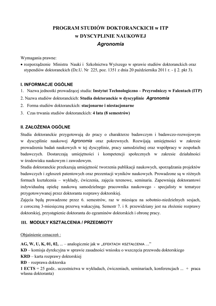 PROGRAM STUDIÓW DOKTORANCKICH w ITP w DYSCYPLINIE NAUKOWEJ Agronomia Wymagania prawne: rozporządzenie Ministra Nauki i Szkolnictwa Wyższego w sprawie studiów doktoranckich oraz stypendiów doktoranckich (Dz.U. Nr 225, poz. 1351 z dnia 20 października 2011 r. - § 2. pkt 3). I. INFORMACJE OGÓLNE 1. Nazwa jednostki prowadzącej studia: Instytut Technologiczno – Przyrodniczy w Falentach (ITP) 2. Nazwa studiów doktoranckich: Studia doktoranckie w dyscyplinie Agronomia 2. Forma studiów doktoranckich: stacjonarne i niestacjonarne 3. Czas trwania studiów doktoranckich: 4 lata (8 semestrów) II. ZAŁOŻENIA OGÓLNE Studia doktoranckie przygotowują do pracy o charakterze badawczym i badawczo-rozwojowym w dyscyplinie naukowej Agronomia oraz pokrewnych. Rozwijają umiejętności w zakresie prowadzenia badań naukowych w tej dyscyplinie, pracy samodzielnej oraz współpracy w zespołach badawczych. Dostarczają umiejętności i kompetencji społecznych w zakresie działalności w środowisku naukowym i zawodowym. Studia doktoranckie przekazują umiejętność tworzenia publikacji naukowych, sporządzania projektów badawczych i zgłoszeń patentowych oraz prezentacji wyników naukowych. Prowadzone są w różnych formach kształcenia – wykłady, ćwiczenia, zajęcia terenowe, seminaria. Zapewniają doktorantowi indywidualną opiekę naukową samodzielnego pracownika naukowego - specjalisty w tematyce przygotowywanej przez doktoranta rozprawy doktorskiej. Zajęcia będą prowadzone przez 6. semestrów, raz w miesiącu na sobotnio-niedzielnych sesjach, z coroczną 3-miesięczną przerwą wakacyjną. Semestr 7. i 8. przewidziany jest na złożenie rozprawy doktorskiej, przystąpienie doktoranta do egzaminów doktorskich i obronę pracy. III. MODUŁY KSZTAŁCENIA / PRZEDMIOTY Objaśnienie oznaczeń : AG, W, U, K, 01, 02, ... – analogicznie jak w „EFEKTACH KSZTAŁCENIA ....” KD – komisja dyrekcyjna w sprawie zasadności wniosku o wszczęcia przewodu doktorskiego KRD – karta rozprawy doktorskiej RD – rozprawa doktorska 1 ECTS = 25 godz.. uczestnictwa w wykładach, ćwiczeniach, seminariach, konferencjach ... + praca własna doktoranta) Lp I. Moduły / przedmioty podstawowe (obowiązkowe) Odniesienie do zakładanych efektów kształcenia Sposoby weryfikacji zakładanych efektów kształcenia Godziny ECTS 27,5 1. Nauki ekonomiczne, prawne, społeczne i WPR W 02, W 04, U 03 Pozytywne zaliczenie przedmiotów i zdanie egzaminów. 3,0 Metodologia badań naukowych empirycznych W 02, U 02, K 01 Statystyka matematyczna i doświadczalnictwo W 02, U 02, K 03 Zagadnienia biologiczne i chemiczne w obszarach wiejskich W 01, W 03, U 03, K 02 2,0 Komercjalizacja badań naukowych U 02 1,0 U 04, U 05 0,5 Metodyka/ zasady pisarstwa prac naukowych Język obcy 4,0 6,0 U 05 Semestralne seminaria doktoranckie Seminarium doktorskie Pozytywna ocena seminariów doktoranckich. Opracowanie karty rozprawy doktorskiej (KRD). Pozytywna ocena seminarium doktorskiego i obrona pracy doktorskiej. 6,0 4,5 0,5 II. Moduły / przedmioty kierunkowe (obowiązkowe) 9,5 2. Woda w rolnictwie i ekosystemach trawiastych 2 W 02, W 05, U 03, K 02, Pozytywne zaliczenie przedmiotów lub zdanie egzaminów. Przygotowanie do zajęć seminaryjnych 3,0 Środowiskowe problemy współczesnej wsi W 01, W 05, U 01, U 03, Ekstremalne zjawiska klimatyczne w rolnictwie W 02, W 03, U 03, K 02, 2,5 Energetyka i odnawialne źródła energii W 03, U 03, K 02 2,0 2,0 III. Moduły / przedmioty fakultatywne 3. Zagadnienia filozofii i etyki w nauce Elementy zaawansowanej informatyki w zastosowaniach naukowych Organizacja i uczestnictwo w konferencjach i seminariach Współpraca z opiekunem naukowym i promotorem 20,0 Przygotowanie publikacji. Studiowanie literatury. Uczestniczenie w seminariach krajowych. Uczestniczenie w konferencjach krajowych i zagranicznych. Zakończenie badań napisaną pracą doktorską i obroną. 3,0 4,0 3,0 10,0 57,0 IV. UKOŃCZENIE STUDIÓW Ukończenie studiów doktoranckich uwarunkowane będzie: - uzyskaniem pozytywnych ocen ze sprawdzianów z zajęć obowiązkowych (podstawowych i kierunkowych), - opublikowaniem recenzowanej publikacji lub recenzowanego opracowania, - złożeniem wniosku o wszczęcie przewodu doktorskiego, przystąpieniem do seminarium doktorskiego i uzyskaniem pozytywnej jego oceny przez Komisję Dyrekcyjną (KD), - obroną rozprawy doktorskiej (RD). Ukończenie studiów doktoranckich dokumentowane będzie uchwałą Rady Naukowej o nadaniu doktorantowi stopnia naukowego doktora nauk rolniczych w dyscyplinie Agronomia oraz dyplomem doktorskim. 3