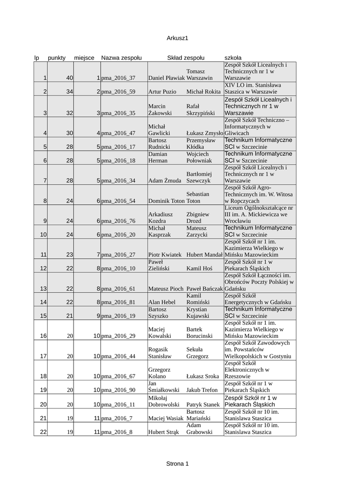 Arkusz1 lp punkty miejsce Nazwa zespołu 1 40 1 pma_2016_37 2 34 2 pma_2016_59 3 32 3 pma_2016_35 4 30 4 pma_2016_47 5 28 5 pma_2016_17 6 28 5 pma_2016_18 7 28 5 pma_2016_34 8 24 6 pma_2016_54 9 24 6 pma_2016_76 10 24 6 pma_2016_20 11 23 7 pma_2016_27 12 22 8 pma_2016_10 13 22 8 pma_2016_61 14 22 8 pma_2016_81 15 21 9 pma_2016_19 16 20 10 pma_2016_29 17 20 10 pma_2016_44 18 20 10 pma_2016_67 19 20 10 pma_2016_90 20 20 10 pma_2016_11 21 19 11 pma_2016_7 22 19 11 pma_2016_8 szkoła Zespół Szkół Licealnych i Tomasz Technicznych nr 1 w Daniel Pławiak Warszawin Warszawie XIV LO im. Stanisława Artur Puzio Michał Rokita Staszica w Warszawie Zespół Szkół Licealnych i Marcin Rafał Technicznych nr 1 w Żakowski Skrzypiński Warszawie Zespół Szkół Techniczno – Michał Informatycznych w Gawlicki Łukasz Zmysło Gliwicach Technikum Informatyczne Bartosz Przemysław SCI w Szczecinie Rudnicki Kłódka Technikum Informatyczne Damian Wojciech SCI w Szczecinie Herman Połowniak Zespół Szkół Licealnych i Bartłomiej Technicznych nr 1 w Adam Żmuda Szewczyk Warszawie Zespół Szkół AgroSebastian Technicznych im. W. Witosa Dominik Toton Toton w Ropczycach Liceum Ogólnokształcące nr Arkadiusz Zbigniew III im. A. Mickiewicza we Kozdra Drozd Wrocławiu Technikum Informatyczne Michał Mateusz SCI w Szczecinie Kasprzak Zarzycki Zespół Szkół nr 1 im. Kazimierza Wielkiego w Piotr Kwiatek Hubert Mandał Mińsku Mazowieckim Paweł Zespół Szkół nr 1 w Zieliński Kamil Hoś Piekarach Śląskich Zespół Szkół Łączności im. Obrońców Poczty Polskiej w Mateusz Pioch Paweł Bańczak Gdańsku Kamil Zespół Szkół Alan Hebel Romiński Energetycznych w Gdańsku Technikum Informatyczne Bartosz Krystian SCI w Szczecinie Szyszko Kujawski Zespół Szkół nr 1 im. Maciej Bartek Kazimierza Wielkiego w Kowalski Borucinski Mińsku Mazowieckim Zespół Szkół Zawodowych Rogasik Sekuła im. Powstańców Stanisław Grzegorz Wielkopolskich w Gostyniu Zespół Szkół Grzegorz Elektronicznych w Kolano Łukasz Sroka Rzeszowie Jan Zespół Szkół nr 1 w Śmiałkowski Jakub Trefon Piekarach Śląskich Mikołaj Zespół Szkół nr 1 w Dobrowolski Patryk Stanek Piekarach Śląskich Bartosz Zespół Szkół nr 10 im. Maciej Wasiak Mariański Stanislawa Staszica Adam Zespół Szkół nr 10 im. Hubert Strąk Grabowski Stanislawa Staszica Skład zespołu Strona 1 Arkusz1 Marcin Jędrzejewski 23 19 11 pma_2016_31 Paweł Gryz 24 19 11 pma_2016_87 Michał Michał Henicz Trefoński 25 18 12 pma_2016_9 Michał Jakubek Daniel Dybaś 26 18 12 pma_2016_28 Hubert Cichocki Patrycja Klimkowska 27 17 13 pma_2016_33 Krzysztof Bartosz Kopeć Kondera 28 16 14 pma_2016_14 Wach Marcin 29 16 14 pma_2016_43 30 16 14 pma_2016_52 31 16 14 pma_2016_62 32 16 14 pma_2016_80 33 16 14 pma_2016_60 Mateusz Tomasz Lisek Chmielewski Patryk Łukasz Kaszuba Frączek Dawid Damian Ciftci Kawałko Maciej Paweł Jędrasik Urbański 34 15 15 pma_2016_30 Bartosz Kowalski Sebastian Kaczmarek 35 15 15 pma_2016_46 Wolszczak Szymon Chotoborski Marek 36 15 15 pma_2016_79 Krzysztof Pytel 37 14 16 pma_2016_32 Jakub Święch Damian Łukasz Baszak Gaworski 38 14 16 pma_2016_36 Jakub Grzechociński Adrian Gerhart 39 14 16 pma_2016_45 Janczak Bartosz 40 14 16 pma_2016_49 Borys Rataj 41 13 17 pma_2016_42 42 12 18 pma_2016_21 43 12 18 pma_2016_41 Ochal Patryk Mateusz Miłoszewski Krzysztof Lipiński Mateusz Mikołajczak Piotr Araszkiewicz Aleksander Basarab Mikołaj Michnowicz 44 12 18 pma_2016_51 Adrian Runowski Grzegorz Kaniewski Grabia Patryk Wojciech Rafał Jaworski Olech Dworczak Mikołaj Strona 2 Zespół Szkół nr 1 im. Kazimierza Wielkiego w Mińsku Mazowieckim Technikum nr 4 im. Jana III Sobieskiego w JastrzębiuZdroju I Liceum Ogólnokształcące im.Króla Stanisława Leszczyńskiego w Jaśle Zespół Szkół nr 1 im. Kazimierza Wielkiego w Mińsku Mazowieckim Zespół Szkół Licealnych i Technicznych nr 1 w Warszawie Zespół Szkół Ponadgimnazjalnych "Cogito" w Siemianowicach Śląskich Zespół Szkół Elektronicznych w Lublinie Zespół Szkół im. J. i W. Zamoyskich w Rokietnicy k.Poznania Zespół Szkół Techniczno Usługowych w Trzebini Zespół Szkół Energetycznych w Gdańsku XIV LO im. Stanisława Staszica w Warszawie Zespół Szkół nr 1 im. Kazimierza Wielkiego w Mińsku Mazowieckim Zespół Szkół Techniczno Informatycznych w Gliwicach Zespół Szkół Technicznych o Ogólnokształcących im. Jana Pawła II w Limanowej Zespół Szkół nr 2 w Stargardzie Zespół Szkół Licealnych i Technicznych nr 1 w Warszawie Zespół Szkół Zawodowych im. Powstańców Wielkopolskich w Gostyniu Zespół Szkół im. J. i W. Zamoyskich w Rokietnicy k.Poznania Zespół Szkół Elektronicznych w Lublinie Technikum Informatyczne SCI w Szczecinie Zespół Szkół Elektronicznych w Lublinie Zespół Szkół im. J. i W. Zamoyskich w Rokietnicy k.Poznania Arkusz1 Arkadiusz Kraus Bazyli Polednia 19 pma_2016_25 Adam Król Kamila Schmidt Dawid Sobol Adrian Szczechowicz 10 19 pma_2016_53 Rafał Darłak Jacek Gawron 49 10 19 pma_2016_88 Łukasz Bieńczak Kamil Biela 50 8 20 pma_2016_1 Patryk Frączyk Dawid Napora 51 8 20 pma_2016_4 52 8 20 pma_2016_6 53 8 20 pma_2016_12 Bolesław Biela Natalia Laskowska Pietkiewicz Roger 54 8 20 pma_2016_15 Dominik Dzik Szymon Fecko 55 8 20 pma_2016_22 Niedbała Szymon 56 8 20 pma_2016_24 Michał Postek Paweł Szeląg 57 8 20 pma_2016_26 Adrian Bednarczuk Wiktor Murawko 58 8 20 pma_2016_48 Piotr Kucharczyk Karol Skorupski 59 8 20 pma_2016_50 Mateusz Kasprzak 60 8 20 pma_2016_73 61 8 20 pma_2016_74 Mateusz Wojtaszak Marcin Kowacki Norbert Ledwoch 62 8 20 pma_2016_75 Sebastian Stawiarski Adam Wojdyła 63 6 21 pma_2016_2 Pakulski Andrzej Jakub Bęben 64 6 21 pma_2016_3 Mateusz Zawadzki Randak Adam 65 6 21 pma_2016_5 Aleksandra Pyrkosz Dawid Woźniak 66 6 21 pma_2016_68 67 6 21 pma_2016_70 45 12 18 pma_2016_65 46 12 18 pma_2016_89 47 10 48 Duma Kamil Kacper Kochmański Rodriguez Antonio Bednarczyk Andrzej Adrian Garsk