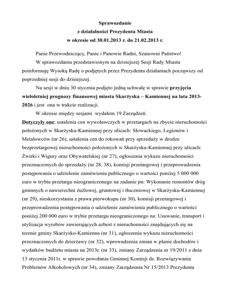 Sprawozdanie z działalności Prezydenta Miasta w okresie od 30.01.2013 r. do 21.02.2013 r. Panie Przewodniczący, Panie i Panowie Radni, Szanowni Państwo! W sprawozdaniu przedstawionym na dzisiejszej Sesji Rady Miasta poinformuję Wysoką Radę o podjętych przez Prezydenta działaniach począwszy od poprzedniej sesji do dzisiejszej. Na sesji w dniu 30 stycznia podjęto jedną uchwałę w sprawie przyjęcia wieloletniej prognozy finansowej miasta Skarżyska – Kamiennej na lata 20132026 i jest ona w trakcie realizacji. W okresie między sesjami wydałem 19 Zarządzeń. Dotyczyły one: ustalenia cen wywoławczych w przetargach na zbycie nieruchomości położonych w Skarżysku-Kamiennej przy ulicach: Słowackiego, Legionów i Metalowców (nr 26), ustalenia cen do rokowań przy sprzedaży w drodze bezprzetargowej nieruchomości położonych w Skarżysku-Kamiennej przy ulicach: Żwirki i Wigury oraz Obywatelskiej (nr 27), ogłoszenia wykazu nieruchomości przeznaczonych do sprzedaży (nr 28, 38), komisji przetargowej i przeprowadzenia postępowania o udzielenie zamówienia publicznego o wartości poniżej 5 000 000 euro w trybie przetargu nieograniczonego na zadanie pn: Wykonanie remontów dróg gminnych o nawierzchni żużlowej, gruntowej i tłuczniowej w Skarżysku-Kamiennej (nr 29), nieskorzystania z prawa pierwokupu (nr 30), komisji przetargowej i przeprowadzenia postępowania o udzielenie zamówienia publicznego o wartości poniżej 200 000 euro w trybie przetargu nieograniczonego na: Usuwanie, transport i utylizacja wyrobów zawierających azbest z nieruchomości znajdujących się na terenie gminy Skarżysko-Kamienna (nr 31), ogłoszenia wykazu nieruchomości przeznaczonych do dzierżawy (nr 32), wprowadzenia zmian w planie dochodów i wydatków budżetu miasta na 2013r. (nr 33), zmiany Zarządzenia nr 19/2011 z dnia 13 stycznia 2011r. w sprawie powołania Gminnej Komisji ds. Rozwiązywania Problemów Alkoholowych (nr 34), zmiany Zarządzenia Nr 15/2013 Prezydenta Miasta Skarżyska-Kamiennej z dnia 16 stycznia 2013r. w sprawie przyjęcia Regulaminu Skarżyskiego Inkubatora Technologicznego (nr 35), komisji przetargowej i przeprowadzenia postępowania o udzielenie zamówienia publicznego o wartości poniżej 5 000 000 euro w trybie przetargu nieograniczonego na: Bieżące utrzymanie, konserwację i wykonanie oznakowania pionowego oraz urządzeń bezpieczeństwa ruchu drogowego dróg gminnych miasta Skarżyska-Kamiennej (nr 36), ustalenia cen wywoławczych w drugich przetargach na sprzedaż nieruchomości gruntowych niezabudowanych, położonych w Skarżysku-Kamiennej przy ul. Szmaragdowej i Pięknej (nr 37), komisji przetargowej i przeprowadzenia postępowania o udzielenie zamówienia publicznego o wartości poniżej 5 000 000 euro w trybie przetargu nieograniczonego na: Wykonanie remontów cząstkowych nawierzchni bitumicznych dróg gminnych w mieście Skarżysko-Kamienna (nr 39), komisji przetargowej i przeprowadzenia postępowania o udzielenie zamówienia publicznego o wartości poniżej 200 000 euro w trybie przetargu nieograniczonego na zadanie pn: Sporządzanie operatów szacunkowych nieruchomości dla potrzeb Gminy Skarżysko-Kamienna - część II. (nr 40), komisji przetargowej i przeprowadzenia postępowania o udzielenie zamówienia publicznego o wartości poniżej 200 000 euro w trybie przetargu nieograniczonego na zadanie pn: Sporządzanie operatów szacunkowych nieruchomości dla potrzeb Gminy Skarżysko-Kamienna - część I. (nr 41), zmiany udziałów w nieruchomości wspólnej i udziałów w prawie użytkowania wieczystego nieruchomości gruntowej usytuowanej w Skarżysku-Kamiennej przy ulicy Jaracza nr 1 (nr 42), zmiany Zarządzenia Nr 148/2012 z dnia 12 lipca 2012 roku w sprawie wprowadzenia zasad rachunkowości dla Gminy Skarżysko-Kamienna oraz Urzędu Miasta Skarżyska-Kamienna (nr 43), ustalenia stawek czynszu za 1 m2 powierzchni w Skarżyskim Inkubatorze Technologicznym (nr 44). *** Ogłoszono dwa przetargi na: - Wykonanie remontów dróg gminnych o nawierzchni żużlowej, gruntowej i tłuczniowej w Skarżysku-Kamiennej - Usuwanie, transport i utylizację wyrobów zawierających azbest z nieruchomości znajdujących się na terenie Gminy Skarżysko-Kamienna W tym okresie nie została podpisana żadna umowa. SPRAWY RÓŻNE 1 lutego – odbyło się spotkanie dot. gospodarki odpadami w Urzędzie Marszałkowskim. Obecni na nim byli przedstawiciele Almaxu, gminy Końskie oraz Skarżyska-Kamiennej Natomiast po południu mój zastępca prezydent Grzegorz Małkus uczestniczył w 61. Plebiscycie Sportowym 2012 - Świętokrzyskie Gwiazdy Sportu organizowanym m.in. przez Redakcję Echa Dnia Rozpoczęliśmy spotkania z Radami osiedlowymi, na których poruszana była sprawa opłaty śmieciowej, która wchodzi w życie od 1 lipca b.r. 8 lutego – odbyło się spotkanie na Łyżwach, 9 – na osiedlu Bzinek, 13- na Bzinku, 14 - na osiedlu Bór, 18 - na osiedlu Pogorzałe, a 19 na osiedlu Książęcym. Deklaracje mieszkańcy powinni złożyć do 15 marca. 11 lutego – odbyło się kolejne spotkanie w sprawie zamkniętej kładki na ulicy Pięknej. Na spotkanie nie przybyli jednak przedstawiciele kolei. W związku z tym postanowiliśmy z parlamentarzystami i obecnymi przedstawicielami osiedla spotkać aię z władzami kolei na wyższym szczeblu w Warszawie. W dniu wczorajszym tj.20 lutego takie spotkanie się odbyło. 12 lutego – skarżyszczanie mieli możliwość sprawdzenia swoich umiejętności podczas otwartego konkursu ortograficznego o tytuł „Skarżyskiego Mistrza Polszczyzny – 2013” zorganizowanego przez Powiatowo-Miejską Bibliotekę Publiczną w Skarżysku-Kamiennej. Do konkursu zgłosiło swój udział 89 osób. 14 lutego – brałem udział w zorganizowanej przez Miejską Komunikację Samochodową konferencji, na której przedstawiciel operatora usługi przedstawił sposób korzystania z "zakupu biletu przez telefon". Tego dnia uczestniczyłem również w