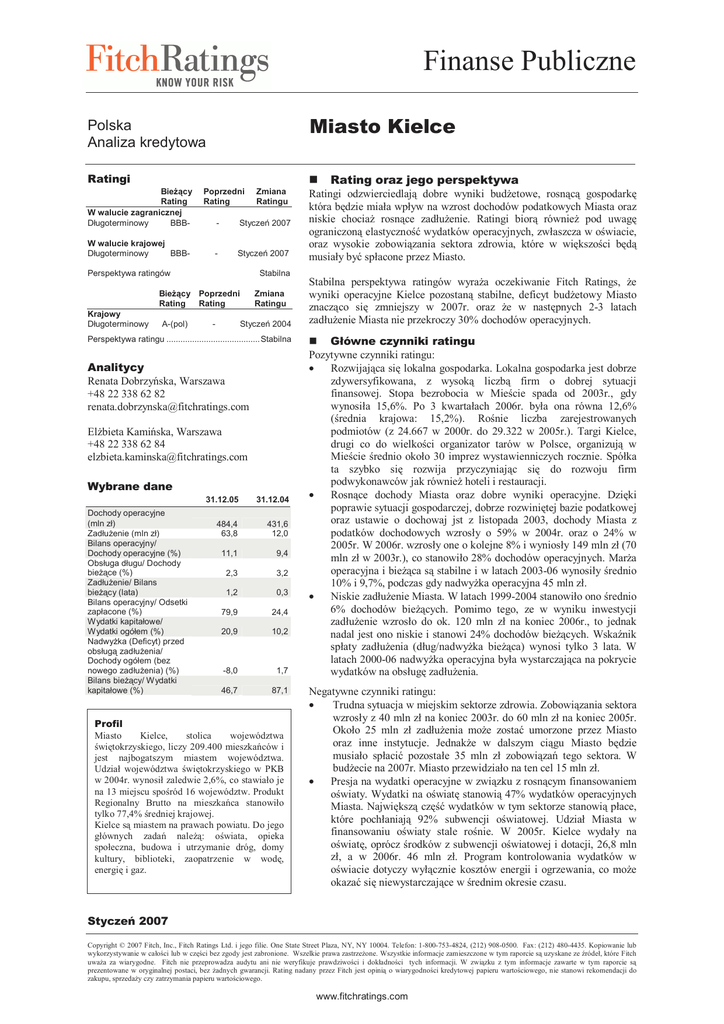 Finanse Publiczne Miasto Kielce Polska Analiza kredytowa Ratingi Bieżący Rating W walucie zagranicznej Długoterminowy BBBW walucie krajowej Długoterminowy BBB- Poprzedni Rating - Styczeń 2007 - Styczeń 2007 Perspektywa ratingów Stabilna Bieżący Poprzedni Rating Rating Krajowy Długoterminowy A-(pol) Zmiana Ratingu - Zmiana Ratingu Styczeń 2004 Perspektywa ratingu ........................................ Stabilna Analitycy Renata Dobrzyńska, Warszawa +48 22 338 62 82 [email protected] Elżbieta Kamińska, Warszawa +48 22 338 62 84 [email protected] Wybrane dane Dochody operacyjne (mln zł) Zadłużenie (mln zł) Bilans operacyjny/ Dochody operacyjne (%) Obsługa długu/ Dochody bieżące (%) Zadłużenie/ Bilans bieżący (lata) Bilans operacyjny/ Odsetki zapłacone (%) Wydatki kapitałowe/ Wydatki ogółem (%) Nadwyżka (Deficyt) przed obsługą zadłużenia/ Dochody ogółem (bez nowego zadłużenia) (%) Bilans bieżący/ Wydatki kapitałowe (%) 31.12.05 31.12.04 484,4 63,8 431,6 12,0 11,1 9,4 2,3 3,2 1,2 0,3 79,9 24,4 20,9 10,2 -8,0 1,7 46,7 87,1 Profil Miasto Kielce, stolica województwa świętokrzyskiego, liczy 209.400 mieszkańców i jest najbogatszym miastem województwa. Udział województwa świętokrzyskiego w PKB w 2004r. wynosił zaledwie 2,6%, co stawiało je na 13 miejscu spośród 16 województw. Produkt Regionalny Brutto na mieszkańca stanowiło tylko 77,4% średniej krajowej. Kielce są miastem na prawach powiatu. Do jego głównych zadań należą: oświata, opieka społeczna, budowa i utrzymanie dróg, domy kultury, biblioteki, zaopatrzenie w wodę, energię i gaz. Rating oraz jego perspektywa Ratingi odzwierciedlają dobre wyniki budżetowe, rosnącą gospodarkę która będzie miała wpływ na wzrost dochodów podatkowych Miasta oraz niskie chociaż rosnące zadłużenie. Ratingi biorą również pod uwagę ograniczoną elastyczność wydatków operacyjnych, zwłaszcza w oświacie, oraz wysokie zobowiązania sektora zdrowia, które w większości będą musiały być spłacone przez Miasto. Stabilna perspektywa ratingów wyraża oczekiwanie Fitch Ratings, że wyniki operacyjne Kielce pozostaną stabilne, deficyt budżetowy Miasto znacząco się zmniejszy w 2007r. oraz że w następnych 2-3 latach zadłużenie Miasta nie przekroczy 30% dochodów operacyjnych. Główne czynniki ratingu Pozytywne czynniki ratingu: • Rozwijająca się lokalna gospodarka. Lokalna gospodarka jest dobrze zdywersyfikowana, z wysoką liczbą firm o dobrej sytuacji finansowej. Stopa bezrobocia w Mieście spada od 2003r., gdy wynosiła 15,6%. Po 3 kwartałach 2006r. była ona równa 12,6% (średnia krajowa: 15,2%). Rośnie liczba zarejestrowanych podmiotów (z 24.667 w 2000r. do 29.322 w 2005r.). Targi Kielce, drugi co do wielkości organizator tarów w Polsce, organizują w Mieście średnio około 30 imprez wystawienniczych rocznie. Spółka ta szybko się rozwija przyczyniając się do rozwoju firm podwykonawców jak również hoteli i restauracji. • Rosnące dochody Miasta oraz dobre wyniki operacyjne. Dzięki poprawie sytuacji gospodarczej, dobrze rozwiniętej bazie podatkowej oraz ustawie o dochowaj jst z listopada 2003, dochody Miasta z podatków dochodowych wzrosły o 59% w 2004r. oraz o 24% w 2005r. W 2006r. wzrosły one o kolejne 8% i wyniosły 149 mln zł (70 mln zł w 2003r.), co stanowiło 28% dochodów operacyjnych. Marża operacyjna i bieżąca są stabilne i w latach 2003-06 wynosiły średnio 10% i 9,7%, podczas gdy nadwyżka operacyjna 45 mln zł. • Niskie zadłużenie Miasta. W latach 1999-2004 stanowiło ono średnio 6% dochodów bieżących. Pomimo tego, ze w wyniku inwestycji zadłużenie wzrosło do ok. 120 mln zł na koniec 2006r., to jednak nadal jest ono niskie i stanowi 24% dochodów bieżących. Wskaźnik spłaty zadłużenia (dług/nadwyżka bieżąca) wynosi tylko 3 lata. W latach 2000-06 nadwyżka operacyjna była wystarczająca na pokrycie wydatków na obsługę zadłużenia. Negatywne czynniki ratingu: • Trudna sytuacja w miejskim sektorze zdrowia. Zobowiązania sektora wzrosły z 40 mln zł na koniec 2003r. do 60 mln zł na koniec 2005r. Około 25 mln zł zadłużenia może zostać umorzone przez Miasto oraz inne instytucje. Jednakże w dalszym ciągu Miasto będzie musiało spłacić pozostałe 35 mln zł zobowiązań tego sektora. W budżecie na 2007r. Miasto przewidziało na ten cel 15 mln zł. • Presja na wydatki operacyjne w związku z rosnącym finansowaniem oświaty. Wydatki na oświatę stanowią 47% wydatków operacyjnych Miasta. Największą część wydatków w tym sektorze stanowią płace, które pochłaniają 92% subwencji oświatowej. Udział Miasta w finansowaniu oświaty stale rośnie. W 2005r. Kielce wydały na oświatę, oprócz środków z subwencji oświatowej i dotacji, 26,8 mln zł, a w 2006r. 46 mln zł. Program kontrolowania wydatków w oświacie dotyczy wyłącznie kosztów energii i ogrzewania, co może okazać się niewystarczające w średnim okresie czasu. Styczeń 2007 Copyright © 2007 Fitch, Inc., Fitch Ratings Ltd. i jego filie. One State Street Plaza, NY, NY 10004. Telefon: 1-800-753-4824, (212) 908-0500. Fax: (212) 480-4435. Kopiowanie lub wykorzystywanie w całości lub w części bez zgody jest zabronione. Wszelkie prawa zastrzeżone. Wszystkie informacje zamieszczone w tym raporcie są uzyskane ze źródeł, które Fitch uważa za wiarygodne. Fitch nie przeprowadza audytu ani nie weryfikuje prawdziwości i dokładności tych informacji. W związku z tym informacje zawarte w tym raporcie są prezentowane w oryginalnej postaci, bez żadnych gwarancji. Rating nadany przez Fitch jest opinią o wiarygodności kredytowej papieru wartościowego, nie stanowi rekomendacji do zakupu, sprzedaży czy zatrzymania papieru wartościowego. www.fitchratings.com Finanse Publiczne Załącznik A - Miasto Kielce Wykonanie (mln zł) Podatki Transfery bieżące (dotacje i subwencje) Opłaty i pozostałe dochody operacyjne D