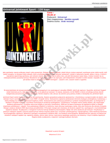 Informacje o produkcie Utworzono 04-03-2017 Universal Jointment Sport - 120 kaps Cena : 49,00 zł ro dz y w ki .p l Producent : Universal Stan magazynowy : bardzo wysoki Średnia ocena : brak recenzji pe Jako sportowiec zawsze próbujesz stawić czoła wyzwaniom. Dlatego stosujesz odżywki, dzięki którym możesz poprawić uzyskiwane przez siebie wyniki. Jeśli jesteś rozsądny, to stosujesz także odżywki, które umożliwiają Twojemu ciału odzyskać sprawność i działać w optymalny sposób. Jedną z rzeczy, o których najczęściej zapominają sportowcy, jest zdrowie stawów. Ciężkie treningi to jedna rzecz, ale jeśli lekceważysz swoje stawy, możesz narażać się na niebezpieczeństwo poważnej kontuzji. Niezależnie od tego, jakim sportem się zajmujesz, jeśli kiedykolwiek cierpiałeś na bóle stawów i wiązadeł, to wiesz, jak bardzo może to cofnąć Cię w Twoich treningach – czasami o dni, czasami nawet o tygodnie. su W przeciwieństwie do konwencjonalnych leków przeciwzapalnych nie zawierających sterydów (NSAID), takich jak aspiryna i ibuprofen, Jointment Support został stworzony po to, żeby leczyć przyczyny, a nie jedynie ja tuszować. Co więcej, wykazano, że leki NSAID w istocie utrudniają syntezę otoczki kolagenowej (przywracanie zdrowia chrząstek). Pomóż swojemu ciału uleczyć się samemu przy pomocy środka o niezwykłej sile, Jointment Sport. Jointment Sport został stworzony specjalnie dla sportowców. Zawiera sprawdzone połączenie glukozaminy i chondroityny w proporcji jeden do dwóch, oraz dziesięć innych czynników aktywnych, w tym MSM i chrząstki rekina. Glukozamina zapewnia podstawowe elementy budujące proteoglikany (substancję, z której składają się chrząstki) i glikozoaminoglikany (GAG). Glukozoamina jest substancją pośrednią w syntezie mukopolisacharydów i jej dostępność w tkankach chrząstek może być czynnikiem kontrolującym produkcje proteoglikanu. Chondroityna i chrząstka rekina zostały dodane, aby wspomagać działanie glukozoaminy. Chrząstka rekina jest bogata w siarczany chondroityny. MSM jest od dawna stosowane do łagodzenia bólów w układzie mięśniowo-szkieletowym i zapaleń. Inne podstawowe składniki to metionina, kwas aminowy zawierający siarkę, który jest konieczny dla zdrowia chrząstek. Mangan zwiększa działanie SOD (dysmutazę ponadtlenków). W Europie mangan jest stosowany do leczenia zapaleń (np. wynikających z reumatoidalnego zapalenia stawów). W połączeniu z manganem kurkuma hamuje działanie przeciwzapalne. Będąc tak samo skuteczna jak kortyzon i fenylbutazyn w pewnych rodzajach zapaleń, kurkuma powstrzymuje również skupiska płytek krwi i enzymów cyklooksygenezy i lipooksygenezy, które katalizują tworzenie się prostaglandyn zapalnych. Witamina E pomaga w wywoływaniu działania SOD i ma działanie przeciwzapalne. Bioflawonoid jest zalecany w praktycznie wszelkich rodzajach zapaleń (np. zapalenie stawów, astma, katar sienny), kwercetyna zapobiega uwalnianiu się histaminy i innych środków zapalnych. Magnes działa w połączeniu z wapniem i pomaga budować siłę kości. Zawartość w porcji (6 kaps): Witamina E 15 IU Wygenerowano w programie www.oscGold.com Wapń 100 mg Magnez 100 mg Mangan 1 mg Glukozamina 1500 mg Siarczan chondroityny 200 mg MSM 150 mg Kurkuma 150 mg Chrząstka rekina 100 mg Colostrum IGF-1 100 mg Kwercytyna 100 mg su pe ro dz y w ki .p l Metionina 50 mg