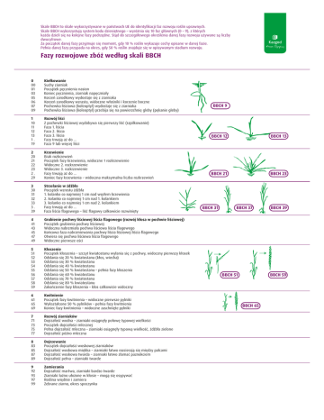 Skale BBCH to skale wykorzystywane w pa stwach UE do identy kacji faz rozwoju ro lin uprawnych. Skale BBCH wykorzystuj system kodu dziesi tnego wyró nia si 10 faz g ównych (0 9), z których ka da dzieli si na kolejne fazy podrz dne. St d do szczegó owego okre lenia danej fazy rozwoju u ywane s liczby dwucyfrowe. Za pocz tek danej fazy przyjmuje si moment, gdy 10 % ro lin wykazuje cechy opisane w danej fazie. Pe nia danej fazy przypada na okres, gdy 50 % ro lin znajduje si w opisywanym stadium rozwoju. Fazy rozwojowe zbó wed ug skali BBCH 0 00 01 03 05 06 07 09 Kie kowanie Suchy ziarniak Pocz tek p cznienia nasion Koniec p cznienia, ziarniak nap cznia y Korze zarodkowy wydostaje si z ziarniaka Korze zarodkowy wzrasta, widoczne w o niki i korzenie boczne Pochewka li ciowa (koleoptyl) wydostaje si z ziarniaka Pochewka li ciowa (koleoptyl) przebija si na powierzchni gleby (p kanie gleby) 1 10 11 12 13 1. 19 Rozwój li ci Z pochewki li ciowej wydobywa si pierwszy li Faza 1. li cia Faza 2. li cia Faza 3. li cia Fazy trwaj a do ... Faza 9 lub wi cej li ci 2 20 21 22 23 2. 29 Krzewienie Brak rozkrzewie Pocz tek fazy krzewienia, widoczne 1 rozkrzewienie Widoczne 2. rozkrzewienie Widoczne 3. rozkrzewienie Fazy trwaj a do ... Koniec fazy krzewienia widoczna maksymalna liczba rozkrzewie 3 30 31 32 33 3. 39 Strzelanie w d b o Pocz tek wzrostu d b a 1. kolanko co najmniej 1 cm nad w z em krzewienia 2. kolanko co najmniej 1 cm nad 1. kolankiem 3. kolanko co najmniej 1 cm nad 2. kolankiem Fazy trwaj a do ... Faza li cia agowego li agowy ca kowicie rozwini ty 4 41 43 45 47 49 Grubienie pochwy li ciowej li cia agowego (rozwój k osa w pochwie li ciowej) Pocz tek grubienia pochwy li ciowej Widoczna nabrzmia a pochwa li ciowa li cia agowego Ko cowa faza nabrzmiewania pochwy li cia li ciowej li cia agowego Otwiera si pochwa li ciowa li cia agowego Widoczne pierwsze o ci 5 51 52 53 54 55 56 57 58 59 K oszenie Pocz tek k oszenia szczyt kwiatostanu wy ania si z pochwy, widoczny pierwszy k osek Ods ania si 20 % kwiatostanu (k os, wiecha) Ods ania si 30 % kwiatostanu Ods ania si 40 % kwiatostanu Ods ania si 50 % kwiatostanu pe nia fazy k oszenia Ods ania si 60 % kwiatostanu Ods ania si 70 % kwiatostanu Ods ania si 80 % kwiatostanu Zako czenie fazy k oszenia k os ca kowicie widoczny 6 61 65 69 Kwitnienie Pocz tek fazy kwitnienia widoczne pierwsze pylniki Wykszta cone 50 % pylników pe nia fazy kwitnienia Koniec fazy kwitnienia widoczne zaschni te pylniki 7 71 73 75 77 Rozwój ziarniaków Dojrza o wodna ziarniaki osi gn y po ow typowej wielko ci Pocz tek dojrza o ci mlecznej Pe na dojrza o mleczna ziarniaki osi gn y typow wielko , d b a zielone Dojrza o pó no mleczna 8 83 85 87 89 Dojrzewanie Pocz tek dojrza o ci woskowej ziarniaków Dojrza o woskowa mi kka ziarniaki atwo rozcieraj si mi dzy palcami Dojrza o woskowa twarda ziarniaki atwo z ama paznokciem Dojrza o pe na ziarniaki twarde 9 92 93 97 99 Zamierania Dojrza o martwa, ziarniaki bardzo twarde Ziarniaki lu no u o one w k osie mog si osypywa Ro lina wi dnie i zamiera Zebrane ziarno, okres spoczynku BBCH 9 (szpilkowanie) BBCH 12 BBCH 13 BBCH 21 BBCH 23 BBCH 31 BBCH 37 BBCH 51 BBCH 39 BBCH 59 BBCH 65