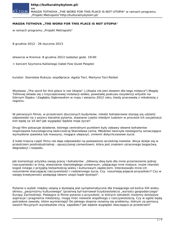 http://kulturalnybytom.pl/ aw MAGDA TOTHOVA „THE WORD FOR THIS PLACE IS NOT UTOPIA" w ramach programu „Projekt Metropolis"http://kulturalnybytom.pl/ MAGDA TOTHOVA „THE WORD FOR THIS PLACE IS NOT UTOPIA" w ramach programu „Projekt Metropolis" 8 grudnia 2012 - 26 stycznia 2013 otwarcie w Kronice: 8 grudnia 2013 (sobota) godz. 19:00 + koncert Szymona Kaliskiego (label Few Quiet People) kurator: Stanisław Ruksza; współpraca: Agata Tecl, Martyna Tecl-Reibel Wystawa „The word for this place is not Utopia" („Utopia nie jest słowem dla tego miejsca") Magdy Tothovej składa się z trzyczęściowej instalacji wideo, powstałej podczas rezydencji artystki na Górnym Śląsku i Zagłębiu Dąbrowskim w maju i sierpniu 2012 roku, kiedy pracowała z młodzieżą z regionu. W pierwszym filmie, w przestrzeni zburzonych budynków, młodzi bohaterowie starają się udzielić odpowiedzi na z pozoru banalne pytania, stawiane często młodym ludziom w procesie ich socjalizacji: kim będę za 10 lat? Jak wyglądać będzie moje życie? Drugi film pokazuje działanie, którego centralnym punktem były zabawy słowne bohaterów inspirowane futurologiczną twórczością Stanisława Lema. Młodzież tworzyła neologizmy oznaczające wymyślone zjawiska lub maszyny, mogące ulepszyć, zmienić dotychczasowe życie. Z kolei trzecia część filmu nie daje odpowiedzi na postawione wcześniej kwestie. Akcja dzieje się w przestrzeni postindustrialnej - opuszczonej cementowni, która jest znakiem utraconego bogactwa, degradacji i rozpadu. Jak komentuje artystka swoją pracę i bohaterów: „Główną ideą było dla mnie przeniesienie jednej rzeczywistości w inną, stworzenie równoległego uniwersum, udającego inne miejsce, może również kogoś innego z przyjętą tożsamością wieku i kulturowym zapleczem. Interesowało mnie ich rozumienie otaczającej rzeczywistości i codziennego życia. Czy rozumieją pojęcie przyszłości? Czy w swojej kreatywności podążają ideami utopii bądź dystopii". Pytanie o wybór między utopią a dystopią jest symptomatyczne dla trwającego od końca XIX wieku okresu „pesymizmu kulturowego" (przerwą był karnawał trzydziestolecia „wzrostu gospodarczego" Europy Zachodniej). Padające w filmie pytania o przyszłość, w których odnaleźć możemy dzisiejsze aspiracje i pragnienia młodzieży, mogą mieć niewiele wspólnego z rzeczywistością. Czy w ogóle będą potrzebne zawody, które wymieniają? Do jakiego stopnia rozwiną się problemy, którym za pomocą swoich fikcyjnych wynalazków chcą zapobiec? Jak będzie wyglądać otaczająca je przestrzeń? 1/4 http://kulturalnybytom.pl/ aw MAGDA TOTHOVA „THE WORD FOR THIS PLACE IS NOT UTOPIA" w ramach programu „Projekt Metropolis"http://kulturalnybytom.pl/ Francuski filozof Alain Badiou, stwierdzał, że XX wiek przetestował już utopie wieku XIX. Wiek XXI wypełnia pasja wirtualnego, tego, co jeszcze nie jest realne, ale co może nastąpić w pewnych warunkach. Krzysztof Pomian, polski filozof i historyk, zauważał w eseju „Kryzys przyszłości" już w 1980 roku: „naruszone są same podstawy cywilizacji współczesnej we wszystkich jej kształtach ustrojowych, ponieważ coraz trudniej pomyśleć przyszłość zarazem osiągalną i pożądaną: taką, której by przekonywające racje pozwalały oczekiwać z zasadną nadzieją, że przynajmniej pod pewnymi względami będzie lepsza od teraźniejszości. Przyszłość uważana dziś za prawdopodobną może być tylko gorsza. A ta, która by spełniła nasze życzenia, ma swe ostatnie schronienie w Utopii. Tej sytuacji nie sposób lekceważyć". Rozpiętość kierunków pomiędzy pomiędzy utopią i dystopią jest równoległa do znaczeń i horyzontów dzisiejszej nauki oraz badań nad przyszłością. Nowoczesna nauka, ufundowana na Rozumie mówi, że przyszłość może być tylko lepsza i uwolnić człowieka od chorób, głodu, czy przyczyn nienawiści powodujących wojny. Z drugiej strony rozwój nauki nie zna granic i jako taki jest nieprzewidywalny, a biorąc pod uwagę dynamiczny wzrost innowacji, przysparzać może coraz więcej czynników niepewności. Przestrzeń Górnego Śląska i Zagłebia Dąbrowskiego, gdzie kręcono zdjęcia pracy Magdy Tothovej, i gdzie mieszkają bohaterowie filmu, jest miejscem dotkniętym gwałtowną transformacją, typową dla miejsc dotąd służących wydobyciu surowców kopalnych. Projekt industrialny został zastąpiony czynnością przetwarzania informacji. Tym samym dotychczasowa przestrzeń, wraz z jej kulturowym bagażem, staje się projektem otwartym. W pracy artystki spotyka się to, co młode, na swój sposób niewinne, z tym, co okaleczone, zniszczone, „przeryte" rozczarowaniem dotychczasowej rzeczywistości i niepewnością jutra. Dwie pierwsze części wideoinstalacji pokazują instynktownie odczuwalne lęki o przyszłość. Pojawiają się w nich życzenia zmiany prędkości rytmu życia i tempa wzrostu w świecie, pragnienia charakterystyczne dla wielu miejsc zglobalizowanego świata płynnej nowoczesności. W części trzeciej wciąż młodzi bohaterowie ukrywają się w poprzemysłowych ruinach świata, gdzie zmieniły się warunki egzystencji. Pozostają samotni wraz z ze swymi pragnieniami zmian. W fimie udział wzięli: Ania Hanusek, Bartek Kania, Joanna Roskosz, Patrycja Roskosz, Sandra Roskosz, Monika Szmalowska, Olaf Śliwa, Dawid Terech, Alicja Ziob, Daniel Żyłka. Magda Tothova (ur. 1979) - pochodzi z Bratysławy, ukończyła Universität für angewandte Kunst w Wiedniu, gdzie obecnie żyje i pracuje. Wystawiała w wielu ważnych instytucjach na świecie, m.in. w londyńskiej Tate Modern, nowojorskiej 127 Gallery, Stella Art Gallery w Moskwie. Najważniejsze projekty: Lenin and the Maiden (2003), Thos could be my revolution (2004), The Pray (2007), Hell is Forever (2009), Welcome to the black cube (2009), The decision (2009). 2/4 http://kulturalnybytom.pl/ aw MAGDA TOTHOVA „TH