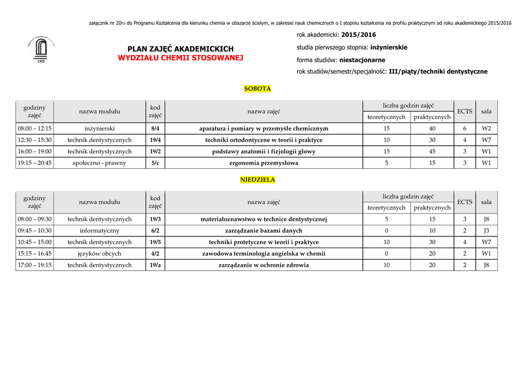 załącznik nr 20TD do Programu Kształcenia dla kierunku chemia w obszarze ścisłym, w zakresie nauk chemicznych o I stopniu kształcenia na profilu praktycznym od roku akademickiego 2015/2016 rok akademicki: 2015/2016 studia pierwszego stopnia: inŜynierskie PLAN ZAJĘĆ AKADEMICKICH WYDZIAŁU CHEMII STOSOWANEJ forma studiów: niestacjonarne rok studiów/semestr/specjalność: III/piąty/techniki dentystyczne SOBOTA godziny zajęć nazwa modułu kod zajęć nazwa zajęć 08:00 – 12:15 inŜynierski 8/4 12:30 – 15:30 technik dentystycznych 16:00 – 19:00 19:15 – 20:45 liczba godzin zajęć ECTS sala 40 6 W2 10 30 4 W7 podstawy anatomii i fizjologii głowy 15 45 3 W1 ergonomia przemysłowa 5 15 3 W1 ECTS sala teoretycznych praktycznych aparatura i pomiary w przemyśle chemicznym 15 19/4 techniki ortodontyczne w teorii i praktyce technik dentystycznych 19/2 społeczno - prawny 5/c NIEDZIELA godziny zajęć nazwa modułu kod zajęć nazwa zajęć 08:00 – 09:30 technik dentystycznych 19/3 09:45 – 10:30 informatyczny 10:45 – 15:00 liczba godzin zajęć teoretycznych praktycznych materiałoznawstwo w technice dentystycznej 5 15 3 J8 6/2 zarządzanie bazami danych 0 10 2 J3 technik dentystycznych 19/5 techniki protetyczne w teorii i praktyce 10 30 4 W7 15:15 – 16:45 języków obcych 4/2 zawodowa terminologia angielska w chemii 0 20 2 W1 17:00 – 19:15 technik dentystycznych 19/a zarządzanie w ochronie zdrowia 10 20 2 J8