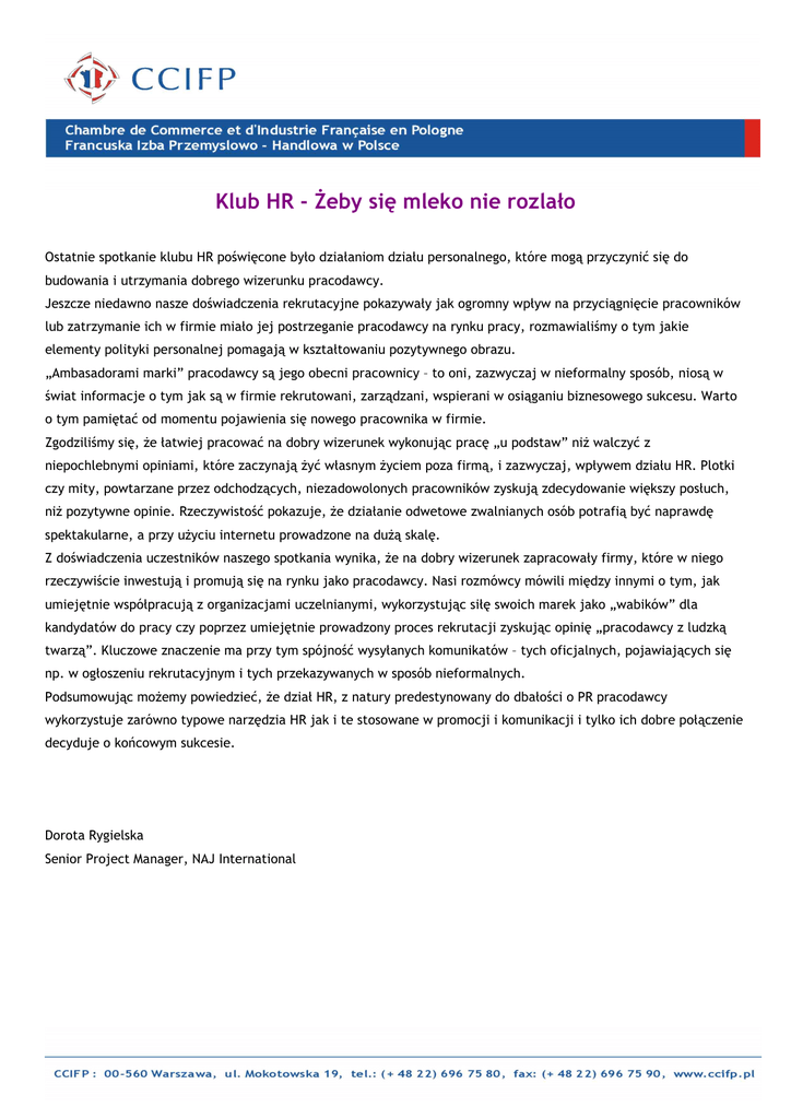 Klub HR - Żeby się mleko nie rozlało Ostatnie spotkanie klubu HR poświęcone było działaniom działu personalnego, które mogą przyczynić się do budowania i utrzymania dobrego wizerunku pracodawcy. Jeszcze niedawno nasze doświadczenia rekrutacyjne pokazywały jak ogromny wpływ na przyciągnięcie pracowników lub zatrzymanie ich w firmie miało jej postrzeganie pracodawcy na rynku pracy, rozmawialiśmy o tym jakie elementy polityki personalnej pomagają w kształtowaniu pozytywnego obrazu. „Ambasadorami marki” pracodawcy są jego obecni pracownicy – to oni, zazwyczaj w nieformalny sposób, niosą w świat informacje o tym jak są w firmie rekrutowani, zarządzani, wspierani w osiąganiu biznesowego sukcesu. Warto o tym pamiętać od momentu pojawienia się nowego pracownika w firmie. Zgodziliśmy się, że łatwiej pracować na dobry wizerunek wykonując pracę „u podstaw” niż walczyć z niepochlebnymi opiniami, które zaczynają żyć własnym życiem poza firmą, i zazwyczaj, wpływem działu HR. Plotki czy mity, powtarzane przez odchodzących, niezadowolonych pracowników zyskują zdecydowanie większy posłuch, niż pozytywne opinie. Rzeczywistość pokazuje, że działanie odwetowe zwalnianych osób potrafią być naprawdę spektakularne, a przy użyciu internetu prowadzone na dużą skalę. Z doświadczenia uczestników naszego spotkania wynika, że na dobry wizerunek zapracowały firmy, które w niego rzeczywiście inwestują i promują się na rynku jako pracodawcy. Nasi rozmówcy mówili między innymi o tym, jak umiejętnie współpracują z organizacjami uczelnianymi, wykorzystując siłę swoich marek jako „wabików” dla kandydatów do pracy czy poprzez umiejętnie prowadzony proces rekrutacji zyskując opinię „pracodawcy z ludzką twarzą”. Kluczowe znaczenie ma przy tym spójność wysyłanych komunikatów – tych oficjalnych, pojawiających się np. w ogłoszeniu rekrutacyjnym i tych przekazywanych w sposób nieformalnych. Podsumowując możemy powiedzieć, że dział HR, z natury predestynowany do dbałości o PR pracodawcy wykorzystuje zarówno typowe narzędzia HR jak i te stosowane w promocji i komunikacji i tylko ich dobre połączenie decyduje o końcowym sukcesie. Dorota Rygielska Senior Project Manager, NAJ International