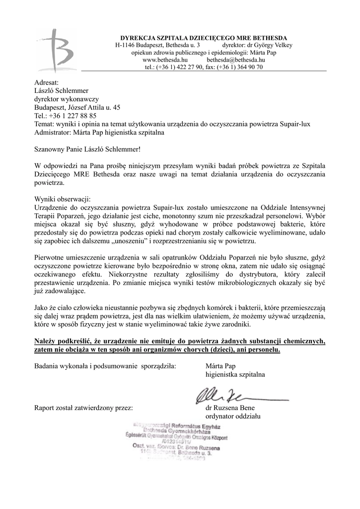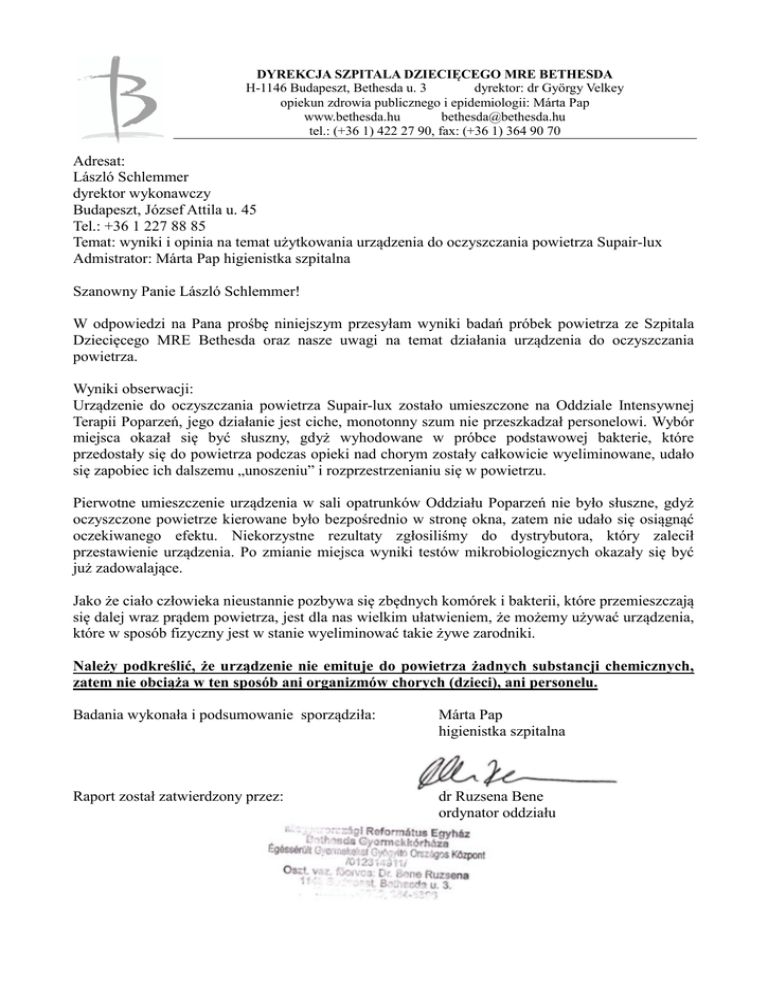 DYREKCJA SZPITALA DZIECIĘCEGO MRE BETHESDA H-1146 Budapeszt, Bethesda u. 3 dyrektor: dr György Velkey opiekun zdrowia publicznego i epidemiologii: Márta Pap www.bethesda.hu [email protected] tel.: (+36 1) 422 27 90, fax: (+36 1) 364 90 70 Adresat: László Schlemmer dyrektor wykonawczy Budapeszt, József Attila u. 45 Tel.: +36 1 227 88 85 Temat: wyniki i opinia na temat użytkowania urządzenia do oczyszczania powietrza Supair-lux Admistrator: Márta Pap higienistka szpitalna Szanowny Panie László Schlemmer! W odpowiedzi na Pana prośbę niniejszym przesyłam wyniki badań próbek powietrza ze Szpitala Dziecięcego MRE Bethesda oraz nasze uwagi na temat działania urządzenia do oczyszczania powietrza. Wyniki obserwacji: Urządzenie do oczyszczania powietrza Supair-lux zostało umieszczone na Oddziale Intensywnej Terapii Poparzeń, jego działanie jest ciche, monotonny szum nie przeszkadzał personelowi. Wybór miejsca okazał się być słuszny, gdyż wyhodowane w próbce podstawowej bakterie, które przedostały się do powietrza podczas opieki nad chorym zostały całkowicie wyeliminowane, udało się zapobiec ich dalszemu „unoszeniu” i rozprzestrzenianiu się w powietrzu. Pierwotne umieszczenie urządzenia w sali opatrunków Oddziału Poparzeń nie było słuszne, gdyż oczyszczone powietrze kierowane było bezpośrednio w stronę okna, zatem nie udało się osiągnąć oczekiwanego efektu. Niekorzystne rezultaty zgłosiliśmy do dystrybutora, który zalecił przestawienie urządzenia. Po zmianie miejsca wyniki testów mikrobiologicznych okazały się być już zadowalające. Jako że ciało człowieka nieustannie pozbywa się zbędnych komórek i bakterii, które przemieszczają się dalej wraz prądem powietrza, jest dla nas wielkim ułatwieniem, że możemy używać urządzenia, które w sposób fizyczny jest w stanie wyeliminować takie żywe zarodniki. Należy podkreślić, że urządzenie nie emituje do powietrza żadnych substancji chemicznych, zatem nie obciąża w ten sposób ani organizmów chorych (dzieci), ani personelu. Badania wykonała i podsumowanie sporządziła: Márta Pap higienistka szpitalna Raport został zatwierdzony przez: dr Ruzsena Bene ordynator oddziału