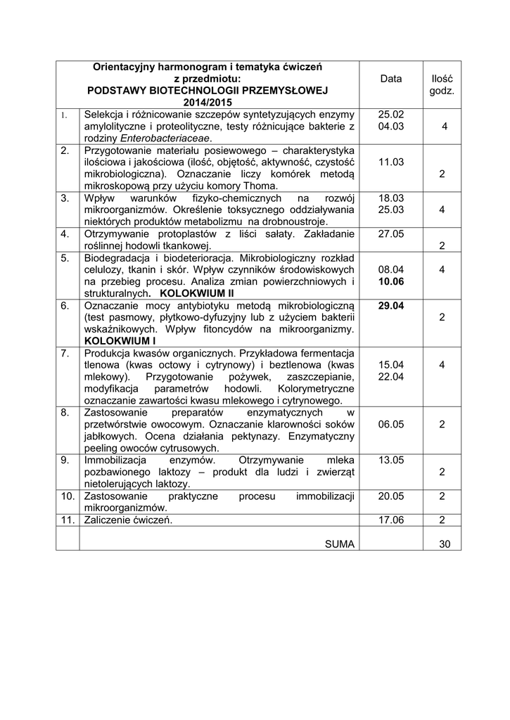 Orientacyjny harmonogram i tematyka ćwiczeń z przedmiotu: PODSTAWY BIOTECHNOLOGII PRZEMYSŁOWEJ 2014/2015 1. Selekcja i różnicowanie szczepów syntetyzujących enzymy amylolityczne i proteolityczne, testy różnicujące bakterie z rodziny Enterobacteriaceae. 2. Przygotowanie materiału posiewowego – charakterystyka ilościowa i jakościowa (ilość, objętość, aktywność, czystość mikrobiologiczna). Oznaczanie liczy komórek metodą mikroskopową przy użyciu komory Thoma. 3. Wpływ warunków fizyko-chemicznych na rozwój mikroorganizmów. Określenie toksycznego oddziaływania niektórych produktów metabolizmu na drobnoustroje. 4. Otrzymywanie protoplastów z liści sałaty. Zakładanie roślinnej hodowli tkankowej. 5. Biodegradacja i biodeterioracja. Mikrobiologiczny rozkład celulozy, tkanin i skór. Wpływ czynników środowiskowych na przebieg procesu. Analiza zmian powierzchniowych i strukturalnych. KOLOKWIUM II 6. Oznaczanie mocy antybiotyku metodą mikrobiologiczną (test pasmowy, płytkowo-dyfuzyjny lub z użyciem bakterii wskaźnikowych. Wpływ fitoncydów na mikroorganizmy. KOLOKWIUM I 7. Produkcja kwasów organicznych. Przykładowa fermentacja tlenowa (kwas octowy i cytrynowy) i beztlenowa (kwas mlekowy). Przygotowanie pożywek, zaszczepianie, modyfikacja parametrów hodowli. Kolorymetryczne oznaczanie zawartości kwasu mlekowego i cytrynowego. 8. Zastosowanie preparatów enzymatycznych w przetwórstwie owocowym. Oznaczanie klarowności soków jabłkowych. Ocena działania pektynazy. Enzymatyczny peeling owoców cytrusowych. 9. Immobilizacja enzymów. Otrzymywanie mleka pozbawionego laktozy – produkt dla ludzi i zwierząt nietolerujących laktozy. 10. Zastosowanie praktyczne procesu immobilizacji mikroorganizmów. 11. Zaliczenie ćwiczeń. SUMA Data 25.02 04.03 Ilość godz. 4 11.03 2 18.03 25.03 4 27.05 2 08.04 10.06 4 29.04 2 15.04 22.04 4 06.05 2 13.05 2 20.05 2 17.06 2 30