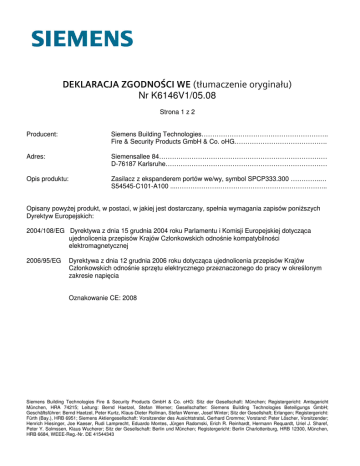 Nr K6146V1/05.08 Strona 1 z 2 Producent: Siemens Building Technologies………………………………………………….. Fire & Security Products GmbH & Co. oHG……………………………………. Adres: Siemensallee 84…………………………………………………………………… D-76187 Karlsruhe………………………………………………………………… Opis produktu: Zasilacz z ekspanderem portów we/wy, symbol SPCP333.300 …………..… S54545-C101-A100 ....……………….…………………………………………... Opisany powy ej produkt, w postaci, w jakiej jest dostarczany, spełnia wymagania zapisów poni szych Dyrektyw Europejskich: 2004/108/EG Dyrektywa z dnia 15 grudnia 2004 roku Parlamentu i Komisji Europejskiej dotycz ca ujednolicenia przepisów Krajów Członkowskich odno nie kompatybilno ci elektromagnetycznej 2006/95/EG Dyrektywa z dnia 12 grudnia 2006 roku dotycz ca ujednolicenia przepisów Krajów Członkowskich odno nie sprz tu elektrycznego przeznaczonego do pracy w okre lonym zakresie napi cia Oznakowanie CE: 2008 Siemens Building Technologies Fire & Security Products GmbH & Co. oHG: Sitz der Gesellschaft: München; Registergericht: Amtsgericht München, HRA 74215; Leitung: Bernd Haetzel, Stefan Werner; Gesellschafter: Siemens Building Technologies Beteiligungs GmbH; Geschäftsführer: Bernd Haetzel, Peter Kurtz, Klaus-Dieter Rollman, Stefan Werner, Josef Winter; Sitz der Gesellshaft; Erlangen; Registergericht: Fürth (Bay.), HRB 6951; Siemens Aktiengesellschaft: Vorsitzender des AusichtstratsL Gerhard Cromme; Vorstand: Peter Löscher, Vorsitzender; Henrich Hiesinger, Joe Kaeser, Rudi Lamprecht, Eduardo Montes, Jürgen Radomski, Erich R. Reinhardt, Hermann Requardt, Uriel J. Sharef, Peter Y. Solmssen, Klaus Wucherer; Sitz der Gesellschaft: Berlin und München; Registergericht: Berlin Charlottenburg, HRB 12300, München, HRB 6684, WEEE-Reg.-Nr. DE 41544343 Nr K6146V1/05.08 Strona 2 z 2 Potwierdzeniem spełnienia wymaga ww. Dyrektyw jest zgodno Nr referencyjny EN 55022+A1+A2, Kl.B EN 60950-1+A11.... Edycja 2003…... 2004..... z poni szymi normami: Nr referencyjny EN 50130-4+A2… Edycja 2003..... Karlsruhe, dn. 16.05.2008................ Siemens Building Technologies Fire & Security Products GmbH & Co. oHG Suzanne Carol Seitz Eberhard Kierownik LP SSWiN --/-- (podpis) ................................................................. Nazwisko, funkcja Podpis Thomas Knab Kierownik ds. jako ci --/-- (podpis) ............................................................... Nazwisko, funkcja Podpis Niniejsza deklaracja potwierdza zgodno z wyszczególnionymi dyrektywami europejskimi, nie potwierdza jednak jakichkolwiek własno ci. Nale y szczegółowo zapozna si z dokumentacj bezpiecze stwa towarzysz c produktowi. Siemens Building Technologies Fire & Security Products GmbH & Co. oHG: Sitz der Gesellschaft: München; Registergericht: Amtsgericht München, HRA 74215; Leitung: Bernd Haetzel, Stefan Werner; Gesellschafter: Siemens Building Technologies Beteiligungs GmbH; Geschäftsführer: Bernd Haetzel, Peter Kurtz, Klaus-Dieter Rollman, Stefan Werner, Josef Winter; Sitz der Gesellshaft; Erlangen; Registergericht: Fürth (Bay.), HRB 6951; Siemens Aktiengesellschaft: Vorsitzender des AusichtstratsL Gerhard Cromme; Vorstand: Peter Löscher, Vorsitzender; Henrich Hiesinger, Joe Kaeser, Rudi Lamprecht, Eduardo Montes, Jürgen Radomski, Erich R. Reinhardt, Hermann Requardt, Uriel J. Sharef, Peter Y. Solmssen, Klaus Wucherer; Sitz der Gesellschaft: Berlin und München; Registergericht: Berlin Charlottenburg, HRB 12300, München, HRB 6684, WEEE-Reg.-Nr. DE 41544343