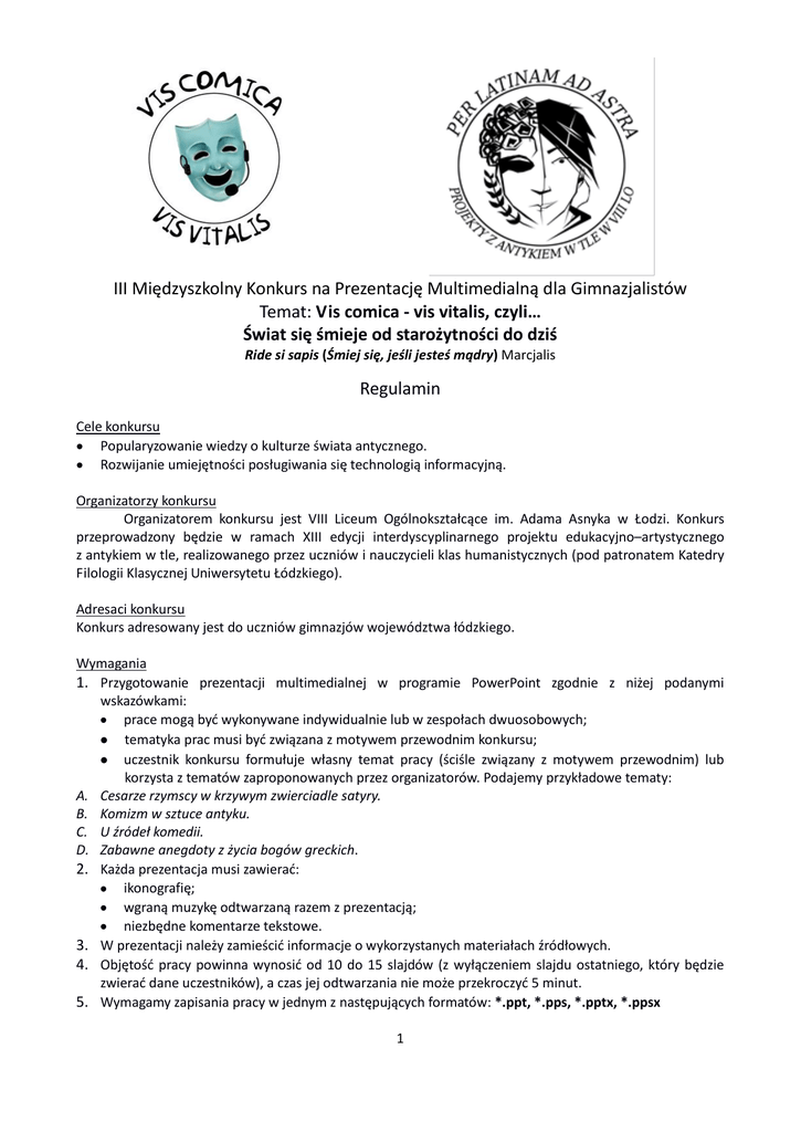 III Międzyszkolny Konkurs na Prezentację Multimedialną dla Gimnazjalistów Temat: Vis comica - vis vitalis, czyli… Świat się śmieje od starożytności do dziś Ride si sapis (Śmiej się, jeśli jesteś mądry) Marcjalis Regulamin Cele konkursu Popularyzowanie wiedzy o kulturze świata antycznego. Rozwijanie umiejętności posługiwania się technologią informacyjną. Organizatorzy konkursu Organizatorem konkursu jest VIII Liceum Ogólnokształcące im. Adama Asnyka w Łodzi. Konkurs przeprowadzony będzie w ramach XIII edycji interdyscyplinarnego projektu edukacyjno–artystycznego z antykiem w tle, realizowanego przez uczniów i nauczycieli klas humanistycznych (pod patronatem Katedry Filologii Klasycznej Uniwersytetu Łódzkiego). Adresaci konkursu Konkurs adresowany jest do uczniów gimnazjów województwa łódzkiego. Wymagania 1. Przygotowanie prezentacji multimedialnej w programie PowerPoint zgodnie z niżej podanymi wskazówkami: prace mogą byd wykonywane indywidualnie lub w zespołach dwuosobowych; tematyka prac musi byd związana z motywem przewodnim konkursu; uczestnik konkursu formułuje własny temat pracy (ściśle związany z motywem przewodnim) lub korzysta z tematów zaproponowanych przez organizatorów. Podajemy przykładowe tematy: A. Cesarze rzymscy w krzywym zwierciadle satyry. B. Komizm w sztuce antyku. C. U źródeł komedii. D. Zabawne anegdoty z życia bogów greckich. 2. Każda prezentacja musi zawierad: ikonografię; wgraną muzykę odtwarzaną razem z prezentacją; niezbędne komentarze tekstowe. 3. W prezentacji należy zamieścid informacje o wykorzystanych materiałach źródłowych. 4. Objętośd pracy powinna wynosid od 10 do 15 slajdów (z wyłączeniem slajdu ostatniego, który będzie zwierad dane uczestników), a czas jej odtwarzania nie może przekroczyd 5 minut. 5. Wymagamy zapisania pracy w jednym z następujących formatów: *.ppt, *.pps, *.pptx, *.ppsx 1 6. Prezentacje przesyłane drogą elektroniczną zaleca się skompresowad, czyli spakowad do formatu ZIP lub RAR (w celu zmniejszenia wielkości pliku). 7. Na ostatnim slajdzie należy umieścid: nazwę szkoły, klasę, imiona i nazwiska uczniów wykonujących pracę oraz imię i nazwisko opiekuna. 8. Warunkiem przystąpienia do konkursu jest wypełnienie formularza zgłoszeniowego dołączonego do regulaminu. 9. Prace można dostarczyd: drogą mailową na adres: [email protected] (w załącznikach należy umieścid prezentację oraz skan wypełnionej karty uczestnictwa) – do 24.02.2015 r. lub bezpośrednio do sekretariatu VIII LO przy ul. Pomorskiej 105 w Łodzi (płyta CD lub DVD oraz formularz zgłoszeniowy w kopercie z dopiskiem: KONKURS ANTYK) – do 24.02.2015 r. lub pocztą na adres VIII LO: 90-225 Łódź, ul. Pomorska 105 (płyta CD lub DVD oraz formularz zgłoszeniowy w kopercie z dopiskiem: KONKURS ANTYK) – do 24.02.2015 r. (decyduje data dostarczenia przesyłki). 10. Ocenie będą podlegad wyłącznie prace wykonane samodzielnie. Popełnienie przez uczestnika plagiatu skutkuje wykluczeniem z konkursu. 11. Wszystkie pytania prosimy kierowad drogą elektroniczną na podany wyżej adres e-mail. Kryteria oceny pracy Zgodnośd z tematem. Ujęcie tematu. Oryginalnośd pomysłu (koncepcja przekazu treści). Zakres wykorzystania materiału rzeczowego. Techniki wykorzystane w prezentacji. Przebieg konkursu 1. Nauczyciel – opiekun przeprowadza eliminacje szkolne i decyduje o zakwalifikowaniu pracy do finałowego etapu konkursu. 2. Prace zostaną ocenione przez jury, w którego skład wchodzą nauczyciele i uczniowie VIII LO (organizatorzy konkursu). Rozstrzygnięcie konkursu i nagrody 1. Wyniki konkursu zostaną ogłoszone podczas XIII Festiwalu Kultury Antycznej w VIII LO, który odbędzie się 10.03.2015 r. 2. Na uroczyste podsumowanie konkursu zaproszeni są wszyscy uczestnicy oraz ich opiekunowie. Organizatorzy dostarczą do sekretariatów szkół imienne zaproszenia na Festiwal. 3. Dla zwycięzców konkursu przewidziano atrakcyjne nagrody. 4. Nagrodzone prezentacje zostaną wyemitowane we fragmentach podczas Festiwalu Kultury Antycznej, a najlepsza praca będzie w całości opublikowana na stronach internetowych: festiwalowej i szkolnej. Prawa autorskie 1. Wysyłając zgłoszenie, uczestnicy akceptują niniejszy regulamin. 2. Zgadzają się również na przetwarzanie swoich danych. Mają jednocześnie prawo do ich poprawienia. 3. Złożenie podpisu na formularzu zgłoszeniowym jest równoznaczne ze zgodą na nieodpłatne wykorzystanie przez organizatora przygotowanego materiału (tylko na potrzeby związane z konkursem). 4. Ponadto uczestnicy konkursu pozwalają na publikację: imienia, nazwiska, wizerunku (na zdjęciach wykonanych podczas Festiwalu Kultury Antycznej), pracy konkursowej oraz informacji o otrzymanej nagrodzie na stronach internetowych organizatora. 2