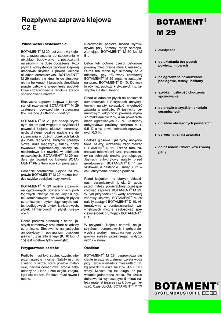 Rozpływna zaprawa klejowa C2 E Właściwości i zastosowanie: ® BOTAMENT M 29 jest zaprawą klejową z przeznaczoną do stosowania w obiektach budowlanych z posadzkami narażonymi na duże obciążenia. Rozpływna konsystencja zaprawy klejowej umożliwia szybkie i pewne klejenie ® okładzin ceramicznych. BOTAMENT M 29 nadaje się idealnie do stosowania na balkonach i tarasach. Umożliwia prawie całkowite wypełnienie podpłytkowe i zdecydowanie redukuje szkody spowodowane mrozem. Elastyczna zaprawa klejowa o konsy® stencji rozpływnej BOTAMENT M 29 zastępuje powszechnie stosowaną tzw. metodę „Buttering - Floating”. ® BOTAMENT M 29 jest specjalistycznym klejem pod względem szybkości i pewności klejenia okładzin ceramicznych, dlatego idealnie nadaje się do stosowania w dużych obiektach takich jak hale fabryczne, budynki przemysłowe, duże magazyny, sklepy, domy towarowe, supermarkety, salony samochodowe jak również w obiektach ® mieszkalnych. BOTAMENT M 29 nadaje się również do klejenia BOTA® MENT Płyta tłumiąco- kompensująca. Posadzki ceramiczne klejone na za® prawie BOTAMENT M 29 można bardzo szybko obciążać i użytkować. ® BOTAMENT M 29 można stosować na ogrzewanych powierzchniach podłogowych. Nadaje się do klejenia płytek kamionkowych, szkliwionych płytek ceramicznych, płytek ciągnionych, cotto, podłogowych płytek klinkierowych, płytek klinkierowych i płytek gresowych. Nierówności podłoża można wyrównywać przy pomocy masy samopo® ziomujące BOTAMENT M 50 lub M 51. Beton lub gotowe części betonowe powinny mieć przynajmniej 6 miesięcy. Okres ten może być skrócony do 3 miesięcy, gdy 1/3 wody zarobowej ® BOTAMENT M 29 zostanie zastąpio® na przez BOTAMENT D 10. Dotyczy to również podłoży krytycznych np. jastrychu z asfaltu lanego. Przed układaniem płytek na podłożach cementowych i jastrychach anhydrytowych należy sprawdzić wilgotność zawartą w podłożu. W jastrychu cementowym wilgotność powinna wynosić maksymalnie 2 %, a na powierzchniach ogrzewanych 1,8 %. Jastrychy anhydrytowe powinny zawierać max. 0,5 % a na powierzchniach ogrzewanych 0,3 %. Podłoża gipsowe i jastrychy anhydrytowe należy wcześniej zagruntować ® BOTAMENT D 11. Trzeba tutaj zachować odpowiedni czas przeznaczony na schnięcie środka gruntującego. Jastrych anhydrytowy należy przed ® gruntowaniem BOTAMENT D 11 zeszlifować, a następnie usunąć kurz w celu otrzymania nośnego podłoża. Przed klejeniem na starych okładzinach ceramicznych tj. ok. 24 godz. przed należy powierzchnię przeszpa® chlować zaprawą BOTAMENT M 29. W tym przypadku 1/3 wody zarobowej ® zaprawy klejowej BOTAMENT M 29 ® należy zastąpić BOTAMENT D 10. Alternatywnie w pomieszczeniach wewnętrznych można zastosować spe® cjalny środek gruntujący BOTAMENT D 15. Dobre podłoża stanowią : beton, jastrych cementowy oraz stare okładziny ceramiczne. Stosowanie na jastrychu anhydrytowym, posypanym piaskiem jastrychu z asfaltu lanego (IC 10 lub IC 15) jest możliwe tylko wewnątrz. W przypadku klejenia ceramiki na jastrychach cementowych i anhydrytowych z wodnym ogrzewaniem podłogowym należy przestrzegać wytycznych i w norm. Przygotowanie podłoża: Obróbka: Podłoże musi być suche, czyste, nieprzemarznięte i nośne. Należy usunąć z niego tłuszcze, stare powłoki malarskie, nacieki cementowe, środki antyadhezyjne i inne luźne części znajdujące się na nim. Podłoże musi równe i nośne. BOTAMENT M 29 rozprowadza się ciągle mieszając z zimną, czystą wodą przy użyciu wiertarki z mieszadłem. 25 kg proszku miesza się z ok. 4,5 - 5,0 l wody. Miesza się tak długo, aż powstanie jednorodna masa. Po czasie dojrzewania wynoszącym 5 minut należy materiał jeszcze raz krótko zamie® szać. Czas obróbki BOTAMENT M 29 ® BOTAMENT® M 29 ■ elastyczna ■ do układania bez pustek powierzchniowych ■ na ogrzewane powierzchnie podłogowe, tarasy i balkony ■ szybka możliwość chodzenia i spoinowania ■ do prawie wszystkich okładzin ceramicznych ■ do silnie obciążonych powierzchni ■ do wewnątrz i na zewnątrz ■ do basenów i zbiorników z wodą pitną BOTAMENT® M 29 Rozpływna zaprawa klejowa C2 E Baza materiałowa: kombinacja cementu z mineralnymi materiałami wypełniającymi i dodatkami tworzyw sztucznych wynosi 60 minut. Stężony materiał nie może być ponownie zamieszany i obrabiany, gdyż w przeciwnym razie nie osiągnie się końcowej trwałości. Gęstość objętościowa świeżej zaprawy: 1,6 kg/l BOTAMENT M 29 wylewa się stopniowo z wiadra, bezpośrednio na podłoże. Najpierw nanosi się cienką warstwę kontaktową przy użyciu gładkiej części pacy. Następnie pacą zębatą nakłada się zaprawę na tę świeżą warstwę kontaktową. Do nakładania powinno się stosować pacę zębatą z przynajmniej 10-milimetrowymi ząbkami lub półokrągłymi. Płytki należy ułożyć, lekko docisnąć i skorygować ich położenie. Czas układania płytek od momentu nałożenia kleju na podłoże wynosi 20 minut. Optymalna ilość wody: 18 - 20 % Proporcja mieszaniny: ® 25 kg BOTAMENT M 29: ok. 4,5 - 5,0 l wody Czas dojrzewania: 5 min. Maksymalna grubość warstwy: 20 mm Czas otwarty: Około 30 min. Czas obróbki: 60 min. Chodzenie i spoinowanie: po 3 - 6 godz. Spoinowanie: po 6 godz. Pełne obciążenie: po 24 godz. Temperatura obróbki: +5 °C do +30 °C Odporność na deszcz: po 6 godz. Środki do czyszczenia: w świeżym stanie materiału - woda, ® Wskazówki: mm). Zużycie: paca zębata 10 mm = 4,7 kg proszku/m 2 kielnia średniowarstwowa = 7,0 kg proszku/m 2 Opakowanie: 25 kg - worki papierowe Przechowywanie: Przechowywać w chłodnym i suchym miejscu. Termin przechowywania w oryginalnie zamkniętych opakowaniach wynosi 12 miesięcy. Wszystkie wymienione parametry odnoszą się do temperatury +23 °C i 50% względnej wilgotności powietrza. Wyższe temperatury i niższa wilgotność powietrza przyspiesz