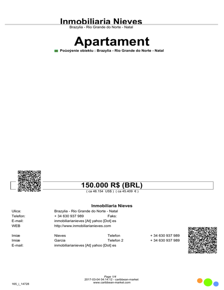 Inmobiliaria Nieves Brazylia - Rio Grande do Norte - Natal Apartament Poùoýenie obiektu : Brazylia - Rio Grande do Norte - Natal 150.000 R$ (BRL) ( ca 48.154 US$ ) ( ca 45.409 € ) Inmobiliaria Nieves Ulica: Telefon: E-mail: WEB Brazylia - Rio Grande do Norte - Natal + 34 630 937 989 Faks: inmobiliarianieves [At] yahoo [Dot] es http://www.inmobiliarianieves.com Imiæ Imiæ E-mail: Nieves Telefon Garcia Telefon 2 inmobiliarianieves [At] yahoo [Dot] es 165_i_14728 Page 1/4 2017-03-04 04:14:12 - caribbean-market www.caribbean-market.com + 34 630 937 989 + 34 630 937 989 Inmobiliaria Nieves Brazylia - Rio Grande do Norte - Natal Numer kodu Typ budynku Poùoýenie Materiaùy Property Address Powierzchnia dziaùki Firma Ýycie Kuchnia Sypialnie Zùy Opinie Toaleta 165_i_14728 Apartament Zakaz wjazdu Zakaz wjazdu Numer kodu Nr referencyjny Status objektet Rok Powierzchnia Biznes Inne Usùugi Garaý Carport zadaszony taras Akcesoria Dzierýawa Taras Balkon Jetty Pokój Party Klimatyzacja Resort Ogród Pralnia Goràcy zadaszony taras ogrodzony / murem 165_i_14728 Page 2/4 2017-03-04 04:14:12 - caribbean-market www.caribbean-market.com Zakaz wjazdu Zakaz wjazdu Inmobiliaria Nieves Brazylia - Rio Grande do Norte - Natal 165_i_14728 Page 3/4 2017-03-04 04:14:12 - caribbean-market www.caribbean-market.com Inmobiliaria Nieves Brazylia - Rio Grande do Norte - Natal 165_i_14728 Page 4/4 2017-03-04 04:14:12 - caribbean-market www.caribbean-market.com