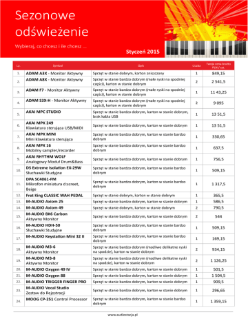 Sezonowe odświeżenie Wybieraj, co chcesz i ile chcesz ... Lp. Styczeń 2015 Symbol Opis Liczba Twoja cena brutto PLN / szt. Sprzęt w stanie dobrym, karton zniszczony 1 849,15 2. ADAM A3X - Monitor Aktywny ADAM A8X - Monitor Aktywny Sprzęt w stanie bardzo dobrym (małe ryski na spodniej części), karton w stanie dobrym 2 2 541,5 3. ADAM F7 - Monitor Aktywny Sprzęt w stanie bardzo dobrym (małe ryski na spodniej części), karton w stanie dobrym 1 11 43,25 ADAM S3X-H - Monitor Aktywny Sprzęt w stanie bardzo dobrym (małe ryski na spodniej części), karton w stanie dobrym 2 9 095 AKAI MPC STUDIO Sprzęt w stanie bardzo dobrym, karton w stanie dobrym, brak kabla USB 1 13 51,5 Sprzęt w stanie bardzo dobrym, karton w stanie dobrym 1 13 51,5 Sprzęt w stanie bardzo dobrym, karton w stanie bardzo dobrym 1 330,65 Sprzęt w stanie bardzo dobrym, karton w stanie bardzo dobrym 1 637,5 Sprzęt w stanie bardzo dobrym, karton w stanie dobrym 1 756,5 Sprzęt w stanie bardzo dobrym, karton w stanie bardzo dobrym 1 509,15 Sprzęt w stanie bardzo dobrym, karton w stanie bardzo dobrym 1 1 317,5 Sprzęt w stanie dobrym, karton w stanie dobrym 1 Sprzęt w stanie bardzo dobrym, karton w stanie dobrym 1 Sprzęt w stanie dobrym, karton w stanie dobrym 2 365,5 586,5 790,5 Sprzęt w stanie bardzo dobrym, karton w stanie dobrym 2 544 Sprzęt w stanie bardzo dobrym, karton w stanie bardzo dobrym 1 509,15 Sprzęt w stanie bardzo dobrym, karton w stanie bardzo dobrym 1 169,15 Sprzęt w stanie bardzo dobrym (możliwe delikatne ryski na spodzie), karton w stanie dobrym 2 934,15 Sprzęt w stanie bardzo dobrym (możliwe delikatne ryski na spodzie), karton w stanie dobrym 2 1 126,25 Sprzęt w stanie bardzo dobrym, karton w stanie dobrym 1 Sprzęt w stanie bardzo dobrym, karton w stanie dobrym 1 Sprzęt w stanie bardzo dobrym, karton w stanie dobrym 1 501,5 1 504,5 909,5 Sprzęt w stanie bardzo dobrym, karton w stanie dobrym 1 296,65 Sprzęt w stanie bardzo dobrym, karton w stanie bardzo dobrym 1 1 359,15 1. 4. 5. 6. 7. 8. 9. 10. 11. 12. 13. 14. 15. 16. 17. 18. 19. 20. 21. 22. 23. 24. AKAI MPK 249 Klawiatura sterująca USB/MIDI AKAI MPK MINI Mini klawiatura sterująca AKAI MPX 16 Mobilny sampler/recorder AKAI RHYTHM WOLF Analogowy Moduł Drum&Bass DS Extreme Isolation EX-29W Słuchawki Studyjne DPA SC4061-FM Mikrofon miniatura d:screet, Beige Fret King CLASSIC WAH PEDAL M-AUDIO Axiom 25 M-AUDIO Axiom 49 M-AUDIO BX6 Carbon Aktywny Monitor M-AUDIO HDH-50 Słuchawki Studyjne M-AUDIO Keystation Mini 32 II M-AUDIO M3-6 Aktywny Monitor M-AUDIO M3-8 Aktywny Monitor M-AUDIO Oxygen 49 IV M-AUDIO Oxygen 88 M-AUDIO TRIGGER FINGER PRO M-AUDIO Vocal Studio Zestaw do Rejestracji MOOG CP-251 Control Processor www.audiostacja.pl Lp. Symbol Opis Liczba Twoja cena brutto PLN / szt. Sprzęt w stanie bardzo dobrym, karton w stanie bardzo dobrym 1 1 912,5 26. MOOG MoogerFooger MF-105M MIDI MuRF MOOG Minifooger RING Sprzęt w stanie bardzo dobrym, karton w stanie bardzo dobrym 1 552,5 27. MOOG Minifooger TREM Sprzęt w stanie bardzo dobrym, karton w stanie bardzo dobrym 1 654,5 Sprzęt w stanie bardzo dobrym, karton w stanie dobrym 1 561 Sprzęt w stanie bardzo dobrym, karton w stanie dobrym 1 594,15 Sprzęt w stanie bardzo dobrym, karton w stanie dobrym 1 306 Sprzęt w stanie bardzo dobrym, karton w stanie bardzo dobrym 2 654,5 Sprzęt w stanie bardzo dobrym, karton w stanie bardzo dobrym 1 1 351,5 Sprzęt w stanie bardzo dobrym, karton w stanie bardzo dobrym 1 552,5 Sprzęt w stanie bardzo dobrym, karton w stanie bardzo dobrym 1 849,15 Sprzęt w stanie db, widoczne ślady uderzeń na padach, karton w stanie bd bardzo dobrym b 1 1 088 Sprzęt w stanie bardzo dobrym, karton w stanie bardzo dobrym 1 1 699,15 Sprzęt w stanie bardzo dobrym, karton w stanie dobrym 2 721,65 Sprzęt w stanie bardzo dobrym, karton w stanie dobrym 2 1 061,65 Sprzęt w stanie bardzo dobrym, karton w stanie bardzo dobrym 1 454,75 Sprzęt w stanie bardzo dobrym, karton w stanie bardzo dobrym 1 909,5 Sprzęt w stanie bardzo dobrym, karton w stanie bardzo dobrym 1 135,15 Sprzęt w stanie bardzo dobrym (możliwe delikatne ryski na spodzie), karton w stanie dobrym 2 2 337,5 Sprzęt w stanie bardzo dobrym (możliwe delikatne ryski na spodzie), karton w stanie dobrym 2 2 762,5 Sprzęt w stanie bardzo dobrym (możliwe delikatne ryski na spodzie), karton w stanie dobrym 2 5 695 Sprzęt w stanie bardzo dobrym (możliwe delikatne ryski na spodzie), karton w stanie dobrym 2 6 460 Sprzęt w stanie bardzo dobrym (możliwe delikatne ryski na spodzie), karton w stanie dobrym 2 6 120 Sprzęt w stanie bardzo dobrym, karton w stanie dobrym 1 2 124,15 Sprzęt w stanie bardzo dobrym, karton w stanie bardzo dobrym 1 3 901,5 Sprzęt w stanie bardzo dobrym, karton w stanie dobrym 1 4 241,5 25. 28. 29. 30. 31. 32. 33. 34. 35. 36. 37. 38. 39. 40. 41. 42. 43. 44. 45. 46. 47. 48. 49. MIDITECH Klawiatura Groovestation 49 MIDITECH Klawiatura i2 Control 1 PRO MIDITECH Klawiatura MidiStart Music 49 MXL 880 Mikrofon pojemnościowy MXL Genesis FET Mikrofon Pojemnościowy MXL Studio 1 Mikrofon pojemnościowy MXL Studio 24 Mikrofon pojemnościowy NORD PAD PRESONUS AudioBox 1818 VSL Interfejs Audio USB PRESONUS AudioBox 22 VSL Interfejs Audio USB PRESONUS AudioBox 44 VSL Interfejs Audio USB PRESONUS AudioBox iOne Interfejs Audio USB PRESONUS AudioBox iTwo Studio Zestaw Nagraniowy PreSonus HD7 Professional Monitoring Headphones PRESONUS Sceptre S6 Monitor Aktywny PRESONUS Sceptre S8 Monitor Aktywny PRESONUS SL 18S AI Subwoofer Aktywny PRESONUS SL 315 AI Aktywna Kolumna Trójdrożna PRESONUS SL 328 AI Aktywna Kolumna Trójdrożna RME Babyface Silver Interfejs Audio USB RME Ferrofish A16 MKII Konwerter AD/DA MADI RME FireFace UCX Interfejs Audio USB / FireWire www.audiostacja.pl Lp. 50. 51. 52. 53. 54. 55. 56. 57. 58. 59. 60. 61. 62. 63. 64. 65. 66. 67. 68. 69. 70. 71. 72. 73. 74. 75. Opis Liczba Twoja cena brutto PLN / szt. RME HDSPe RayDAT RODE Classic II Mikrofon lampowy RODE HS1 Black Mikrofon nag