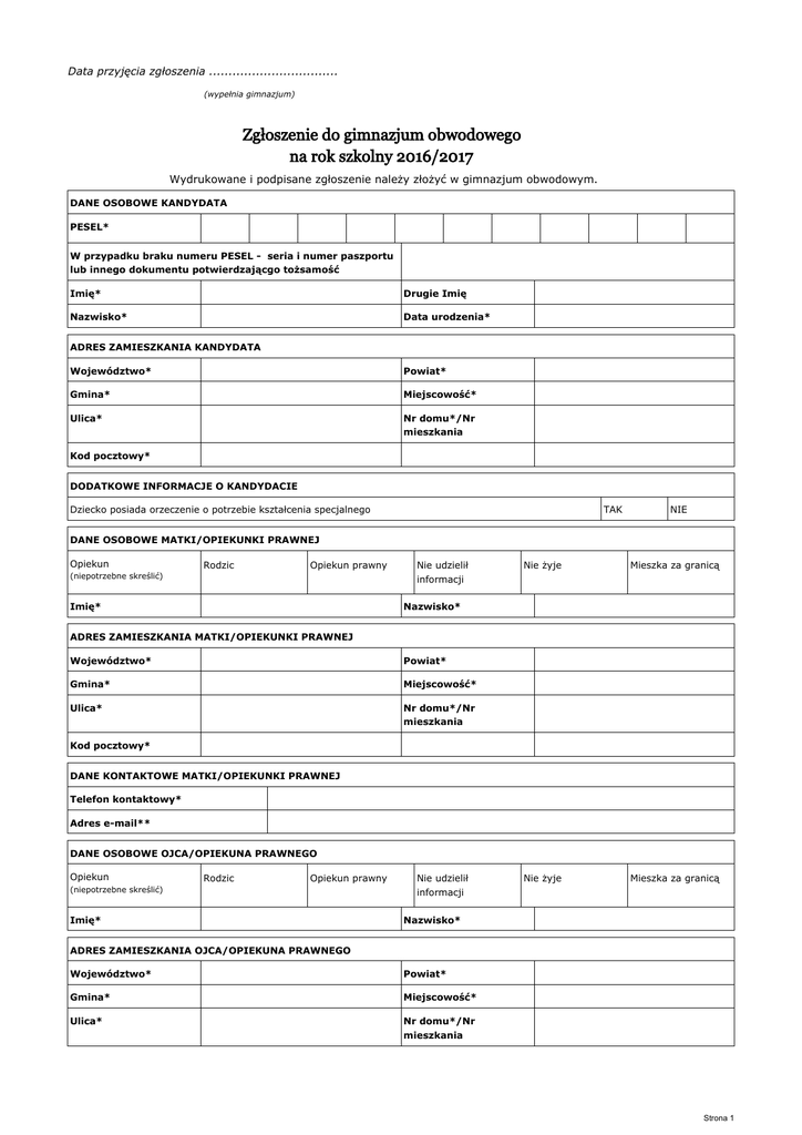 Zgłoszenie do gimnazjum obwodowego na rok szkolny 2016/2017