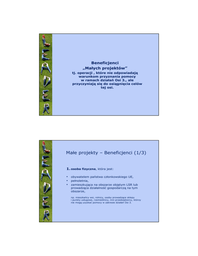 Beneficjenci „Małych projektów” tj. operacji , które nie odpowiadają warunkom przyznania pomocy w ramach działań Osi 3., ale przyczyniają się do osiągnięcia celów tej osi. Małe projekty – Beneficjenci (1/3) 1. osoba fizyczna, która jest: • obywatelem państwa członkowskiego UE, • pełnoletnia, • zamieszkująca na obszarze objętym LSR lub prowadząca działalność gospodarczą na tym obszarze, np. mieszkańcy wsi, rolnicy, osoby prowadzące sklepy i punkty usługowe, rzemieślnicy, inni przedsiębiorcy, którzy nie mogą uzyskać pomocy w zakresie działań Osi 3. Małe projekty – Beneficjenci (2/3) 2. osoby prawne albo jednostki organizacyjne nieposiadające osobowość prawną, którym ustawy przyznają zdolność prawną: a. działające na podstawie przepisów o stosunku Państwa do Kościoła Katolickiego w Rzeczypospolitej Polskiej, o stosunku Państwa do innych kościołów i związków wyznaniowych oraz o gwarancjach wolności sumienia i wyznania, które posiadają siedzibę na obszarze objętym LSR lub prowadzą działalność na tym obszarze; np. instytucje kościelne (Caritas), parafie, inne związki wyznaniowe … Małe projekty – Beneficjenci (3/3) 2. osoby prawne albo jednostki organizacyjne nieposiadające osobowości prawnej, którym ustawy przyznają zdolność prawną: b) utworzone na podstawie przepisów ustaw, w tym fundacje albo stowarzyszenia, które posiadają siedzibę na obszarze objętym LSR lub prowadzą działalność na tym obszarze. Osoby prawne np..: • Stowarzyszenia zarejestrowane w KRS (w tym KGW, OSP), • Fundacje, • Instytucje kultury, w tym biblioteki, muzea, orkiestry - jednostki organizacyjne jst utworzone na podstawie ustawy z dnia 25 października 1991 r. (Dz. U. Nr 114, poz. 493) o organizowaniu i prowadzeniu działalności kulturalnej, Uwaga! JeŜeli w/w. instytucje działają na podstawie innych ustaw naleŜy kaŜdy przypadek rozpatrywać indywidualnie, • Wspólnoty gruntowe – ustawa z dnia 29 czerwca 1963 r. o zagospodarowaniu wspólnot gruntowych (Dz.U. Nr 28, poz. 169), • Uczniowskie kluby sportowe, • Instytuty PAN – Art. 46 ustawy z dnia 25 kwietnia 1997 o Polskiej Akademii Nauk (Dz.U. z 1997 Nr 75 poz. 469 z późn. zm), • Spółdzielnie mieszkaniowe Ustawa z dnia 16 września 1982 r. Prawo spółdzielcze (tekst jednolity: Dz. U. z 2003 r. Nr 188, poz. 1848); Ustawa z dnia 15 grudnia 2000 r. o spółdzielniach mieszkaniowych (Dz. U. z 2001 r. Nr 4, poz. 27, z późn. zm.), • Spółka wodna – Prawo wodne, • SPZOZ. Jednostki organizacyjne nieposiadające osobowości prawnej, którym ustawy przyznają zdolność prawną: •Wspólnota mieszkaniowa, •Spółka jawna, •Spółka partnerska, •Spółka komandytowa, •Spółka komandytowo-akcyjna, •Spółka akcyjna w organizacji, •Spółka z o.o. w organizacji, •Europejskie zgrupowanie interesów gospodarczych, Z pomocy nie mogą skorzystać : Jednostki organizacyjne, którym ustawy nie nadają zdolności prawnej np. : szkoły publiczne, przedszkola publiczne, parki narodowe i krajobrazowe, Lasy Państwowe (w tym nadleśnictwa), KGW nierejestrowe, OSP nierejestrowe, sołectwa, Dziękuję za uwagę.