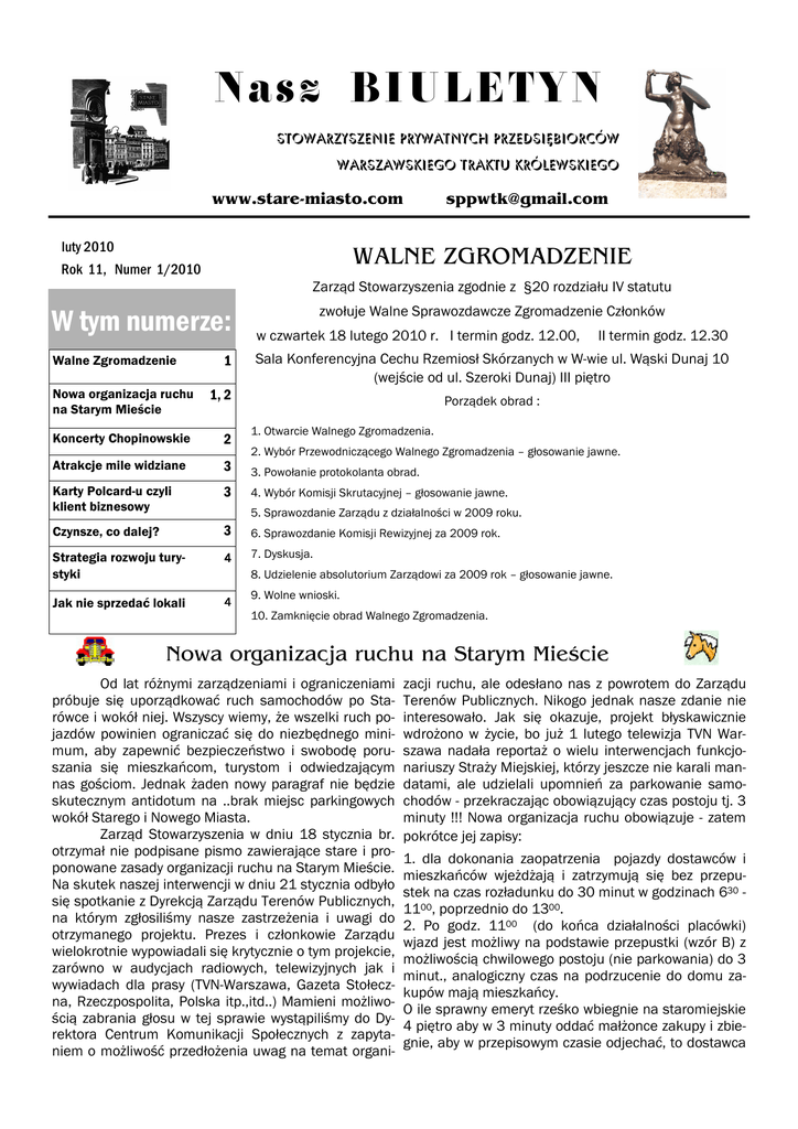 N a s z B I U L E TY N STOWARZYSZENIE PRYWATNYCH PRZEDSIĘBIORCÓW WARSZAWSKIEGO TRAKTU KRÓLEWSKIEGO www.stare-miasto.com luty 2010 [email protected] WALNE ZGROMADZENIE Rok 11, Numer 1/2010 Zarząd Stowarzyszenia zgodnie z §20 rozdziału IV statutu W tym numerze: Walne Zgromadzenie 1 zwołuje Walne Sprawozdawcze Zgromadzenie Członków w czwartek 18 lutego 2010 r. I termin godz. 12.00, II termin godz. 12.30 Sala Konferencyjna Cechu Rzemiosł Skórzanych w W-wie ul. Wąski Dunaj 10 (wejście od ul. Szeroki Dunaj) III piętro Nowa organizacja ruchu na Starym Mieście 1, 2 Koncerty Chopinowskie 2 Atrakcje mile widziane 3 3. Powołanie protokolanta obrad. Karty Polcard-u czyli klient biznesowy 3 4. Wybór Komisji Skrutacyjnej – głosowanie jawne. Czynsze, co dalej? 3 6. Sprawozdanie Komisji Rewizyjnej za 2009 rok. Strategia rozwoju turystyki 4 7. Dyskusja. Jak nie sprzedać lokali 4 Porządek obrad : 1. Otwarcie Walnego Zgromadzenia. 2. Wybór Przewodniczącego Walnego Zgromadzenia – głosowanie jawne. 5. Sprawozdanie Zarządu z działalności w 2009 roku. 8. Udzielenie absolutorium Zarządowi za 2009 rok – głosowanie jawne. 9. Wolne wnioski. 10. Zamknięcie obrad Walnego Zgromadzenia. Nowa organizacja ruchu na Starym Mieście Od lat różnymi zarządzeniami i ograniczeniami próbuje się uporządkować ruch samochodów po Starówce i wokół niej. Wszyscy wiemy, że wszelki ruch pojazdów powinien ograniczać się do niezbędnego minimum, aby zapewnić bezpieczeństwo i swobodę poruszania się mieszkańcom, turystom i odwiedzającym nas gościom. Jednak żaden nowy paragraf nie będzie skutecznym antidotum na ..brak miejsc parkingowych wokół Starego i Nowego Miasta. Zarząd Stowarzyszenia w dniu 18 stycznia br. otrzymał nie podpisane pismo zawierające stare i proponowane zasady organizacji ruchu na Starym Mieście. Na skutek naszej interwencji w dniu 21 stycznia odbyło się spotkanie z Dyrekcją Zarządu Terenów Publicznych, na którym zgłosiliśmy nasze zastrzeżenia i uwagi do otrzymanego projektu. Prezes i członkowie Zarządu wielokrotnie wypowiadali się krytycznie o tym projekcie, zarówno w audycjach radiowych, telewizyjnych jak i wywiadach dla prasy (TVN-Warszawa, Gazeta Stołeczna, Rzeczpospolita, Polska itp.,itd..) Mamieni możliwością zabrania głosu w tej sprawie wystąpiliśmy do Dyrektora Centrum Komunikacji Społecznych z zapytaniem o możliwość przedłożenia uwag na temat organi- zacji ruchu, ale odesłano nas z powrotem do Zarządu Terenów Publicznych. Nikogo jednak nasze zdanie nie interesowało. Jak się okazuje, projekt błyskawicznie wdrożono w życie, bo już 1 lutego telewizja TVN Warszawa nadała reportaż o wielu interwencjach funkcjonariuszy Straży Miejskiej, którzy jeszcze nie karali mandatami, ale udzielali upomnień za parkowanie samochodów - przekraczając obowiązujący czas postoju tj. 3 minuty !!! Nowa organizacja ruchu obowiązuje - zatem pokrótce jej zapisy: 1. dla dokonania zaopatrzenia pojazdy dostawców i mieszkańców wjeżdżają i zatrzymują się bez przepustek na czas rozładunku do 30 minut w godzinach 630 1100, poprzednio do 1300. 2. Po godz. 1100 (do końca działalności placówki) wjazd jest możliwy na podstawie przepustki (wzór B) z możliwością chwilowego postoju (nie parkowania) do 3 minut., analogiczny czas na podrzucenie do domu zakupów mają mieszkańcy. O ile sprawny emeryt rześko wbiegnie na staromiejskie 4 piętro aby w 3 minuty oddać małżonce zakupy i zbiegnie, aby w przepisowym czasie odjechać, to dostawca 2 ...czyli organizacja braku dostaw (Ciąg dalszy ze strony 1) napojów, czy chleba, a także dań wykwintnych - w trzy minuty ledwo odczyta fakturę. Taka to dzisiejsza młodzież powiemy z humorem. Ale wszystko to jest mało śmieszne w zetknięciu z codziennymi realiami. Jeszcze niedawno Straż Miejska ścigała każdego dostawcę, za minimalne przekroczenie czasu dozwolonego postoju na rozładunek, ale „konia z rzędem - temu” jak mawiali nasi przodkowie, kto w trzy minuty rozładuje, wniesie do magazynu i jeszcze zdąży wręczyć fakturę, której zapis zgadza się z dostawą. Nie ważne czy przywiózł kilka kartoników, czy kilka palet np. napojów - i tak nie zdąży. Ciekawe czy w 3 minuty dostanie mandat czy w 5. Kolejny nieżyciowy przepis, kolejne utrudnienia i kolejny pretekst albo do restrykcji albo do „przymykania oka”. Trzeba dbać o zabytkową substancję naszego miasta, ale równocześnie trzeba dać szansę normalnego funkcjonowania placówek gastronomicznych czy kulturalnych (bo i do galerii obrazów nikt nie „wrzuci” w 3 minuty). Przepisy i zakazy nie rozwiążą tego co zaniedbane latami - brak miejsc parkingowych nie tylko dla mieszkańców, ale dla odwiedzających nas turystów. I druga „oczywista oczywistość”, po to żeby sklepy, restauracje czy punkty usługowe działały - muszą mieć towar. Na naszym Walnym Zgromadzeniu zastanowimy się wspólnie czy nie wystąpić przeciwko temu dziwnemu (3-minutowemu) zarządzeniu do Wojewódzkiego Sądu Administracyjnego. Będziemy w tym zakresie współdziałać z Samorządem Mieszkańców, bo ich też nikt o zdanie nie pytał. Chopin - patronem koncertów staromiejskich Projektów ożywienia Starówki, przyciągnięcia turystów i mieszkańców Stolicy, a nawet uczynienie miejsc zabytkowych - miejscem spotkań z kulturą i sztuką, zawsze przyświecał wszelkim działaniom naszego Stowarzyszenia. Przyzwyczailiśmy się już do roli marudzącego inicjatora, bo czasem odnosimy wrażenie, że jakieś działania władze miejskie podejmują, ale z wieloletnim namysłem, albo bardzo sporadycznie i bez szerszych planów. Przez wiele lat jedyną imprezą kulturalną przyciągającą rzesze warszawiaków, były koncerty jazzowe. Ulicznych grajków, czy hiphopowe żebraniny, trudno to tej sfery zaliczyć. Po wielu staraniach, rozmowach i negocjacjach, a przede wszystkim chyba dzięki temu że obchodzimy aktualnie ROK 