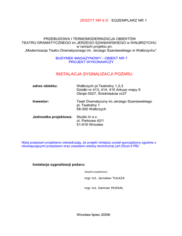ZESZYT NR 6 D EGZEMPLARZ NR 1 PRZEBUDOWA I TERMOMODERNIZACJA OBIEKTÓW TEATRU DRAMATYCZNEGO im.JERZEGO SZANIAWSKIEGO w WAŁBRZYCHU w ramach projektu pn. „Modernizacja Teatru Dramatycznego im. Jerzego Szaniawskiego w Wałbrzychu” BUDYNEK MAGAZYNOWY - OBIEKT NR 7 PROJEKT WYKONAWCZY INSTALACJA SYGNALIZACJI POŻARU adres obiektu: Wałbrzych pl.Teatralny 1,2,3 Działki nr 413, 414, 415 Arkusz mapy 9 Obręb 0027, Śródmieście nr27 Inwestor: Teatr Dramatyczny im.Jerzego Szaniawskiego pl. Teatralny 1 58-300 Wałbrzych Jednostka projektowa: Studio In s.c. ul. Parkowa 42/1 51-616 Wrocław Niżej podpisani projektanci oświadczają, że projekt niniejszy został sporządzony zgodnie z obowiązującymi przepisami oraz zasadami wiedzy technicznej (art.20ust.4 PB) Instalacja sygnalizacji pożaru: Zespół projektowy: mgr inż. Jarosław TUŁAZA mgr inż. Damian MUSIAŁ Wrocław lipiec 2009r TEATR DRAMATYCZNY im. Jerzego Szaniawskiego w Wałbrzychu, pl. Teatralny 1 - SYSTEM SYGNALIZACJI POŻARU – BUDYNEK 7 SPIS TREŚCI DO PROJEKTU WYKONAWCZEGO SYSTEMU SYGNALIZACJI POŻARU 1. SYSTEM SYGNALIZACJI POŻARU ..................................................... 3 1.1 Podstawa Techniczno – Prawna Opracowania .................. 3 1.2 Przedmiot Opracowania ...................................................... 3 1.3 Zakres Rzeczowy Opracowania .......................................... 4 1.4 Stan istniejący ..................................................................... 4 1.5 Zagadnienia Ochrony Przeciwpożarowej .......................... 4 1.6 Przyjęty System Sygnalizacji .............................................. 4 1.7 Centrala Sygnalizacji Pożaru - Pętle I Linie Dozorowe ...... 4 1.8.1 Optyczne czujki dymu z technologią ASA ...................... 5 1.8.2 Optyczne czujki dymu ..................................................... 6 1.8.3 Wskaźniki zadziałania ...................................................... 7 1.9 Ręczne Ostrzegacze Pożarowe ........................................... 7 1.10. Sygnalizatory Akustyczne ................................................ 8 1.11. Zasilanie ........................................................................... 10 2.1.1. Uwagi Końcowe .............................................................. 11 3.0. CERTYFIKATY I DEKLARACJE ZGODNOŚCI ................................. 12 4.1 WYKONANIE INSTALACJI ............................................................... 18 4.1.1. Uwagi końcowe ................................................................ 18 SPIS RYSUNKÓW Nr rys. Tytuł rysunku 7/1 SYSTEM SAP – RZUT PARTERU: BUDYNEK 7 S0 SYSTEM SAP – SCHEMAT BLOKOWY 2 TEATR DRAMATYCZNY im. Jerzego Szaniawskiego w Wałbrzychu, pl. Teatralny 1 - SYSTEM SYGNALIZACJI POŻARU – BUDYNEK 7 1. SYSTEM SYGNALIZACJI POŻARU 1.1 Podstawa Techniczno – Prawna Opracowania Zlecenie Inwestora Część architektoniczno-budowlana opracowania Uzgodnienia z Użytkownikiem Komenda Główna Straży Pożarnej - Warunki dla systemów wykrywania pożaru zainstalowanych w nadzorowanych obiektach(BZ-IV-6/44/93)Warszawa 01.09.1993r. "Warunki techniczne wykonania i odbioru robót budowlano montażowych" cz.V - Instalacje elektryczne. Materiały do projektowania: PKN–CEN/TS 54-14 Specyfikacja Techniczna - Systemy sygnalizacji pożarowej część 14 "Podstawowe zasady projektowania instalacji sygnalizacji pożarowej" CNBOP. 1995r. (zwane w treści opracowania "zasadami") „Wstęp do automatycznych systemów sygnalizacji pożarowej” – CNBOP 1996 Obowiązujące przepisy i normy. 1) Ustawa z dnia 24.08.1991r. o ochronie przeciwpożarowej 3) Rozporządzenie MSWiA z dnia 21.04.2006r. w sprawie ochrony przeciwpożarowej budynków, innych obiektów budowlanych i terenów 4) Rozporządzenie MSWiA z dnia 16.06.2003r. w sprawie zakresu , trybu i zasad uzgadniania projektu budowlanego pod względem ochrony przeciwpożarowej 5) Rozporządzenie MSWiA z dnia 22 kwietnia 1998 r. w sprawie wyrobów służących do ochrony przeciwpożarowej, które mogą być wprowadzane do obrotu i stosowane wyłącznie na podstawie certyfikatu zgodności. 6) Rozporządzenie Ministra Infrastruktury z dnia 12.04.2002r. w sprawie warunków technicznych, jakim powinny odpowiadać budynki i ich usytuowanie 7) Rozporządzenie Ministra Infrastruktury z dnia 2 września 2004r. w sprawie szczegółowego zakresu i formy dokumentacji projektowej, specyfikacji technicznych wykonania i odbioru robót budowlanych oraz programu funkcjonalno – użytkowego (Dz.U. nr 202, poz.2072 z pózn. Zmianami) 1.2 Przedmiot Opracowania Przedmiotem niniejszego opracowania jest budowa instalacji systemu wykrywania i sygnalizacji pożaru w Budynku Magazynowym(7) należących do Teatru Dramatycznego w Wałbrzychu. Adres inwestycji : TEATR DRAMATYCZNY im. Jerzego Szaniawskiego 58-300 WAŁBRZYCH , pl. Teatralny 1 Budynek nr 7 Inwestor : TEATR DRAMATYCZNY im. Jerzego Szaniawskiego 58-300 WAŁBRZYCH , pl. Teatralny 1 3 TEATR DRAMATYCZNY im. Jerzego Szaniawskiego w Wałbrzychu, pl. Teatralny 1 - SYSTEM SYGNALIZACJI POŻARU – BUDYNEK 7 1.3 Zakres Rzeczowy Opracowania Opracowanie obejmuje instalacje systemu sygnalizacji pożaru w budynku Magazynowym znajdujących się w kompleksie budynków Teatru Dramatycznego. Zabezpieczeniu podlegają wszystkie pomieszczenia magazynowe i projektowana kotłownia. 1.4 Stan istniejący W budynku znajduje się system sygnalizacji pożaru z czujnikami jonizacyjnymi. System ten wymaga demontażu i utylizacji czujników jonizacyjnych przez specjalistyczny serwis. 1.5 Zagadnienia Ochrony Przeciwpożarowej W zakresie ochrony przeciwpożarowej budynek został zakwalifikowany do kategorii zagrożenia ludzi ZL III. Budynek nie wymaga wyposażenia w dźwiękowy system ostrzegania DSO Budynek nie wymaga instalacji systemu sygnalizacji pożaru oraz połączenia z JG PSP, Ewentualne połączenie systemu sygnalizacji pożaru z Państwową Strażą Pożarną pozostaje w gestii właściciela obiek
