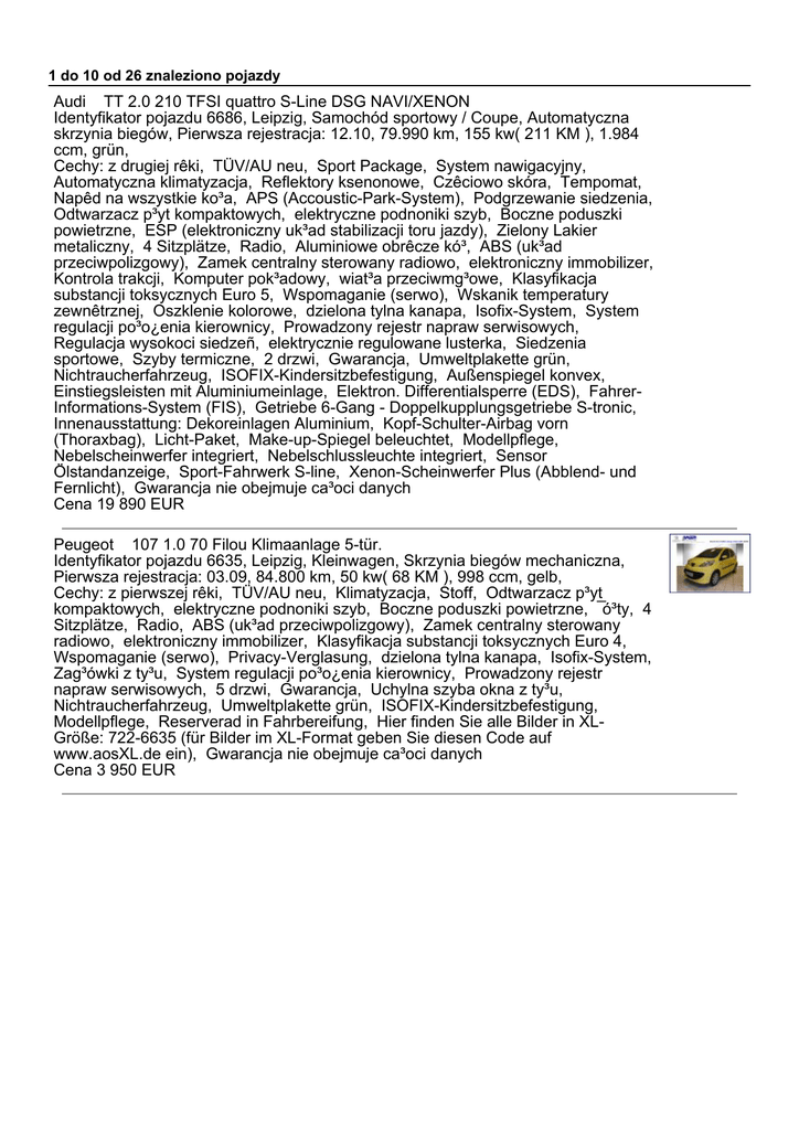 1 do 10 od 26 znaleziono pojazdy Audi TT 2.0 210 TFSI quattro S-Line DSG NAVI/XENON Identyfikator pojazdu 6686, Leipzig, Samochód sportowy / Coupe, Automatyczna skrzynia biegów, Pierwsza rejestracja: 12.10, 79.990 km, 155 kw( 211 KM ), 1.984 ccm, grün, Cechy: z drugiej rêki, TÜV/AU neu, Sport Package, System nawigacyjny, Automatyczna klimatyzacja, Reflektory ksenonowe, Czêciowo skóra, Tempomat, Napêd na wszystkie ko³a, APS (Accoustic-Park-System), Podgrzewanie siedzenia, Odtwarzacz p³yt kompaktowych, elektryczne podnoniki szyb, Boczne poduszki powietrzne, ESP (elektroniczny uk³ad stabilizacji toru jazdy), Zielony Lakier metaliczny, 4 Sitzplätze, Radio, Aluminiowe obrêcze kó³, ABS (uk³ad przeciwpolizgowy), Zamek centralny sterowany radiowo, elektroniczny immobilizer, Kontrola trakcji, Komputer pok³adowy, wiat³a przeciwmg³owe, Klasyfikacja substancji toksycznych Euro 5, Wspomaganie (serwo), Wskanik temperatury zewnêtrznej, Oszklenie kolorowe, dzielona tylna kanapa, Isofix-System, System regulacji po³o¿enia kierownicy, Prowadzony rejestr napraw serwisowych, Regulacja wysokoci siedzeñ, elektrycznie regulowane lusterka, Siedzenia sportowe, Szyby termiczne, 2 drzwi, Gwarancja, Umweltplakette grün, Nichtraucherfahrzeug, ISOFIX-Kindersitzbefestigung, Außenspiegel konvex, Einstiegsleisten mit Aluminiumeinlage, Elektron. Differentialsperre (EDS), FahrerInformations-System (FIS), Getriebe 6-Gang - Doppelkupplungsgetriebe S-tronic, Innenausstattung: Dekoreinlagen Aluminium, Kopf-Schulter-Airbag vorn (Thoraxbag), Licht-Paket, Make-up-Spiegel beleuchtet, Modellpflege, Nebelscheinwerfer integriert, Nebelschlussleuchte integriert, Sensor Ölstandanzeige, Sport-Fahrwerk S-line, Xenon-Scheinwerfer Plus (Abblend- und Fernlicht), Gwarancja nie obejmuje ca³oci danych Cena 19 890 EUR Peugeot 107 1.0 70 Filou Klimaanlage 5-tür. Identyfikator pojazdu 6635, Leipzig, Kleinwagen, Skrzynia biegów mechaniczna, Pierwsza rejestracja: 03.09, 84.800 km, 50 kw( 68 KM ), 998 ccm, gelb, Cechy: z pierwszej rêki, TÜV/AU neu, Klimatyzacja, Stoff, Odtwarzacz p³yt kompaktowych, elektryczne podnoniki szyb, Boczne poduszki powietrzne, ¯ó³ty, 4 Sitzplätze, Radio, ABS (uk³ad przeciwpolizgowy), Zamek centralny sterowany radiowo, elektroniczny immobilizer, Klasyfikacja substancji toksycznych Euro 4, Wspomaganie (serwo), Privacy-Verglasung, dzielona tylna kanapa, Isofix-System, Zag³ówki z ty³u, System regulacji po³o¿enia kierownicy, Prowadzony rejestr napraw serwisowych, 5 drzwi, Gwarancja, Uchylna szyba okna z ty³u, Nichtraucherfahrzeug, Umweltplakette grün, ISOFIX-Kindersitzbefestigung, Modellpflege, Reserverad in Fahrbereifung, Hier finden Sie alle Bilder in XLGröße: 722-6635 (für Bilder im XL-Format geben Sie diesen Code auf www.aosXL.de ein), Gwarancja nie obejmuje ca³oci danych Cena 3 950 EUR Peugeot 2008 1.6 100 BlueHDi St&St Allure Navi/Glasdach Identyfikator pojazdu 6599, Leipzig, Pojazd terenowy / Pikap, Skrzynia biegów mechaniczna, Pierwsza rejestracja: 02.16, 19.950 km, 73 kw( 99 KM ), 1.560 ccm, grau, Cechy: z pierwszej rêki, TÜV/AU neu, System nawigacyjny, Automatyczna klimatyzacja, Abbiegelicht, Stoff/Kunstleder, Tempomat, Einpark-Assistent selbstlenkend, Elektryczne podnoniki 4 szyb, Poduszki powietrzne nadokienne i chroni¹ce g³owê, ESP (elektroniczny uk³ad stabilizacji toru jazdy), platinium grau Lakier metaliczny, 5 Sitzplätze, Radio, Aluminiowe obrêcze kó³, ABS (uk³ad przeciwpolizgowy), Zamek centralny sterowany radiowo, elektroniczny immobilizer, Kontrola trakcji, Komputer pok³adowy, wiat³a przeciwmg³owe, Klasyfikacja substancji toksycznych Euro 6, Parametryczny uk³ad kierowniczy, Wskanik temperatury zewnêtrznej, Oszklenie kolorowe, Uchwyt na kubek, Reling dachowy, dzielona tylna kanapa, Isofix-System, Zag³ówki z ty³u, Ko³o kierownicy pokryte skór¹, System regulacji po³o¿enia kierownicy, Czujnik deszczu, elektryczny uk³ad kontroli cinienia w oponach, Prowadzony rejestr napraw serwisowych, Regulacja wysokoci siedzeñ, Siedzenia sportowe, Bluetooth Freisprecheinrichtung, 5 drzwi, Gwarancja, Napêd na ko³a przednie, Rozstaw osi kó³ (mm) 2 538 mm, Podgrzewane, sk³adane lusterko elektryczne, Filtr cz¹stek oleju napêdowego, Umweltplakette grün, Motor-Start-Stop-Funktion, Nichtraucherfahrzeug, Tagfahrlicht, Scheiben hinten abgedunkelt, ISOFIX-Kindersitzbefestigung, Panoramaglasdach, Airbag Beifahrerseite abschaltbar, Ambiente-Beleuchtung LED, Außenspiegel ele.verstell-heiz-u.anklappbar, Bremsassistent, City-Paket, Fahrassistenz-System: Park-Assistent (Parklückendetektor), Panoramadach (Glas), Schaltpunktanzeige, SCR-System (AdBlue-Technologie), Sichtpaket, WIP -Bluetooth, Zierleisten Kühlergrill (Chrom), Hier finden Sie alle Bilder in XL-Größe: 722-6599 (für Bilder im XL-Format geben Sie diesen Code auf www.aosXL.de ein), Gwarancja nie obejmuje ca³oci danych Cena 14 990 EUR Mo¿liwoæ odzyskania VAT Peugeot 2008 1.2 82 VTi / PureTech Active NAVI/PDC/Klima Identyfikator pojazdu 6600, Leipzig, Pojazd terenowy / Pikap, Skrzynia biegów mechaniczna, Pierwsza rejestracja: 03.16, 23.400 km, 60 kw( 82 KM ), 1.199 ccm, schwarz, Cechy: z pierwszej rêki, TÜV/AU neu, System nawigacyjny, Klimatyzacja, Kurvenlicht, Stoff, Tempomat, PDC (uk³ad kontroli odleg³oci podczas parkowania), Elektryczne podnoniki 4 szyb, Poduszki powietrzne nadokienne i chroni¹ce g³owê, ESP (elektroniczny uk³ad stabilizacji toru jazdy), perla nera schwarz Lakier metaliczny, 5 Sitzplätze, Radio, Aluminiowe obrêcze kó³, ABS (uk³ad przeciwpolizgowy), Zamek centralny sterowany radiowo, elektroniczny immobilizer, Kontrola trakcji, Komputer pok³adowy, wiat³a przeciwmg³owe, Klasyfikacja substancji toksycznych Euro 6, Parametryczny uk³ad kierowniczy, Wskanik temperatury zewnêtrznej, Oszklenie kolorowe, Reling dachowy, dzielona tylna kanapa, Isofix-System, Ko³o kierownicy pokryte skór¹, System regulacji po³o¿enia kierownicy, Czujnik deszczu, Prowadzony rejestr n
