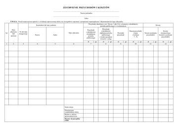 ZESTAWIENIE PRZYCHODÓW I KOSZTÓW ......................................................................................................................................................... Nazwa podatnika ......................................................................................................................................................... Adres UWAGA: Przed rozpoczęciem zapisów w ewidencji uproszczonej należy się szczegółowo zapoznać z przepisami rozporządzenia i objaśnieniami do tego załącznika. Przychody określone w art. 10a ust. 1 pkt 4 lit. a-d ustawy o działalności pożytku publicznego i o wolontariacie Kontrahent lub inny podmiot Lp. Data zdarzenia lub operacji Nr dowodu księgowego 2 3 Opis zdarzenia Nazwa Adres 4 5 Przychody z działalności nieodpłatnej pożytku publicznego zł 1 6 Suma strony Przeniesienie z poprzedniej strony Razem w okresie sprawozdawczym Razem od początku roku gr 7 Przychody z działalności odpłatnej pożytku publicznego z tytułu sprzedaży towarów i usług zł gr 8 Razem przychody (suma z kolumn 7 - 9) Pozostałe przychody zł gr 9 Koszty zł gr 10 Koszty uzyskania przychodów zł gr 11 Koszty niestanowiące kosztów uzyskania przychodów zł gr 12 Objaśnienia do Zestawienia przychodów i kosztów 1. W kolumnie 1 należy wpisać kolejny numer zapisów w ewidencji. Tym samym numerem należy oznaczyć dowód księgowy stanowiący podstawę dokonania zapisu. 2. W kolumnie 2 należy wpisywać dzień miesiąca wynikający z dokumentu stanowiącego podstawę dokonywania wpisu (datę poniesienia wydatku, otrzymania towaru lub uzyskania przychodu, w tym otrzymania pieniędzy, wartości pieniężnych, różnic kursowych, albo datę zestawienia sprzedaży). 3. W kolumnie 3 należy wpisywać numer faktury lub innego dowodu księgowego. Jeżeli zapisów dokonuje się na podstawie dziennego zestawienia sprzedaży, należy wpisywać numer zestawienia faktur. 4. W kolumnach 4 i 5 należy wpisać nazwy oraz adresy kontrahentów (dostawców lub odbiorców) i innych podmiotów, z którymi zawarte zostały umowy oraz transakcje w tym dotyczące zakupu materiałów, towarów itp. lub sprzedaży towarów. Kolumn tych nie wypełnia się w wypadku zapisów dotyczących przychodu ze sprzedaży na podstawie dziennych zestawień sprzedaży oraz dowodów wewnętrznych. 5. W kolumnie 6 należy zwięźle opisać istotę dokonanego zdarzenia, np. działanie na rzecz ochrony i promocji zdrowia, porządku i bezpieczeństwa publicznego, odsetki od depozytów, przychody z najmu itp. 6. W kolumnie 7 należy wpisać przychody z działalności nieodpłatnej pożytku publicznego z tytułu składek członkowskich, darowizn, zapisów, spadków, dotacji, subwencji, przychody pochodzące z ofiarności publicznej. 7. W kolumnie 8 należy wpisać przychody z działalności odpłatnej pożytku publicznego z tytułu sprzedaży towarów i usług. 8. W kolumnie 9 należy wpisać pozostałe przychody, wymienione w art. 10a ust. 1 pkt 4 lit. c i d ustawy o działalności pożytku publicznego i o wolontariacie. 9. W kolumnie 10 należy wpisać łączną kwotę przychodów wpisanych w kolumnach 7 - 9. 10. W kolumnie 11 należy wpisać koszty uzyskania przychodów w rozumieniu art. 15 ustawy o podatku dochodowym od osób prawnych, dotyczące przychodów wpisanych w kolumnie 7 - 9. 11. W kolumnie 12 należy wpisać koszty niestanowiące kosztów uzyskania przychodów na podstawie art. 16 ust. 1 ustawy o podatku dochodowym od osób prawnych oraz niestanowiące kosztów uzyskania przychodów wydatki pokryte z dochodów zwolnionych od podatku. 12. Po zakończeniu okresu sprawozdawczego wpisy dokonane w danym okresie sprawozdawczym należy podkreślić, a dane z kolumn 7 - 12 zsumować. Wynikłe z podsumowania kwoty należy podkreślić. 13. Podatnik po podsumowaniu danego okresu sprawozdawczego wpisuje w poszczególnych kolumnach sumy od początku roku do okresu sprawozdawczego poprzedzającego dany okres sprawozdawczy i w kolejnej pozycji wpisuje (narastająco) w poszczególnych kolumnach sumę od początku roku.