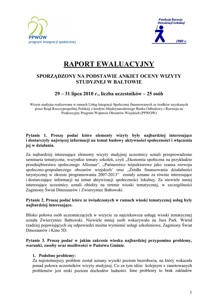RAPORT EWALUACYJNY SPORZĄDZONY NA PODSTAWIE ANKIET OCENY WIZYTY STUDYJNEJ W BAŁTOWIE 29 – 31 lipca 2010 r., liczba uczestników – 25 osób Wizyta studyjna realizowana w ramach Usług Integracji Społecznej finansowanych ze środków uzyskanych przez Rząd Rzeczypospolitej Polskiej z kredytu Międzynarodowego Banku Odbudowy i Rozwoju na Poakcesyjny Program Wsparcia Obszarów Wiejskich (PPWOW) Pytanie 1. Proszę podać które elementy wizyty były najbardziej interesujące i dostarczyły najwięcej informacji na temat budowy aktywności społeczności i włączenia jej w działania. Za najbardziej interesujące elementy wizyty studyjnej uczestnicy uznali przeprowadzone seminaria tematyczne, wszystkie tematy szkoleń, czyli „Ekonomia społeczna na przykładzie przedsiębiorstwa społecznego Allozaur”, „Partnerstwo trójsektorowe jako szansa rozwoju społeczno-gospodarczego obszarów wiejskich’ oraz „Źródła finansowania działalności turystycznej w okresie programowania 2007-2013” zostały uznane za równie interesujące i dostarczające informacji na temat aktywizacji społeczności lokalnej. Za niewiele mniej interesujące uczestnicy uznali obiekty na terenie wioski tematycznej, w szczególności Zaginiony Świat Dinozaurów i Zwierzyniec Bałtowski. Pytanie 2. Proszę podać które ze świadczonych w ramach wioski tematycznej usług były najbardziej interesujące. Blisko połowa osób uczestniczących w wizycie za najciekawsza usługę wioski tematycznej uznała Zwierzyniec Bałtowski. Niewiele mniej osób wskazywało na Jura Park. Wśród rzadziej pojawiających się odpowiedzi można wymienić usługi szkoleniowe, Zaginiony Świat Dinozaurów i Kino 5D. Pytanie 3. Proszę podać w jakim zakresie wioska najbardziej przypomina problemy, warunki, zasoby oraz możliwości w Państwa Gminie. 1. Podobne problemy: Za najistotniejszy problem został uznany wysoki poziom bezrobocia, na który wskazała ponad połowa uczestników wizyty studyjnej. Co za tym idzie kolejnym z zanotowanych problemów jest niski poziom dochodów ludności. Inne problemy to brak zakładów 1 przemysłowych, słabo rozwinięty sektor rolniczy i niedostateczna infrastruktura techniczna. 2. Podobne warunki/zasoby Wśród podobnych zasobów zauważono przede wszystkim bogate zasoby środowiska naturalnego, szczególnie sąsiedztwo rzeki, ciekawe walory turystyczne, ukształtowanie terenu, czyste środowisko. Jednocześnie część osób wskazywała na wzrastająca aktywność społeczności lokalnej. 3. Podobne możliwości Niemal wszyscy uczestnicy wizyty zauważają szerokie możliwości wykorzystania zasobów naturalnych do rozwoju sektora turystycznego oraz możliwość skorzystania z funduszy zewnętrznych, szczególnie przeznaczonych na rozwój działalności turystycznej. Pytanie 4. Które elementy z poznanych dobrych praktyk już są w Państwa gminie? Może jako usługi lub aktywność społeczna. Za funkcjonującą w Gminie Wola Uhruska badani uznali przede wszystkim działalność gospodarstw agroturystycznych. Wśród nieco rzadziej pojawiających się odpowiedzi dominowały szlaki turystyczne, w tym rowerowe, a także istnienie organizacji pozarządowych i ich aktywność, organizację imprez masowych, pikników rodzinnych, a także aktywność społeczności lokalnej i promocję turystycznych walorów gminy. Pytanie 5. Które elementy poznanych dobrych praktyk można byłoby wprowadzić w Państwa Gminie? Za najbardziej warte wdrożenia uczestnicy wyjazdu uznali działania promocyjne dotyczące sektora usług turystycznych, współpracę i rozwój organizacji pozarządowych na terenie gminy, aktywizację lokalnej ludności i jej integrację, na przykład poprzez wspólne szkolenia, dalszy rozwój agroturystyki, wykorzystanie walorów naturalnych, między innymi zasobów rzeki i uruchomienie spływów kajakowych, a także pozyskiwanie funduszy zewnętrznych. Pytanie 6. Kto, jaki podmiot, mógłby je realizować? Proszę podać nazwę podmiotu. Za realizację wyżej wymienionych dobrych praktyk zdaniem uczestników wizyty studyjnej mogłyby być odpowiedzialne przede wszystkim organizacje pozarządowe, stowarzyszenia działające na terenie gminy Wola Uhruska. Wśród potencjalnych podmiotów podawano najczęściej Stowarzyszenie Rozwoju Gospodarczego „Gmina Nadbużańska” oraz „Nadbużańskie Stowarzyszenie Agroturystyczne”. Nieco rzadziej wskazywano na osoby fizyczne, głównie przedsiębiorców lokalnych i liderów gminnych, a także na władze samorządowe. Dwie osoby widziałyby w tej roli Gminny Ośrodek Sportu i Rekreacji. Blisko 1/3 badanych nie potrafiła zaproponować odpowiednich podmiotów. Pytanie 7. Czy chciał/a/by Pani/Pan zaangażować się we wdrażanie tego pomysłu? Zaznacz wybraną odpowiedź. Numer odpowiada numerowi dobrej praktyki z pytania 5. Blisko połowa ankietowanych chciałaby zaangażować się we wdrażanie dobrych praktyk bezpośrednio, 1/3 osób wyraziła chęć pośredniego zaangażowania, natomiast taka sama grupa nie potrafiła w żaden sposób określić swojej gotowości. 2 Pytanie 8. Jak oceniasz przeprowadzone w ramach wizyty szkolenia/seminaria? Wszyscy uczestnicy wizyty studyjnej ocenili przeprowadzone seminaria jako bardzo dobre. Pytanie 9. Jak oceniasz przeprowadzone w ramach szkoleń konwersacje? Tylko jedna osoba uznała przeprowadzone konwersacje za średnio przydatne oraz jedna osoba nie potrafiła ich ocenić w żaden sposób. Reszta badanych określiła konwersacje jako bardzo przydatne. Pytanie 10. W jakim stopniu osiągnięte zostały cele wizyty? Ankietowani oceniali osiągnięte cele w trzech obszarach: 1. Prezentacja dobrych praktyk z zakresu wioski tematycznej jako formy aktywizowania społeczności wiejskiej oraz realizowania ekonomii społecznej. Tylko jedna osoba uznała, że cele zostały zrealizowane w średnim stopniu, reszta grupy oceniła, że zostały zrealizowane w stopniu dużym. 2. Poznanie pomysłów lokalnych 