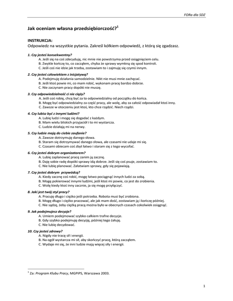 FORa dla SDZ Jak oceniam własna przedsiębiorczość?1 INSTRUKCJA: Odpowiedz na wszystkie pytania. Zakreśl kółkiem odpowiedź, z którą się zgadzasz. 1. Czy jesteś konsekwentny? A. Jeśli się na coś zdecyduję, nic mnie nie powstrzyma przed osiągnięciem celu. B. Zwykle kończę to, co zacząłem, chyba że sprawy wymkną się spod kontroli. C. Jeśli coś nie idzie jak trzeba, zostawiam to i zajmuję się czymś innym. 2. Czy jesteś człowiekiem z inicjatywą? A. Podejmuję działania samodzielnie. Nikt nie musi mnie zachęcać. B. Jeśli ktoś powie mi, co mam robić, wykonam pracę bardzo dobrze. C. Nie zaczynam pracy dopóki nie muszę. 3. Czy odpowiedzialność ci nie ciąży? A. Jeśli coś robię, chcę być za to odpowiedzialny od początku do końca. B. Mogę być odpowiedzialny za część pracy, ale wolę, aby za całość odpowiadał ktoś inny. C. Zawsze w otoczeniu jest ktoś, kto chce rządzić. Niech rządzi. 4. Czy lubisz być z innymi ludźmi? A. Lubię ludzi i mogę się dogadać z każdym. B. Mam wielu bliskich przyjaciół i to mi wystarcza. C. Ludzie działają mi na nerwy. 5. Czy ludzie mają do ciebie zaufanie? A. Zawsze dotrzymuję danego słowa. B. Staram się dotrzymywać danego słowa, ale czasami nie udaje mi się. C. Czasami obiecam coś zbyt łatwo i staram się z tego wycofać. 6. Czy jesteś dobrym organizatorem? A. Lubię zaplanować pracę zanim ją zacznę. B. Daję sobie radę dopóki sprawy idą dobrze. Jeśli się coś psuje, zostawiam to. C. Nie lubię planować. Załatwiam sprawy, gdy się pojawiają. 7. Czy jesteś dobrym przywódcą? A. Kiedy zacznę coś robić, mogę łatwo pociągnąć innych ludzi za sobą. B. Mogę pokierować innymi ludźmi, jeśli ktoś mi powie, co jest do zrobienia. C. Wolę kiedy ktoś inny zacznie, ja się mogę przyłączyć. 8. Jaki jest twój styl pracy? A. Pracuję długo i ciężko jeśli potrzeba. Robota musi być zrobiona. B. Mogę długo i ciężko pracować, ale jak mam dość, zostawiam ją i kończę później. C. Nie sądzę, żeby ciężką pracą można było w obecnych czasach cokolwiek osiągnąć. 9. Jak podejmujesz decyzje? A. Umiem podejmować szybko całkiem trafne decyzje. B. Gdy szybko podejmuję decyzję, później tego żałuję. C. Nie lubię decydować. 10. Czy jesteś zdrowy? A. Nigdy nie tracę sił i energii. B. Na ogół wystarcza mi sił, aby skończyć pracę, którą zacząłem. C. Wydaje mi się, że inni ludzie mają więcej siły i energii. 1 Za: Program Klubu Pracy, MGPiPS, Warszawa 2003. 1 FORa dla SDZ PODSUMUJ SWOJE ODPOWIEDZI: Liczba odpowiedzi „A”____ Liczba odpowiedzi „B”____ Liczba odpowiedzi „C”____ INTERPRETACJA: Jeżeli większość twoich odpowiedzi należy do „A”, masz wiele cech, które ułatwią ci prowadzenie własnej firmy. Jeżeli masz więcej odpowiedzi w grupie „B”, poszukaj sobie partnera, który uzupełni twoje słabsze strony. Jeżeli najwięcej twoich odpowiedzi znajduje się w grupie „C”, pomyśl o innym sposobie na życie. Biznes nie jest dla ciebie. 2