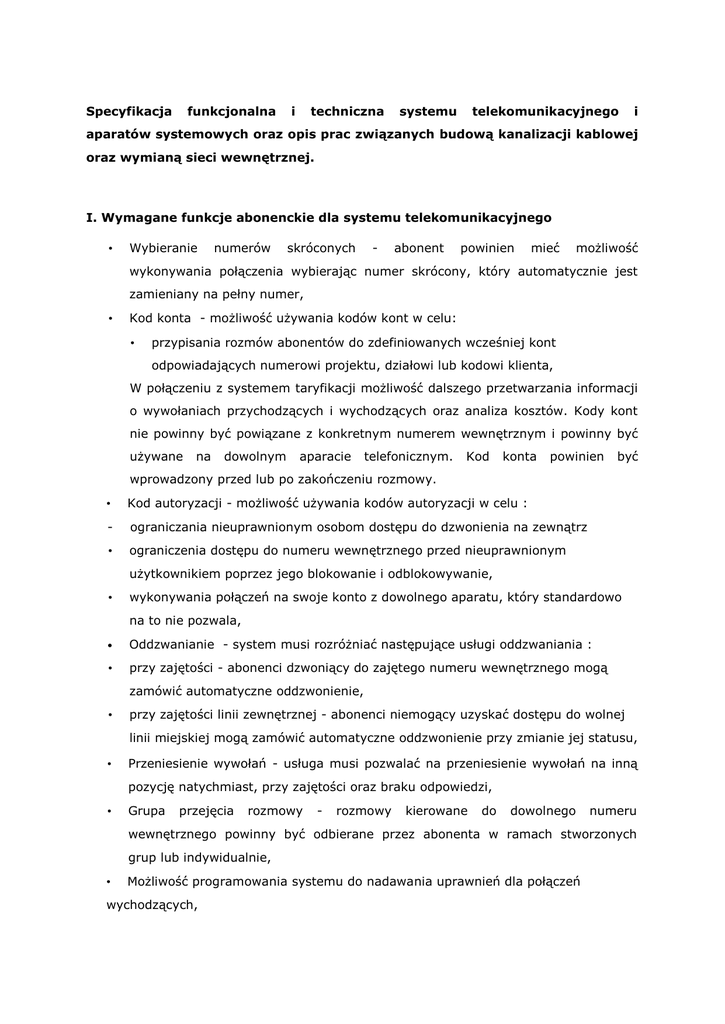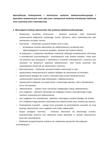 Specyfikacja funkcjonalna i techniczna systemu telekomunikacyjnego i aparatów systemowych oraz opis prac związanych budową kanalizacji kablowej oraz wymianą sieci wewnętrznej. I. Wymagane funkcje abonenckie dla systemu telekomunikacyjnego • Wybieranie numerów skróconych - abonent powinien mieć możliwość wykonywania połączenia wybierając numer skrócony, który automatycznie jest zamieniany na pełny numer, • Kod konta - możliwość używania kodów kont w celu: • przypisania rozmów abonentów do zdefiniowanych wcześniej kont odpowiadających numerowi projektu, działowi lub kodowi klienta, W połączeniu z systemem taryfikacji możliwość dalszego przetwarzania informacji o wywołaniach przychodzących i wychodzących oraz analiza kosztów. Kody kont nie powinny być powiązane z konkretnym numerem wewnętrznym i powinny być używane na dowolnym aparacie telefonicznym. Kod konta powinien być wprowadzony przed lub po zakończeniu rozmowy. • Kod autoryzacji - możliwość używania kodów autoryzacji w celu : - ograniczania nieuprawnionym osobom dostępu do dzwonienia na zewnątrz • ograniczenia dostępu do numeru wewnętrznego przed nieuprawnionym użytkownikiem poprzez jego blokowanie i odblokowywanie, • wykonywania połączeń na swoje konto z dowolnego aparatu, który standardowo na to nie pozwala, • Oddzwanianie - system musi rozróżniać następujące usługi oddzwaniania : • przy zajętości - abonenci dzwoniący do zajętego numeru wewnętrznego mogą zamówić automatyczne oddzwonienie, • przy zajętości linii zewnętrznej - abonenci niemogący uzyskać dostępu do wolnej linii miejskiej mogą zamówić automatyczne oddzwonienie przy zmianie jej statusu, • Przeniesienie wywołań - usługa musi pozwalać na przeniesienie wywołań na inną pozycję natychmiast, przy zajętości oraz braku odpowiedzi, • Grupa przejęcia rozmowy - rozmowy kierowane do dowolnego numeru wewnętrznego powinny być odbierane przez abonenta w ramach stworzonych grup lub indywidualnie, • Możliwość programowania systemu do nadawania uprawnień dla połączeń wychodzących, • Możliwość zdefiniowania prefiksu, • Tworzenie grup (przechwytująca) - umożliwia przechwytywanie z jednego aparatu na drugi w danej grupie wywołań, • Możliwość tworzenia grup: UCD (Uniform Call Distribution), ACD (Automatic Call Distribution) oraz komunikatów głosowych informujących o stanie zajętości grup, dla wszystkich rodzajów aparatów (analogowe, systemowe, systemowe DECT) • Możliwość logowania i wylogowania się z grup ACD/UCD, • Możliwość utworzenia wspólnego numeru wewnętrznego dla aparatu stacjonarnego i aparatu systemowego DECT, • Połączenie oczekujące - funkcja musi umożliwiać numerom wewnętrznym wysyłanie i odbieranie sygnałów dźwiękowych informujących o oczekiwaniu połączenia wewnętrznego lub zewnętrznego, • Kolejkowanie rozmów - wymagana możliwość przekazywania połączenia przez operatora do zajętego numeru wewnętrznego i dodania go do kolejki połączeń oczekujących, • Klasy dostępu do usług - wymagana możliwość indywidualnego nadawania abonentom dostępu do usług systemu i rodzaju rozmów, • Grupa wspólnego dzwonka - wymagana możliwość sygnalizowania rozmów przychodzących do grupy na jednym urządzeniu (np. dzwonku na korytarzu) i możliwość odebrania rozmowy przez kod przejęcia, • Nie przeszkadzać - usługa powinna pozwalać na zablokowanie wywołań do abonenta i powinna być aktywowana i dezaktywowana samodzielnie przez abonenta, • Podążanie za abonentem - możliwość żądania przez abonentów, aby kierowane do nich rozmowy były przekazywane do wyznaczonych numerów wewnętrznych lub zewnętrznych, • Przełączanie między rozmowami - funkcja powinna umożliwiać abonentom systemowym odebranie drugiej rozmowy podczas trwania pierwszej, utrzymywania jednocześnie dwóch połączeń i przełączenia się między nimi, • Wywołania grupowe - wymagana możliwość wywołania do grupy z przenoszeniem do pierwszego wolnego numeru lub numeru, który najdłużej pozostaje wolny, • System powinien umożliwiać funkcję wyboru najtańszej drogi połączenia, • Możliwość przełączania trybu pracy: dzień/noc, Gorąca linia - usługa powinna pozwalać na bezpośrednie połączenie z wybranym • numerem natychmiast po podniesieniu słuchawki lub ze zdefiniowanym opóźnieniem, Wejście na trzeciego - wymagana możliwość włączenia się do trwającej rozmowy • przez uprawnionego abonenta, Ponowne wybieranie numeru - wymagana możliwość zapamiętania ostatnio • wybranego numeru zewnętrznego i ponowne połączenie realizowane poprzez przycisk lub kod serwisowy, • Możliwość rejestrowania telefonów komórkowych jako linie wewnętrzne w centrali. • Możliwość monitorowania stanu linii wewnętrznych podłączonych do central za pośrednictwem przycisków BLF (Busy Line Field) w telefonie systemowym . Wiadomość • oczekująca - wymagana usługa powiadamiania abonenta o oczekującej wiadomości w postaci migającej diody lub specjalnego tonu. • Telefony systemowe muszą być podłączane jedną parą przewodów. • Telefony systemowe DECT muszą posiadać funkcję Hand-Over oraz umożliwiać wspólną pracę z telefonem stacjonarnym pod jednym numerem wewnętrznym i umożliwiać dostęp do funkcji centrali PBX (m.in. systemowa książka telefoniczna) II. Wymagania techniczne dla systemu telekomunikacyjnego • Budowa modułowa, • Możliwość rozbudowy do min. 1000 numerów wewnętrznych, • System pracujący w ruchu automatycznym, • Możliwość wymiany modułów abonenckich i łączy miejskich w trybie „hot-swap", bez potrzeby wyłączania systemu, Linie abonenckie analogowe i systemowe powinny być podłączone do systemu za • pomocą jednej pary przewodów, • W pełni zintegrowany sprzętowo i programowo system telefonii bezprzewodowej DECT , umo