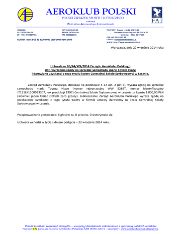 AEROKLUB POLSKI POLSKI ZWIĄZEK SPORTU LOTNICZEGO członek Fédération Aéronautique Internationale SIEDZIBA: ul.17 STYCZNIA 39 00 – 906 WARSZAWA NIP 526-030-03-45 REGON 007026161 KRS 0000122672 KONTO: Bank BGŻ 25 2030 0045 1110 0000 0240 0890 TELEFONY: Prezes: +48 22 826 76 70 Sekretarz Generalny: +48 22 826 76 70 Centrala: +48 22 55 67 300 FAX: +48 22 826 02 43 E-MAIL: [email protected] WWW: http://www.aeroklubpolski.pl Warszawa, dnia 22 września 2014 roku Uchwała nr 86/44/XIX/2014 Zarządu Aeroklubu Polskiego dot. wyrażenia zgody na sprzedaż samochodu marki Toyota Hiace i darowiznę uzyskanej z tego tytułu kwoty Centralnej Szkole Szybowcowej w Lesznie. Zarząd Aeroklubu Polskiego, działając na podstawie § 32 ust. 2 pkt 3), wyraża zgodę na sprzedaż samochodu marki Toyota Hiace (numer rejestracyjny WW 5289T, numer identyfikacyjny JT121LK1100033307, rok produkcji 1997) Centralnej Szkole Szybowcowej w Lesznie za kwotę 1.000,00 PLN (słownie: jeden tysiąc złotych zero groszy). Jednocześnie Zarząd Aeroklubu Polskiego wyraża zgodę na przekazanie uzyskanej z tego tytułu kwoty w formie umowy darowizny na rzecz Centralnej Szkoły Szybowcowej w Lesznie. Przeprowadzono głosowanie: 6 głosów za, 0 przeciw, 0 wstrzymało się. Uchwała wchodzi w życie z dniem podjęcia – 22 września 2014 roku. Pomóż lotnikom rozwinąć skrzydła – wesprzyj działalność szkoleniową i sportową polskich lotników Przekaż 1 % podatku na rzecz Aeroklubu Polskiego KRS 0000122672 - szczegóły : www.aeroklubpolski.pl/pozytek