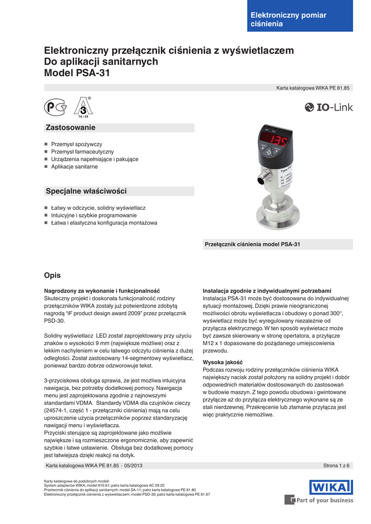 Elektroniczny pomiar ciśnienia Elektroniczny przełącznik ciśnienia z wyświetlaczem Do aplikacji sanitarnych Model PSA-31 Karta katalogowa WIKA PE 81.85 Zastosowanie Przemysł spożywczy Przemysł farmaceutyczny Urządzenia napełniające i pakujące Aplikacje sanitarne Specjalne właściwości Łatwy w odczycie, solidny wyświetlacz Intuicyjne i szybkie programowanie Łatwa i elastyczna konfiguracja montażowa Przełącznik ciśnienia model PSA-31 Opis Nagrodzony za wykonanie i funkcjonalność Skuteczny projekt i doskonała funkcjonalność rodziny przełączników WIKA zostały już potwierdzone zdobytą nagrodą “iF product design award 2009” przez przełącznik PSD-30. Solidny wyświetlacz LED został zaprojektowany przy użyciu znaków o wysokości 9 mm (największe możliwe) oraz z lekkim nachyleniem w celu łatwego odczytu ciśnienia z dużej odległości. Został zastosowany 14-segmentowy wyświetlacz, ponieważ bardzo dobrze odzworowuje tekst. 3-przyciskowa obsługa sprawia, że jest możliwa intuicyjna nawigacja, bez potrzeby dodatkowej pomocy. Nawigacja menu jest zaprojektowana zgodnie z najnowszymi standardami VDMA. Standardy VDMA dla czujników cieczy (24574-1, część 1 - przełączniki ciśnienia) mają na celu uproszczenie użycia przełączników poprzez standaryzację nawigacji menu i wyświetlacza. Przyciski sterujące są zaprojektowane jako możliwie największe i są rozmieszczone ergonomicznie, aby zapewnić szybkie i łatwe ustawienie. Obsługa bez dodatkowej pomocy jest łatwiejsza dzięki reakcji na dotyk. Instalacja zgodnie z indywidualnymi potrzebami Instalacja PSA-31 może być dostosowana do indywidualnej sytuacji montażowej. Dzięki prawie nieograniczonej możliwości obrotu wyświetlacza i obudowy o ponad 300°, wyświetlacz może być wyregulowany niezależnie od przyłącza elektrycznego. W ten sposób wyświetacz może być zawsze skierowany w stronę opertatora, a przyłącze M12 x 1 dopasowane do pożądanego umiejscowienia przewodu. Wysoka jakość Podczas rozwoju rodziny przełączników ciśnienia WIKA największy nacisk został położony na solidny projekt i dobór odpowiednich materiałów dostosowanych do zastosowań w budowie maszyn. Z tego powodu obudowa i gwintowane przyłącze aż do przyłącza elektrycznego wykonane są ze stali nierdzewnej. Przekręcenie lub złamanie przyłącza jest więc praktycznie niemożliwe. Karta katalogowa WIKA PE 81.85 ∙ 05/2013 Karty katalogowe do podobnych modeli: System adapterów WIKA; model 910.61; patrz karta katalogowa AC 09.20 Przetwornik ciśnienia do aplikacji sanitarnych; model SA-11; patrz karta katalogowa PE 81.80 Elektroniczny przełącznik ciśnienia z wyświetlaczem; model PSD-30; patrz karta katalogowa PE 81.67 Strona 1 z 6 Zakresy pomiarowe Ciśnienie względne bar psi 0 ... 1 0 ... 15 0 ... 1.6 0 ... 25 Ciśnienie absolutne bar psi 0 ... 1 0 ... 15 0 ... 1.6 0 ... 25 0 ... 2.5 0 ... 30 1) 0 ... 4 0 ... 50 0 ... 6 0 ... 100 0 ... 10 0 ... 160 0 ... 16 0 ... 200 0 ... 25 0 ... 300 0 ... 2.5 0 ... 30 1) 0 ... 4 0 ... 50 0 ... 6 0 ... 100 0 ... 10 0 ... 160 0 ... 16 0 ... 200 0 ... 25 0 ... 300 Zakresy pomiarowe +/bar psi -1 ... 0 -14.5 ... 0 -1 ... +1.5 -14.5 ... +30 -1 ... +3 -14.5 ... +50 -1 ... +5 -14.5 ... +100 -1 ... +9 -14.5 ... +160 -1 ... +15 -14.5 ... +200 -1 ... +24 -14.5 ... +300 Podane zakresy pomiarowe dostępne są także w kg/cm2 i MPa. Dopuszczalne przeciążenie 2 razy Wyświetlacz Napięcie zasilania 14-segmentowy LED, czerwony, 4-cyfrowy, rozmiar znaków 9 mm Wyświetlacz może byc obracany elektronicznie o 180° Zasilanie DC 15 ... 35 V Update 100, 200, 500, 1,000 ms (regulowany) Pobór prądu max. 100 mA Sygnał wyjściowy Calkowity pobór prądu max. 600 mA obejmuje prąd przełączania max. 450 mA obejmuje prąd przełączania (z opcją IO-Link) Licza wyjść przełączających: 1 lub 2 Typ wyjścia przełączającego: PNP lub NPN 1) Sygnał analogowy: 4 ... 20 mA lub DC 0 ... 10 V Warunki odniesienia 1) Z opcją IO-Link, wyjście przełączające 1 jest zawsze PNP. Progi przełączania Punkt przełączania 1 i punkt przełączania 2 są indywidualnie regulowane Funkcje przełączające Normalnie otwarte, normalnie zamknięte, okna, histerezy Napięcie przełączające Zasilanie - 1 V Temperatura 15 ... 25 °C Ciśnienie atmosferyczne 950 ... 1,050 mbar Wilgotność 45 ... 75 % względna Pozycja nominalna Dolne przyłącza procesowe (LM) Prąd przełączający: ■■ bez IO-Link: max. 250 mA na wyjście przełączające ■■ z IO-Link: max. 100 mA na wyjście przełączające Zasilanie DC 24 V Obciążenie patrz “sygnały wyjściowe“ Czas ustalania: Wyjście przełączające: ≤ 10 ms Sygnał analogowy: 3 ms Regulacja zero offset max. 3 % zakresu Obciążenie Sygnał analogowy 4 ... 20 mA: Sygnał analogowy DC 0 ... 10 V: Strona 2 z 6 ≤ 0.5 kΩ > 10 kΩ Karta katalogowa WIKA PE 81.85 ∙ 05/2013 Dane dotyczące dokładności Warunki pracy Dokładność sygnału analogowego ≤ ±1.0 % zakresu Dopuszczalne zakresy temperatur Otoczenia: -20 ... +80 °C Przechowywania: -20 ... +80 °C Zakres roboczy temperatury: 0 ... 80 °C Obejmuje nieliniowość, histerezę, punkt zero i odchylenia pełnej skali (odpowiada błędowi pomiaru wg IEC 61298-2). Kalibrowany w pozycji poziomej z przyłączem procesowym skierowanym ku dołowi. Nieliniowość ≤ ±0.5 % zakresu BFSL (wg IEC 61298-2) Regulacja dokładności punktów przełączania ≤ ±0.5 % zakresu Temperatura medium w zależności od przyłącza procesowego ■■ G1 hygieniczne -20 ... +125 °C (+150 °C możliwe do 60 minut) ■■ Pozostałe przyłącza procesowe -20 ... +100 °C (+135 °C możliwe do 60 minut) Wilgotność 45 ... 75 % względna Wyświetlacz ≤ ±1.0 % zakresu ±1 cyfra Dryf długoterminowy ≤ ±0.2 % zakresu (wg IEC 61298-2) Typowe współczynniki temperaturowe punktu zerowego ■■ Clamp DIN 32676, DN 32 0 ... 20 °C: 0.75 % zakresu/10 K 20 ... 80 °C: 0.45 % zakresu/10 K ■■ P