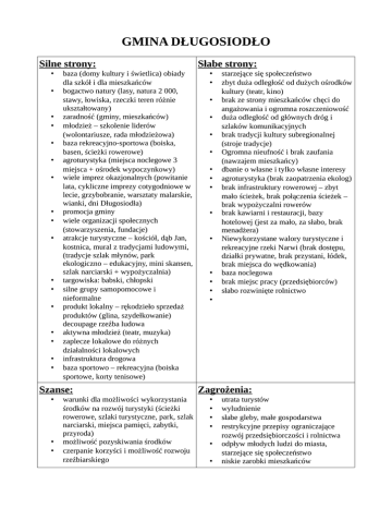 GMINA DŁUGOSIODŁO Silne strony: • • • • • • • • • • • • • • • • • baza (domy kultury i świetlica) obiady dla szkół i dla mieszkańców bogactwo natury (lasy, natura 2 000, stawy, łowiska, rzeczki teren różnie ukształtowany) zaradność (gminy, mieszkańców) młodzież – szkolenie liderów (wolontariusze, rada młodzieżowa) baza rekreacyjno-sportowa (boiska, basen, ścieżki rowerowe) agroturystyka (miejsca noclegowe 3 miejsca + ośrodek wypoczynkowy) wiele imprez okazjonalnych (powitanie lata, cykliczne imprezy cotygodniowe w lecie, grzybobranie, warsztaty malarskie, wianki, dni Długosiodła) promocja gminy wiele organizacji społecznych (stowarzyszenia, fundacje) atrakcje turystyczne – kościół, dąb Jan, kostnica, mural z tradycjami ludowymi, (tradycje szlak młynów, park ekologiczno – edukacyjny, mini skansen, szlak narciarski + wypożyczalnia) targowiska: babski, chłopski silne grupy samopomocowe i nieformalne produkt lokalny – rękodzieło sprzedaż produktów (glina, szydełkowanie) decoupage rzeźba ludowa aktywna młodzież (teatr, muzyka) zaplecze lokalowe do różnych działalności lokalowych infrastruktura drogowa baza sportowo – rekreacyjna (boiska sportowe, korty tenisowe) Szanse: • • • warunki dla możliwości wykorzystania środków na rozwój turystyki (ścieżki rowerowe, szlaki turystyczne, park, szlak narciarski, miejsca pamięci, zabytki, przyroda) możliwość pozyskiwania środków czerpanie korzyści i możliwość rozwoju rzeźbiarskiego Słabe strony: • • • • • • • • • • • • • • • starzejące się społeczeństwo zbyt duża odległość od dużych ośrodków kultury (teatr, kino) brak ze strony mieszkańców chęci do angażowania i ogromna roszczeniowość duża odległość od głównych dróg i szlaków komunikacyjnych brak tradycji kultury subregionalnej (stroje tradycje) Ogromna nieufność i brak zaufania (nawzajem mieszkańcy) dbanie o własne i tylko własne interesy agroturystyka (brak zaopatrzenia ekolog) brak infrastruktury rowerowej – zbyt mało ścieżek, brak połączenia ścieżek – brak wypożyczalni rowerów brak kawiarni i restauracji, bazy hotelowej (jest za mało, za słabo, brak menadżera) Niewykorzystane walory turystyczne i rekreacyjne rzeki Narwi (brak dostępu, działki prywatne, brak przystani, łódek, brak miejsca do wędkowania) baza noclegowa brak miejsc pracy (przedsiębiorców) słabo rozwinięte rolnictwo Zagrożenia: • • • • • • utrata turystów wyludnienie słabe gleby, małe gospodarstwa restrykcyjne przepisy ograniczające rozwój przedsiębiorczości i rolnictwa odpływ młodych ludzi do miasta, starzejące się społeczeństwo niskie zarobki mieszkańców • • • • • • • • rozwój promocji, aktywności obwodnica (węzeł w Knurach) – zmniejszenie czasu dojazdu do stolicy wspieranie lokalnych przedsięwzięć przez władze samorządowe przekwalifikowanie gospodarstw rolniczych na bardziej wyspecjalizowane tereny bezpieczne dla życia mieszkańców cisza i spokój dobrze wyposażone szkoły aktywizacja ludzi zagrożonych wykluczeniem społecznym (bezrobotni, niepełnosprawni) Problem: 1. Brak wodociągów (50%) 2. brak kanalizacji (sieć i przydomowych oczyszczalni ścieków) 3. brak ścieżek rowerowych 4. niewystarczająca oferta kulturalna (zakup instrumentów scena teatr.) 5. brak bazy gastronomicznej 6. niewystarczająca baza turystyczna (środki na skansen, nawierzchnię ścieżek rowerowych) 7. brak produktu regionalnego (potraw, symbol) 8. brak miejsc pracy • zagrożenie dla rozwoju gminy (gospodarczego i społecznego) Cele: 1. poprawa infrastruktury wodociągowej i kanalizacyjnej 2. budowa przydomowych oczyszczalni ścieków 3. poprawa infrastruktury drogowej (ścieżki, nawierzchni) 4. rozszerzenie oferty kulturalnej poprzez wzbogacenie wyposażenia (instrumenty, nagłośnienie, scena) 5. utworzenie/modernizacja bazy gastronomiczne, rozwój bazy turystycznej (rozszerzenie, tworzenie nowych miejsc turystycznych) 6. stworzenie i rozwój małego muzeum wsi 7. stworzenie produktu lokalnego /regionalnego 8. Tworzenie nowych miejsc pracy, rozwój i tworzenie mikroprzedsiębiorstw