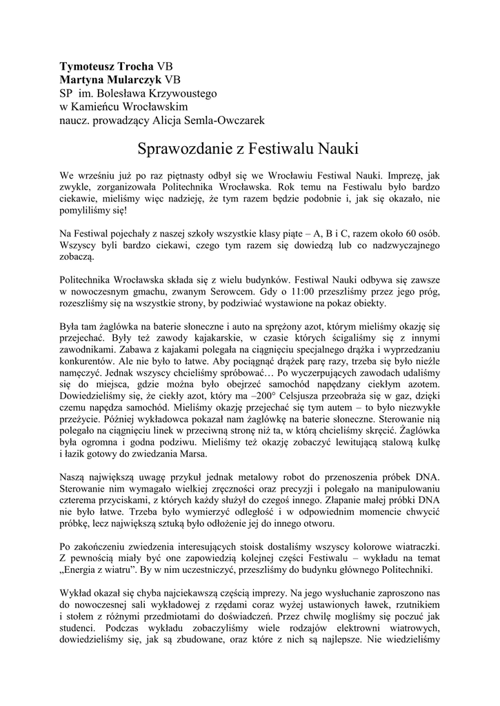 Tymoteusz Trocha VB Martyna Mularczyk VB SP im. Bolesława Krzywoustego w Kamieńcu Wrocławskim naucz. prowadzący Alicja Semla-Owczarek Sprawozdanie z Festiwalu Nauki We wrześniu już po raz piętnasty odbył się we Wrocławiu Festiwal Nauki. Imprezę, jak zwykle, zorganizowała Politechnika Wrocławska. Rok temu na Festiwalu było bardzo ciekawie, mieliśmy więc nadzieję, że tym razem będzie podobnie i, jak się okazało, nie pomyliliśmy się! Na Festiwal pojechały z naszej szkoły wszystkie klasy piąte – A, B i C, razem około 60 osób. Wszyscy byli bardzo ciekawi, czego tym razem się dowiedzą lub co nadzwyczajnego zobaczą. Politechnika Wrocławska składa się z wielu budynków. Festiwal Nauki odbywa się zawsze w nowoczesnym gmachu, zwanym Serowcem. Gdy o 11:00 przeszliśmy przez jego próg, rozeszliśmy się na wszystkie strony, by podziwiać wystawione na pokaz obiekty. Była tam żaglówka na baterie słoneczne i auto na sprężony azot, którym mieliśmy okazję się przejechać. Były też zawody kajakarskie, w czasie których ścigaliśmy się z innymi zawodnikami. Zabawa z kajakami polegała na ciągnięciu specjalnego drążka i wyprzedzaniu konkurentów. Ale nie było to łatwe. Aby pociągnąć drążek parę razy, trzeba się było nieźle namęczyć. Jednak wszyscy chcieliśmy spróbować… Po wyczerpujących zawodach udaliśmy się do miejsca, gdzie można było obejrzeć samochód napędzany ciekłym azotem. Dowiedzieliśmy się, że ciekły azot, który ma –200° Celsjusza przeobraża się w gaz, dzięki czemu napędza samochód. Mieliśmy okazję przejechać się tym autem – to było niezwykłe przeżycie. Później wykładowca pokazał nam żaglówkę na baterie słoneczne. Sterowanie nią polegało na ciągnięciu linek w przeciwną stronę niż ta, w którą chcieliśmy skręcić. Żaglówka była ogromna i godna podziwu. Mieliśmy też okazję zobaczyć lewitującą stalową kulkę i łazik gotowy do zwiedzania Marsa. Naszą największą uwagę przykuł jednak metalowy robot do przenoszenia próbek DNA. Sterowanie nim wymagało wielkiej zręczności oraz precyzji i polegało na manipulowaniu czterema przyciskami, z których każdy służył do czegoś innego. Złapanie małej próbki DNA nie było łatwe. Trzeba było wymierzyć odległość i w odpowiednim momencie chwycić próbkę, lecz największą sztuką było odłożenie jej do innego otworu. Po zakończeniu zwiedzenia interesujących stoisk dostaliśmy wszyscy kolorowe wiatraczki. Z pewnością miały być one zapowiedzią kolejnej części Festiwalu – wykładu na temat „Energia z wiatru”. By w nim uczestniczyć, przeszliśmy do budynku głównego Politechniki. Wykład okazał się chyba najciekawszą częścią imprezy. Na jego wysłuchanie zaproszono nas do nowoczesnej sali wykładowej z rzędami coraz wyżej ustawionych ławek, rzutnikiem i stołem z różnymi przedmiotami do doświadczeń. Przez chwilę mogliśmy się poczuć jak studenci. Podczas wykładu zobaczyliśmy wiele rodzajów elektrowni wiatrowych, dowiedzieliśmy się, jak są zbudowane, oraz które z nich są najlepsze. Nie wiedzieliśmy przedtem, że istnieją statki poruszające się za pomocą ruchomych walców. Okazało się też, że gdy z worka, wewnątrz którego jest poduszka, odciągnie się powietrze, pakunek stanie się o wiele mniejszy. Z doświadczeń wykonywanych przez wykładowcę dowiedzieliśmy się, że podpalona torebka do herbaty może się lekko unieść lub że jeśli dzwoniący dzwonek włoży się pod klosz i zrobi pod nim próżnię, to nie można usłyszeć dźwięku. Tegoroczny Festiwal Nauki był niezwykle udany. O nudzie nie mogło być mowy! Chociaż na Festiwalu Nauki byliśmy już po raz drugi, ponownie dowiedzieliśmy się wielu ciekawych rzeczy. Z wielką niecierpliwością będziemy też czekać na następną edycję. Wszystkim zaciekawionym szczerze polecamy!