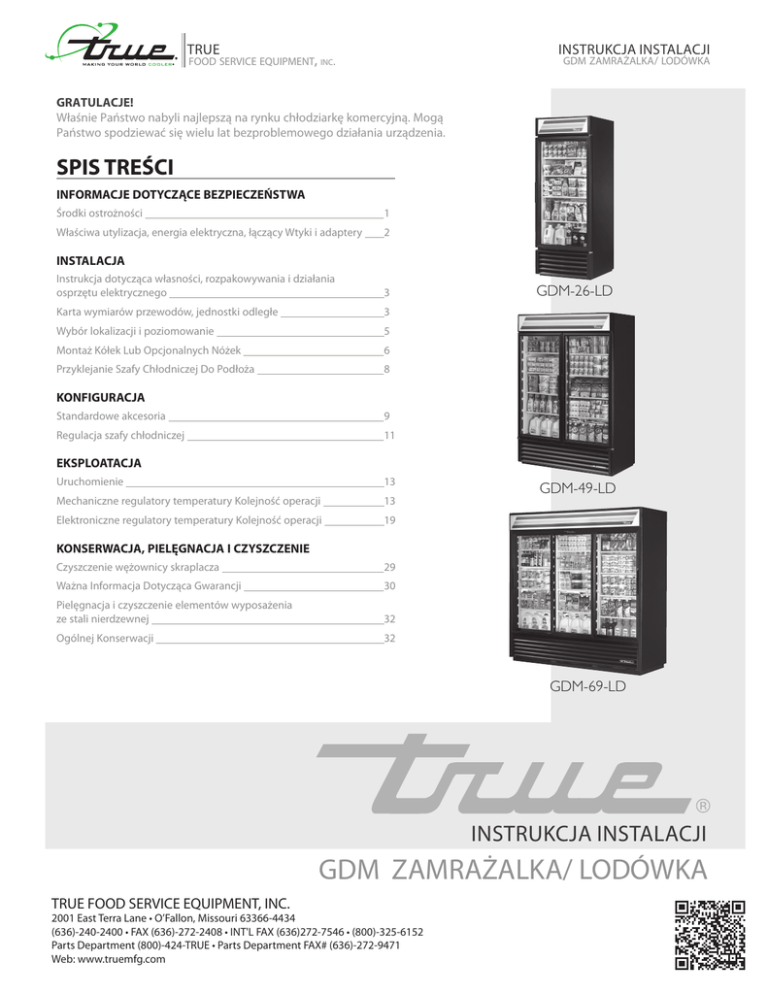 INSTRUKCJA INSTALACJI TRUE food service equipment, inc. gdm zamrażalka / lodówka GRATULACJE! Właśnie Państwo nabyli najlepszą na rynku chłodziarkę komercyjną. Mogą Państwo spodziewać się wielu lat bezproblemowego działania urządzenia. SPIS TREŚCI INFORMACJE DOTYCZĄCE BEZPIECZEŃSTWA Środki ostrożności 1 Właściwa utylizacja, energia elektryczna, łączący Wtyki i adaptery 2 INSTALACJA Instrukcja dotycząca własności, rozpakowywania i działania osprzętu elektrycznego 3 Karta wymiarów przewodów, jednostki odległe 3 Wybór lokalizacji i poziomowanie 5 Montaż Kółek Lub Opcjonalnych Nóżek 6 Przyklejanie Szafy Chłodniczej Do Podłoża 8 GDM-26-LD KONFIGURACJA Standardowe akcesoria 9 Regulacja szafy chłodniczej 11 EKSPLOATACJA Uruchomienie 13 Mechaniczne regulatory temperatury Kolejność operacji 13 Elektroniczne regulatory temperatury Kolejność operacji 19 GDM-49-LD KONSERWACJA, PIELĘGNACJA I CZYSZCZENIE Czyszczenie wężownicy skraplacza 29 Ważna Informacja Dotycząca Gwarancji 30 Pielęgnacja i czyszczenie elementów wyposażenia ze stali nierdzewnej 32 Ogólnej Konserwacji 32 GDM-69-LD INSTRUKCJA INSTALACJI GDM ZAMRAŻALKA/ LODÓWKA TRUE FOOD SERVICE EQUIPMENT, INC. 2001 East Terra Lane • O’Fallon, Missouri 63366-4434 (636)-240-2400 • FAX (636)-272-2408 • INT'L FAX (636)272-7546 • (800)-325-6152 Parts Department (800)-424-TRUE • Parts Department FAX# (636)-272-9471 Web: www.truemfg.com TRUE www.truemfg.com gdm zamrażalka / lodówka INFORMACJA DLA UŻYTKOWNIKA Loss or spoilage of products in your refrigerator/ freezer is not covered by warranty. In addition to following recommended installation procedures you must run the refrigerator/freezer 24 hours prior to usage. INFORMACJE DOTYCZĄCE BEZPIECZEŃSTWA Jak przeprowadzać konserwację urządzenia TRUE, aby działało możiwie jak najsprawniej Zakupili Państwo jedną z najlepszych komercyjnych chłodziarek dostępnych na rynku. Jest produkowana w warunkach ścisłej kontroli jakości, z najlepszych materiałów. Właściwie konserwowana chłodziarka TRUE będzie bezawaryjnie działać przez wiele lat. OSTRZEŻENIE! Urządzenie należy użytkować zgodnie z przeznaczeniem, tak jak opisano w Instrukcji obsługi. TYP CZYNNIKA CHŁODNICZEGO PODANO NA ETYKIECIE Z NUMEREM SERYJNYM ZNAJDUJĄCEJ SIĘ WEWNĄTRZ URZĄDZENIA. W tej szafce może się znajdować fluorowany gaz cieplarniany objęty protokołem z kioto. (Typ i objętość podano na etykiecie wewnątrz urządzenia, gwp 134a= 1300. R404a= 3800). JEDYNIE DO CHŁODZIWA WĘGLOWODOROWEGO (R290) - PATRZ PONIŻEJ. • NIEBEZPIECZEŃSTWO – Zagrożenie pożarem lub wybuchem. Zastosowano palne chłodziwo. Nie używać urządzeń mechanicznych do rozmrażania lodówki. Nie przekłuwać rurek z chłodziwem. • NIEBEZPIECZEŃSTWO – Zagrożenie pożarem lub wybuchem. Zastosowano palne chłodziwo. Naprawy mogą przeprowadzać jedynie przeszkoleni pracownicy serwisu. Nie przekłuwać rurek z chłodziwem. • OSTRZEŻENIE – Zagrożenie pożarem lub wybuchem. Zastosowano palne chłodziwo. Przed rozpoczęciem prac serwisowych zapoznać się z instrukcją obsługi / podręcznik napraw. Konieczne jest stosowanie wszelkich środków ostrożności. • OSTRZEŻENIE – Zagrożenie pożarem lub wybuchem. Utylizować zgodnie z federalnymi lub lokalnymi przepisami. Zastosowano palne chłodziwo. • OSTRZEŻENIE – Zagrożenie pożarem lub wybuchem w przypadku przekłucia rurek z chłodziwem; ściśle przestrzegać instrukcji postępowania z urządzeniem. Zastosowano palne chłodziwo. • OSTRZEŻENIE – Zachowywać drożność otworów wentylacyjnych w obudowie urządzenia lub konstrukcji, w której urządzenie jest zabudowywane. ŚRODKI OSTROŻNOŚCI Używając urządzeń elektrycznych należy stosować podstawowe środki ostrożności, w tym między innymi: • Przed rozpoczęciem eksploatacji chłodziarki, należy ją ustawić w odpowiednim miejscu i prawidłowo zainstalować. • Nie należy pozwalać dzieciom wspinać się na półki chłodziarki, stawać na nich ani zwieszać się z nich. Mogłoby to być przyczyną uszkodzenia chłodziarki i obrażeń u dzieci. • • 1 Nie dotykać chłodnych powierzchni w komorze chłodziarki mokrymi lub wilgotnymi rękami. Skóra może przywierać do bardzo zimnych powierzchni. W pobliżu tych i innych urządzeń nie należy przechowywać ani używać benzyny lub innych palnych par lub płynów. • Palce należy trzymać z dala od „punktów przycięcia”, prześwity między drzwiami oraz między drzwiami a obudową muszą być niewielkie; należy zachować ostrożność przy zamykaniu drzwi, jeśli w pobliżu przebywają dzieci. • Przed rozpoczęciem czyszczenia lub naprawy chłodziarki należy odłączyć zasilanie. • Ustawienie regulatora temperatury w położeniu 0 nie przerywa dopływu zasilania. UWAGA Zdecydowanie zalecamy, aby wszelkie czynności serwisowe były wykonywane przez wykwalifikowanych pracowników. TRUE www.truemfg.com gdm zamrażalka / lodówka NIEBEZPIECZEŃSTWO! RYZYKO UWIĘZIENIA DZIECKA WŁAŚCIWA UTYLIZACJA CHŁODZIARKI Niebezpieczeństwo uwięzienia i uduszenia się dziecka to nie problem z przeszłości. Wyrzucone i pozostawione bez dozoru chłodziarki są nadal niebezpieczne, nawet jeżeli zostały pozostawione „tylko na parę dni”. Przy pozbywaniu się starej chłodziarki należy stosować się do poniższych wskazówek, pozwoli to zapobiec wypadkom. PRZED WYRZUCENIEM STAREJ CHŁODZIARKI LUB ZAMRAŻARKI NALEŻY: • Wymontować drzwi, • Pozostawić na miejscu półki, aby dzieci nie mogły łatwo wspinać się wewnątrz. UTYLIZACJA URZĄDZENIA Poddając urządzenie recyklingowi, należy pamiętać, że z czynnikami chłodniczymi należy postępować zgodnie z lokalnymi i krajowymi regulaminami, wymogami i przepisami. UTYLIZACJA CZYNNIKA CHŁODNICZEGO W starej chłodziarce może być zastosowany układ chłodniczy zawierający substancje powodujące zanikanie warstwy o