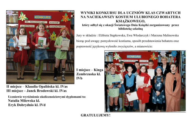 WYNIKI KONKURSU DLA UCZNIÓW KLAS CZWARTYCH NA NACIEKAWSZY KOSTIUM ULUBIONEGO BOHATERA KSIĄśKOWEGO, który odbył się z okazji Światowego Dnia KsiąŜki zorganizowany przez bibliotekę szkolną Jury w składzie : ElŜbieta Stępkowska, Ewa Włodarczyk i Marzena Malinowska biorąc pod uwagę: pomysłowość kostiumu, sposób przedstawienia bohatera oraz poprawność językową wyłoniło zwycięzców, a mianowicie: I miejsce – Kinga Zembrzuska kl. IVb II miejsce – Klaudia Opalińska kl. IVas III miejsce – Janek Brodowski kl. IVas Uczniowie wyróŜnienie okolicznościowymi dyplomami to: Natalia Milewska kl. Eryk Dobrydnio kl. IVd GRATULUJEMY!