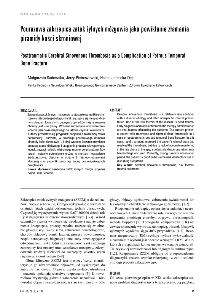 Praca kazuistyczna / case re p ort Pourazowa zakrzepica zatok żylnych mózgowia jako powikłanie złamania piramidy kości skroniowej Posttraumatic Cerebral Sinovenous Thrombosis as a Complication of Petrous Temporal Bone Fracture Małgorzata Sadowska, Jerzy Pietruszewski, Halina Jabłecka-Deja Klinika Pediatrii i Neurologii Wieku Rozwojowego Górnośląskiego Centrum Zdrowia Dziecka w Katowicach STRESZCZENIE ABSTRACT Zakrzepica zatok żylnych mózgowia (ZZŻM) u dzieci stanowi rzadkie schorzenie, którego wykrywalność wzrosła w ostatnich latach dzięki doskonaleniu technik obrazowych. Częstość jej występowania wynosi 0.67/ 100000 dzieci/ rok i jest najwyższa w okresie noworodkowym [1-3]. Wśród czynników ryzyka wymienia się wrodzone i nabyte zaburzenia krzepnięcia, procesy zapalne toczące się w obrębie głowy i szyi, wady serca, zaburzenia hematologiczne, choroby układowe tkanki łącznej, procesy nowotworowe, zespół nerczycowy, biegunkę i inne stany przebiegające z odwodnieniem [2-4]. Jednym z czynników ryzyka rozwoju zakrzepicy jest otwarty uraz czaszkowo-mózgowy, zdecydowanie rzadziej dochodzi do zakrzepicy wskutek urazu łagodnego i zamkniętego [5-8]. Obraz kliniczny ZZŻM jest niespecyficzny, charakteryzuje go różnorodność objawów, od dyskretnych do znacznie nasilonych. Objawy, często mylące, utrudniają i znacznie opóźniają właściwe rozpoznanie [3]. U noworodków występują głównie zaburzenia napadowe i różnorodne objawy neurologiczne, u starszych dzieci – bóle głowy, objawy ogniskowe, zaburzenia świadomości lub też objawy o charakterze rzekomego guza mózgu [1,2]. Rozpoznanie zakrzepicy opiera się na badaniach neuroobrazowych. U niemowląt ważną rolę, szczególnie w monitorowaniu przebiegu choroby, odgrywa ultrasonografia metodą Dopplera [2]. Tomografia komputerowa (TK) nie zawsze skutecznie wykrywa zakrzepicę, odsetek fałszywie ujemnych wyników sięga 40% przypadków [1,3]. Rezonans magnetyczny (RM) cechuje wyższa wykrywalność, a badaniem z wyboru jest obecnie wenografia RM. W niektórych przypadkach konieczne jest wykonanie wenografii TK wysokiej rozdzielczości lub angiografii subtrakcyjnej [1,2]. Rozpoznanie ZZŻM obliguje do przeprowadzenia diagnostyki, czasem szeroko zakrojonej, w celu ustalenia etiologii procesu zakrzepowego. Zakrzepica zatok żylnych mózgowia to stosunkowo rzadkie schorzenie o różnorodnej etiologii, charakteryzujące się niespecyficznym obrazem klinicznym. Jednym z czynników ryzyka rozwoju choroby jest uraz głowy. Wczesne rozpoznanie oraz wdrożenie leczenia przeciwzakrzepowego to istotne czynniki rokownicze. Autorzy przedstawiają przypadek pacjentki z zakrzepicą zatoki poprzecznej i esowatej w przebiegu pourazowego złamania piramidy kości skroniowej, u której wczesne leczenie przyniosło poprawę stanu klinicznego i ustąpienie procesu zakrzepowego, jednak z uwagi na brak właściwego monitorowania późnej fazy terapii nastąpiło potencjalnie groźne w skutkach krwawienie śródczaszkowe. Obecnie, w okresie 8 miesięcy obserwacji klinicznej stan pacjentki pozostaje dobry, bez niepokojących dolegliwości. Słowa kluczowe: zakrzepica zatok żylnych mózgu, czynniki ryzyka, uraz, leczenie. Vol . 1 9 /20 1 0 , n r 3 8 Cerebral sinovenous thrombosis is a relatively rare condition with a diverse etiology and often nonspecific clinical presentation. One of the risk factors of the disease is head trauma. Early diagnosis and rapid antithrombotic therapy administration are vital factors influencing the outcome. The authors present a patient with transverse and sigmoid sinus thrombosis in a case of posttraumatic petrous temporal bone fracture. In this case, rapid treatment improved the patient’s clinical state and resolved the thrombosis, but due to lack of adequate monitoring in the late phase of therapy, a potentially dangerous intracranial haemorrhage occurred. Presently, during 8-month observation period, the patient’s condition has remained satisfactory free of disturbing symptoms. Key words: cerebral sinovenous thrombosis, risk factors, trauma, treatment. Leczenie Od czasu pierwszego opisu w XIX wieku zakrzepica stanowi problem diagnostyczny i terapeutyczny. Jej przebieg 95 Praca kazuistyczna / case re p ort jest trudny do przewidzenia, a leczenie przeciwkrzepliwe do tej pory budzi obawy wśród klinicystów z uwagi na ryzyko krwawień. Jednak liczne doniesienia wskazują na bezpieczeństwo systemowej terapii przeciwkrzepliwej, a opóźnienie leczenia może nieść ze sobą wzrost śmiertelności [2,7,8]. W pierwszym rzędzie w leczeniu dzieci z zakrzepicą zatok żylnych mózgowia bez znaczącego krwawienia śródczaszkowego rekomenduje się stosowanie heparyny niefrakcjonowanej lub drobnocząsteczkowych przez 7–10 dni, a następnie heparyn drobnocząsteczkowych lub antagonistów witaminy K przez co najmniej 3 miesiące (do 6 miesięcy) [9]. Celem oceny skuteczności terapii antagonistami witaminy K należy monitorować protrombinowy czas krzepnięcia w postaci ustandaryzowanej, tzw. wskaźnik INR (ang. International Normalized Ratio); pożądany zakres INR w trakcie terapii przeciwzakrzepowej mieści się w granicach wartości 2–3. Szczególnym wyzwaniem dla klinicysty jest współistnienie procesu zakrzepowego i krwawienia. W ocenie autorów niektórych doniesień stosowanie systemowego leczenia przeciwzakrzepowego w tej sytuacji wydaje się bezpieczne [10]. W wyjątkowych przypadkach konieczna może być tromboliza (przy użyciu tkankowego aktywatora plazminogenu czy urokinazy) lub trombektomia. Chociaż terapia ta niesie ryzyko w postaci krwawień lub rozwarstwienia ściany naczyń, może zwiększać szansę przeżycia, zwłaszcza u pacjentów nieprzytomnych [1,7,10]. Rokowanie Śmiertelność w przypadku ZZŻM sięga 6–10%. Uważa się, że dobre rokowanie, bez deficytów neurologicznych i poznawczych, dotyczy 40–50% dzieci; nawroty procesu zakrzepowego zatok żylnych m