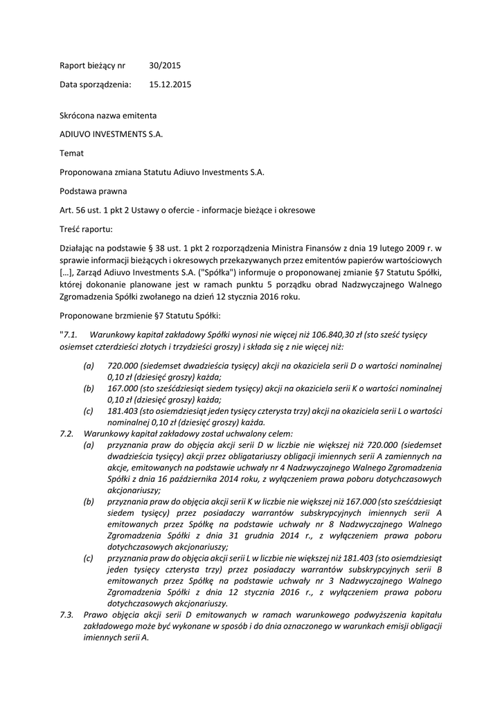 […], Zarząd Adiuvo Investments S.A. ("Spółka") informuje o proponowanej zmianie §7 Statutu Spółki,