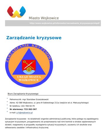Miasto Wojkowice http://www.wojkowice.pl/informator/zarzadzanie_kryzysowe/printpdf Zarządzanie kryzysowe Biuro Zarządzania Kryzysowego Pełnomocnik: mgr Stanisław Grzesiakowski Adres: 42-580 Wojkowice, ul. Jana III Sobieskiego 211a (wejście od ul. Makuszyńskiego) Nr telefonu: (32) 769-50-79 Nr alarmowy: 722-362-367 e-mail: [email protected] Zarządzanie kryzysowe - to działalność organów administracji publicznej, która polega na zapobieganiu sytuacjom kryzysowym, przygotowaniu do przejmowania nad nimi kontroli w drodze zaplanowanych działań, reagowaniu w przypadku wystąpienia sytuacji kryzysowych, usuwaniu ich skutków oraz odtwarzaniu zasobów i infrastruktury krytycznej Fazy zarządzania kryzysowego Zapobieganie czyli działania przyjmujące za cel główne działania uprzedzające eliminujące lub redukujące możliwości zaistnienia sytuacji kryzysowej. Zaliczamy do nich: Analizę zagrożeń i ocena wrażliwości; Wspieranie badań stosowanych i transferu technologii Uświadamianie społeczeństwa i powszechna edukacja w zakresie przeciwdziałania zagrożeniom Stworzenie systemu zachęt i restrykcji finansowych oraz właściwe wykorzystanie zasobów Zapewnienie przywództwa i koordynacji Zapobieganie odnosi się do działań, które eliminują lub redukują prawdopodobieństwo wystąpienia katastrofy, albo ograniczają jej skutki. Przygotowanie kluczowym elementem przygotowań jest opracowanie planów reagowania kryzysowego, które to plany opisują kto, co i kiedy będzie robił, za pomocą jakich sił i środków i na jakiej podstawie prawnej - przed, w czasie i natychmiast po zdarzeniu kryzysowym. Przygotowanie to także zapewnienie zasobów specjalistycznych sił i środków reagowania, takich jak: stanowisko kierowania, system łączności kryzysowej, system alarmowania oraz personel reagowania kryzysowego, a także ewidencja zasobów sił i środków przydatnych do reagowania kryzysowego. Reagowanie następuje po wystąpieniu realnego zagrożenia lub zdarzenia. Jego celem jest uruchomienie działań prewencyjnych zapobiegających lub minimalizujących możliwość zniszczeń, a po ich wystąpieniu, podjęcie akcji ratowniczej celem dostarczenia pomocy poszkodowanym i ograniczenia wtórnych szkód i strat. Faza reagowania wymaga: Przestrzegania dyscypliny obiegu informacji Gromadzenia informacji i dokumentowania działań Unikania działań nieprzemyślanych Profesjonalnej informacji (rzecznika) Prognozowania rozwoju wydarzeń Przewidywania skutków podejmowanych decyzji Uwzględniania implikacji prawnych decyzji Zagwarantowania funkcjonowania instytucji publicznych Odbudowa jest końcową fazą cyklu zarządzania kryzysowego. Odbudowę kontynuuje się, aż wszystkie systemy wrócą do stanu poprzedniego albo lepszego niż poprzedni. Odbudowę dzieli się na krótkoterminową i długoterminową. Krótkoterminowa polega na przywróceniu systemów niezbędnych do życia do minimalnych standardów operacyjnych. Odbudowa długoterminowa może trwać wiele lat, aż do kompletnej odbudowy całego obszaru dotkniętego katastrofą. Jednocześnie odbudowa ta powinna być realizowana w nowy sposób, tak aby rejon dotknięty katastrofą był po odbudowie mniej wrażliwy na kolejną katastrofę. Informacje Zasady postępowania w przypadku znalezienia niewypału lub niewybuchu Zasady postępowania z gniazdami os i szerszeni Sygnały alarmowe Nie dla czadu Pomoc bezdomnym Apel o niewypalanie traw Pierwsza pomoc w nagłych przypadkach Apel o nie wjeżdżanie na wały przeciwpowodziowe Powiadomienie o jakości powietrza w województwie śląskim
